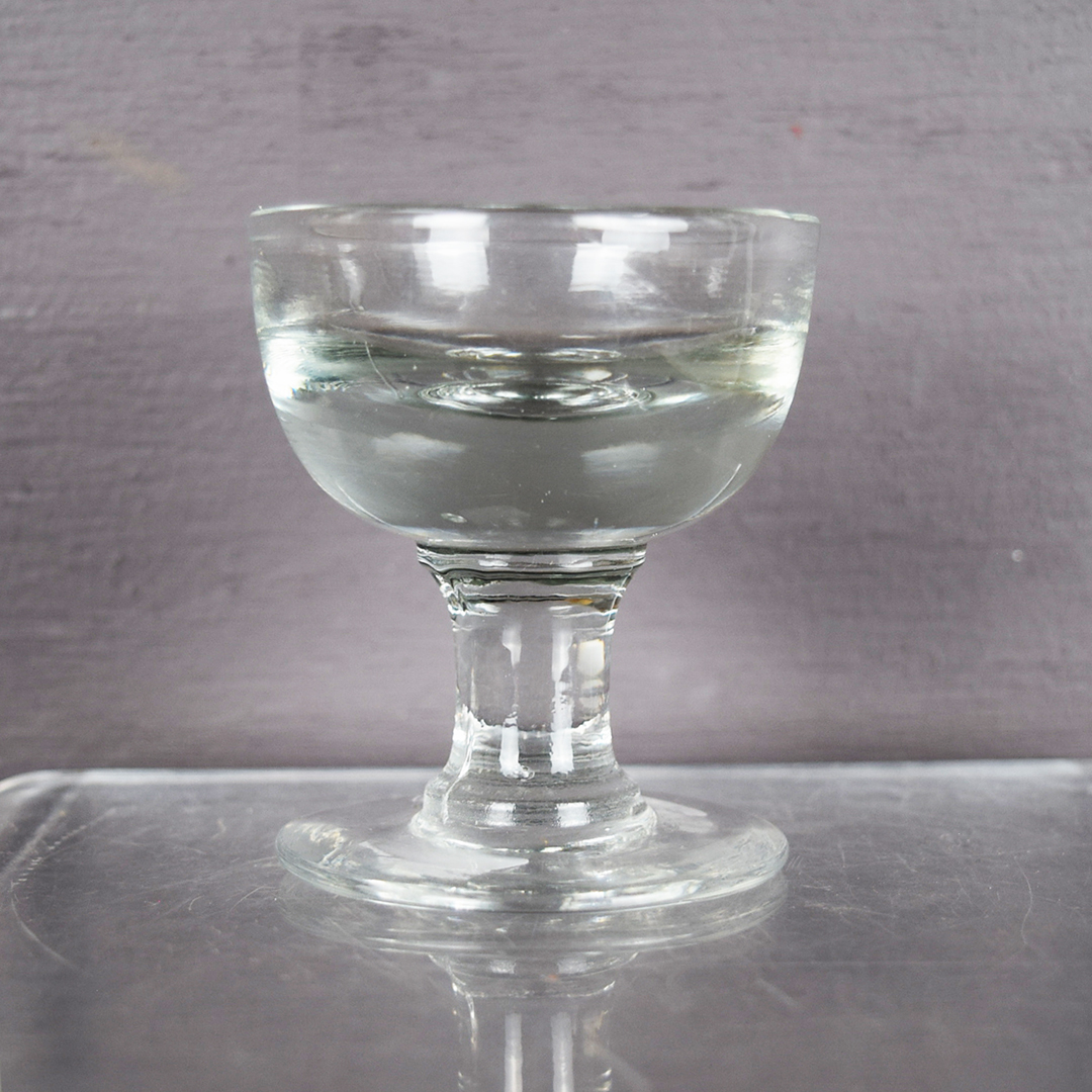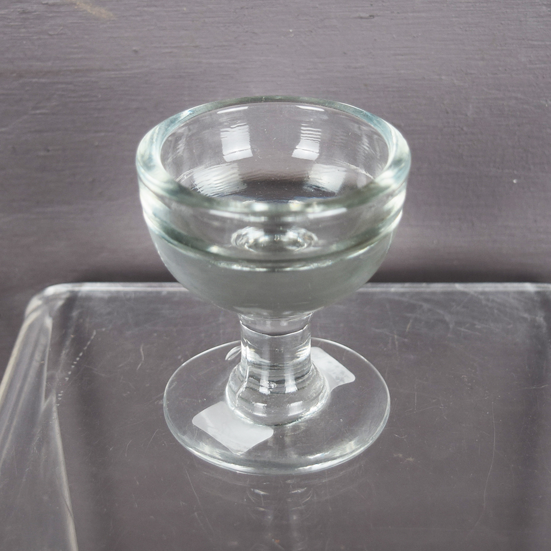 Originally used in London, England, this small glass was for customers who bought a penny’s worth of ice cream, ate it, and then licked the glass clean. The street salesman would rinse it in water, towel-dry it, and reuse it. Unsurprisingly, this unsanitary practice led to its ban in 1898. The glass’s thickness made the contents look larger, so customers felt they were getting more for their penny. This glass stands 3 inches tall, has a 2-inch round top, and remains in excellent condition. Mold marks are visible on the stem and inside the glass, along with minor imperfections, but, like other penny-lick glasses, it has no markings. 21498-TP