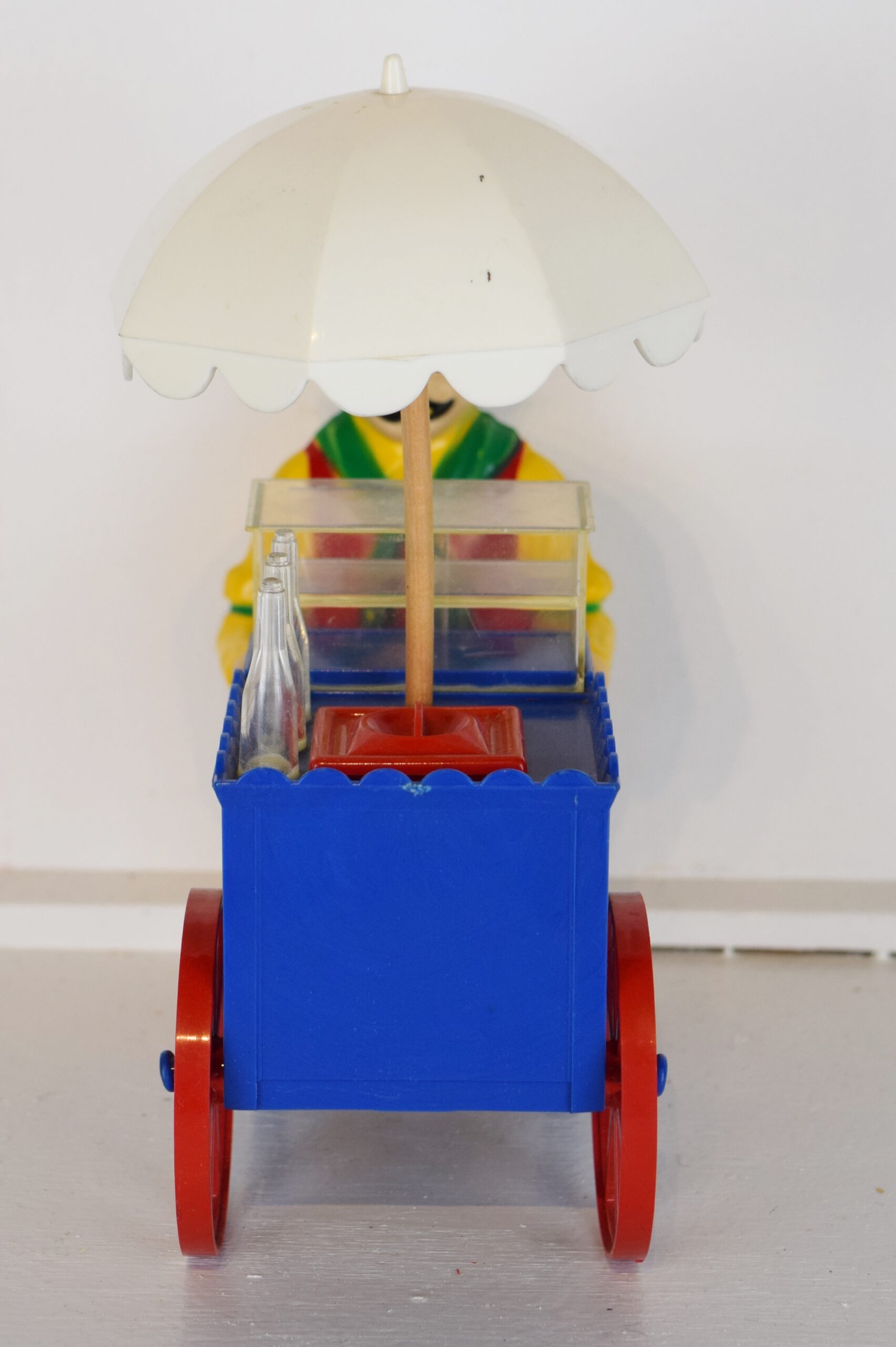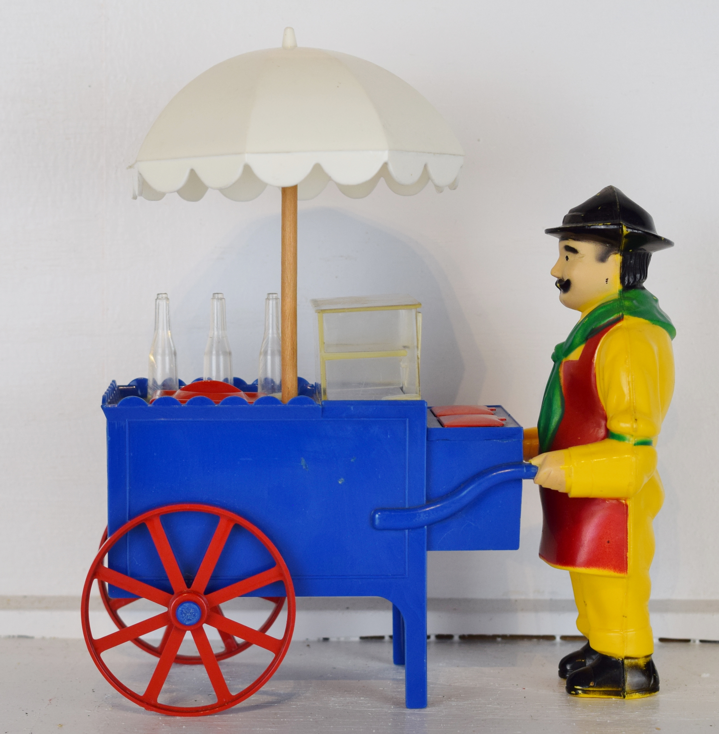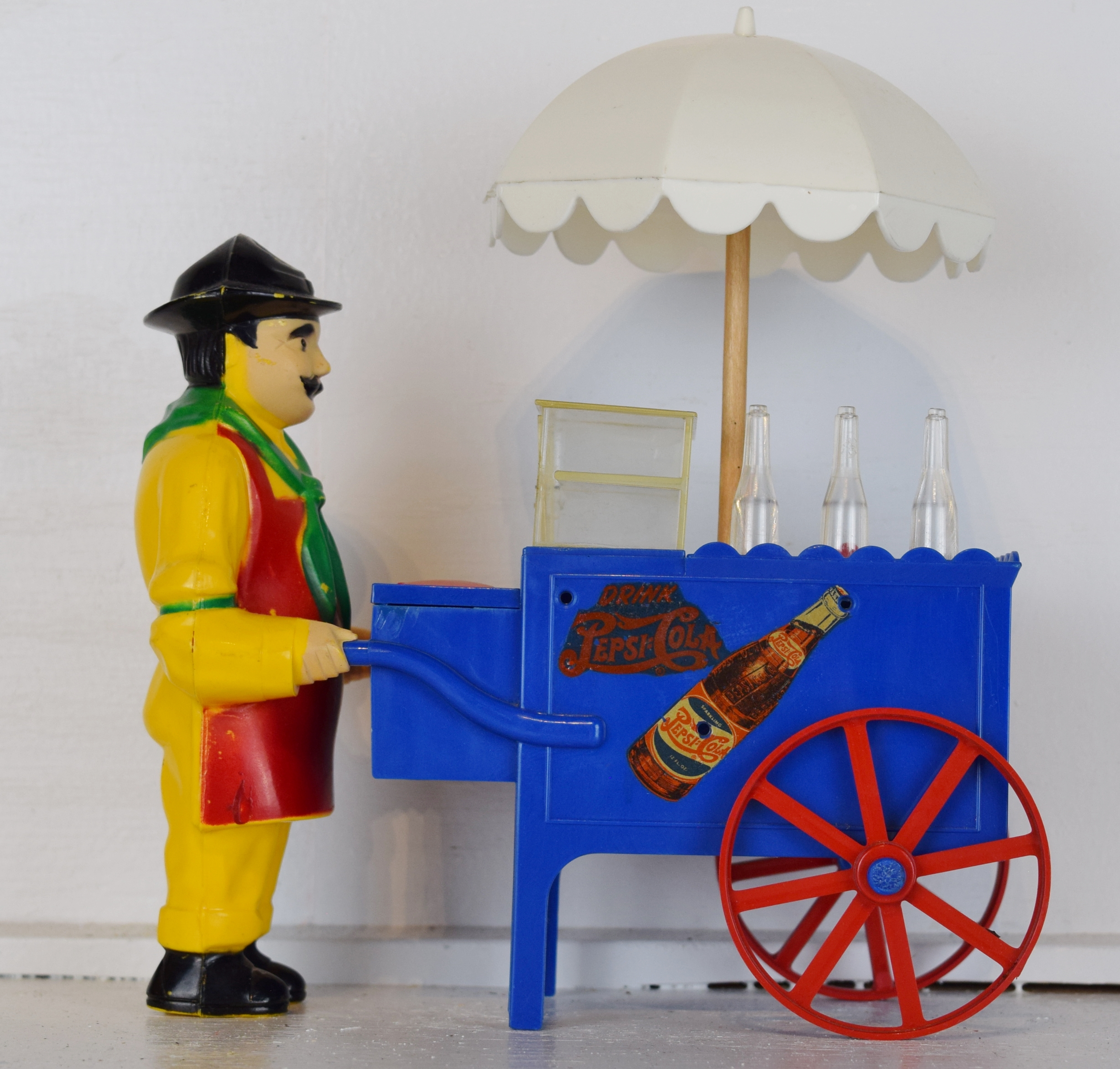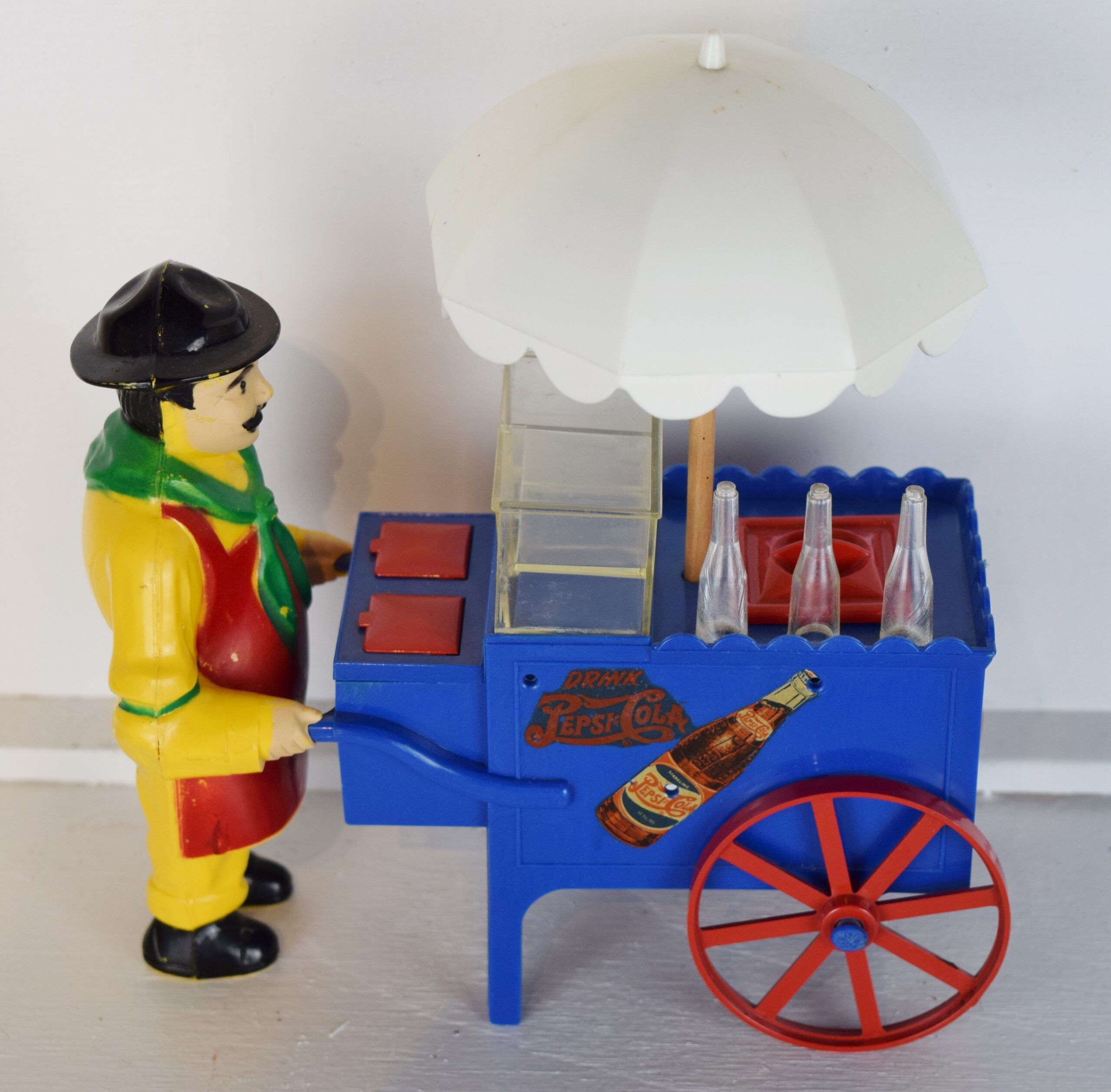 This great hot dog wagon is ready for you to display with your Pepsi-Cola collection! The wagon itself is molded in blue and has red wheels with a white umbrella. The salesman is bright and colorful with his yellow clothes, red scarf, red apron, and black hat. This Pepsi-Cola wagon was issued with a blue cart and white umbrella. “Drink Pepsi-Cola” script with a double dot bottle is on the side of the cart, and the small red lids in front of the salesman open up, plus the clear case door slides open. The toy appears to be in new old stock condition, it does not look like it ever has been played with and shows no wear at all. It measures eight inches tall by seven inches long. Super neat piece to add to your Pepsi collection! 18848-31OP