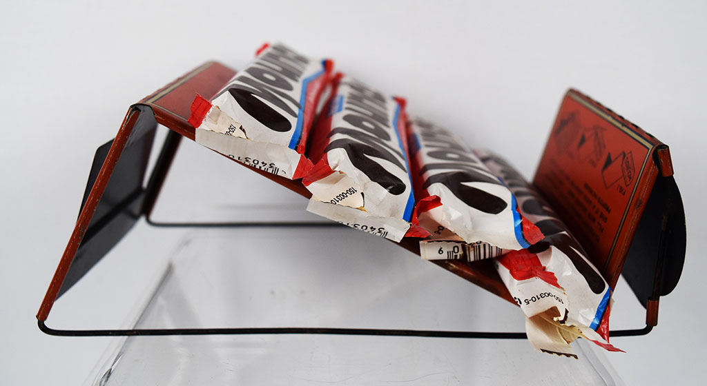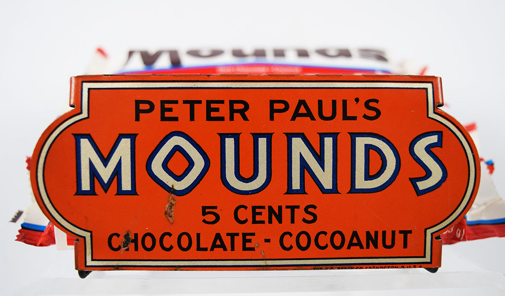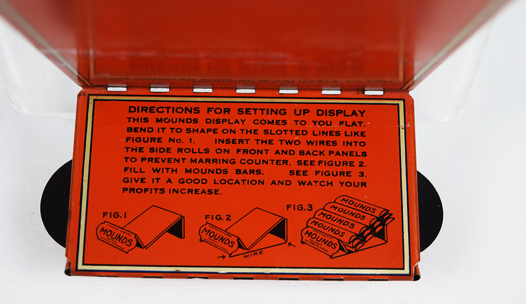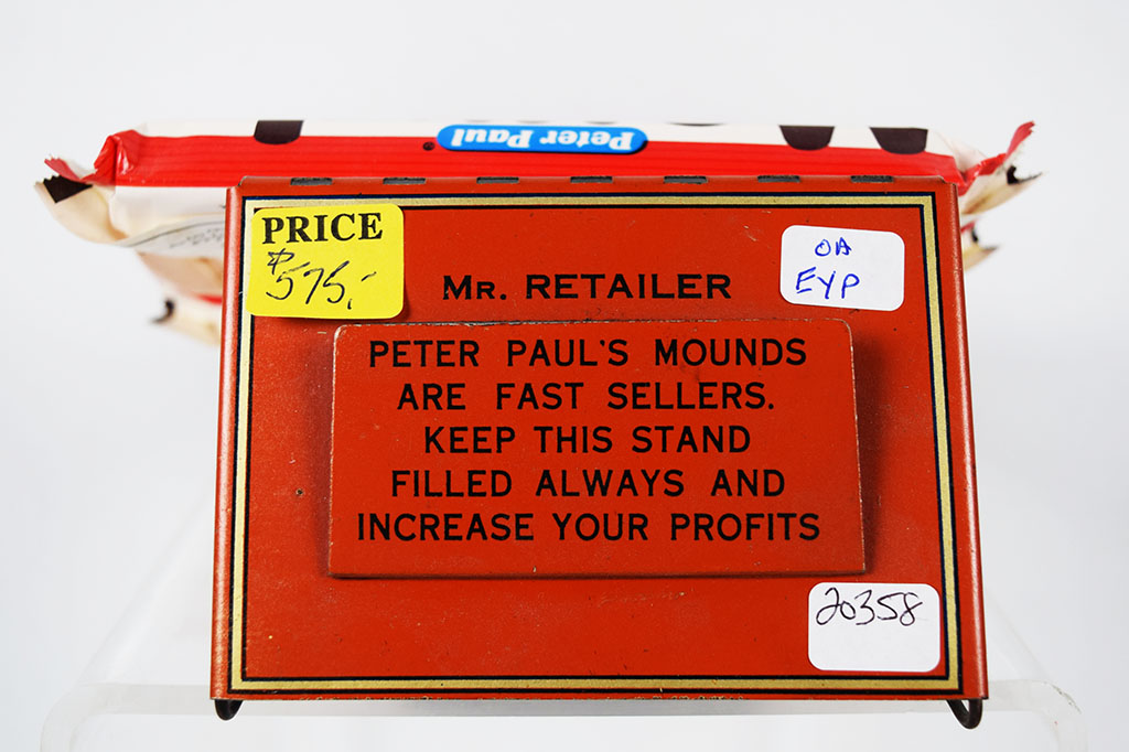 For anyone with a sweet tooth, this Mounds candy bar store display is a must have! Dating from the 1930’s, this metal and wire display allowed store owners to proudly display twelve enticing Mounds candy bars. The rack was shipped flat, and assembly instructions on how to bend it correctly for customers are printed on the rack itself. A small chip can be seen on the front of the die cut front sign, but other than that this piece is in amazing shape! Super hard to come across, this beauty is an eye-catcher! 20358-EYP