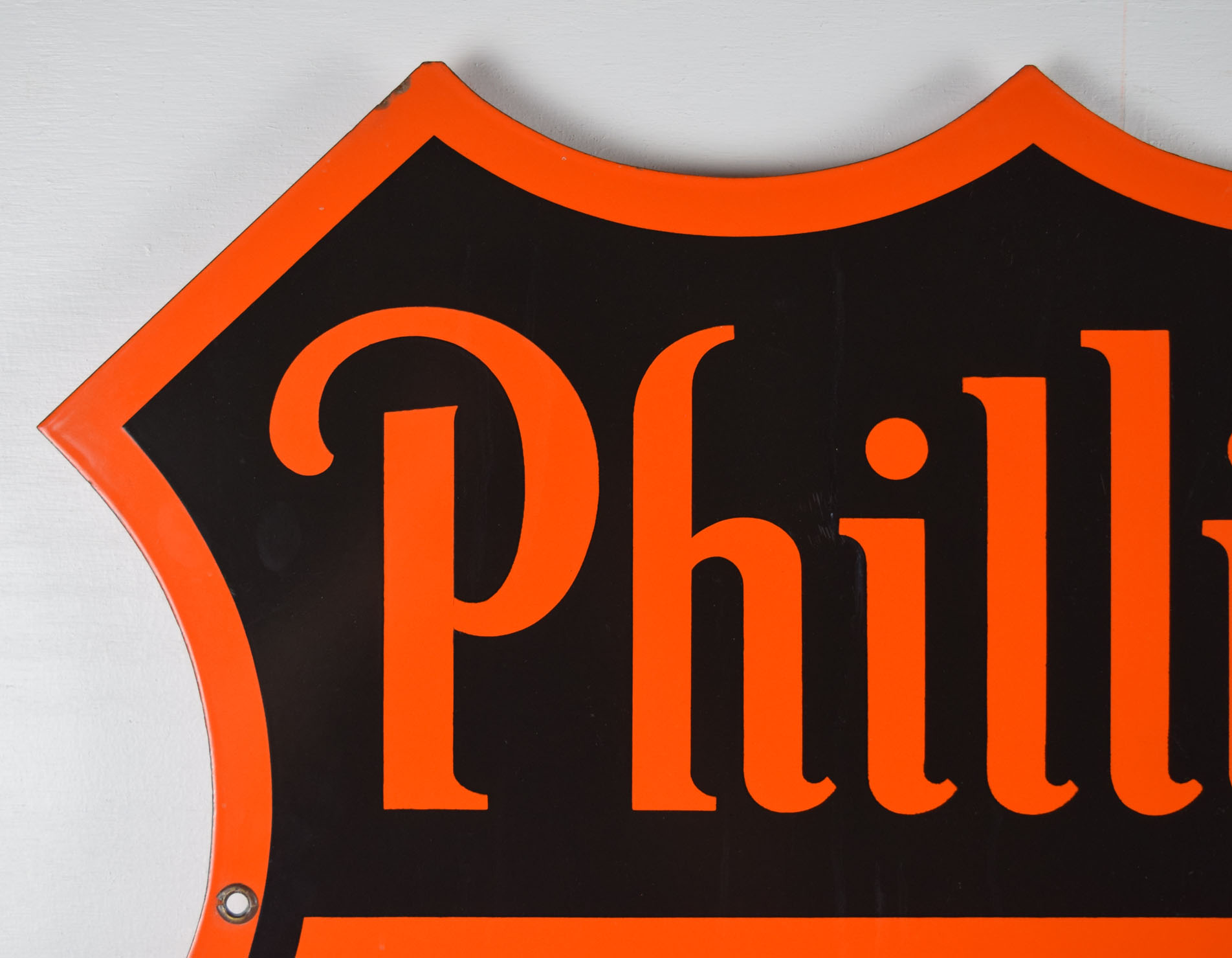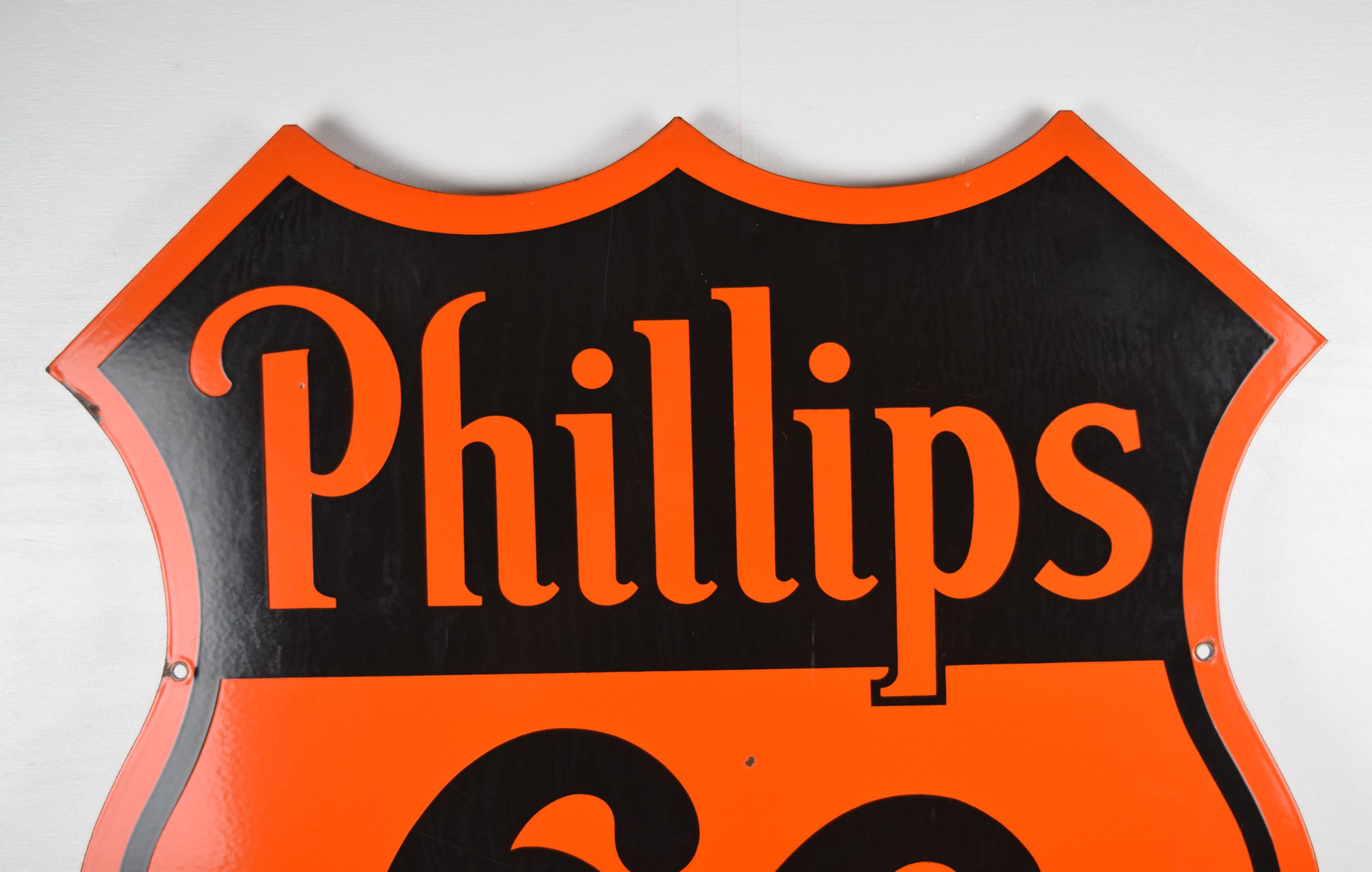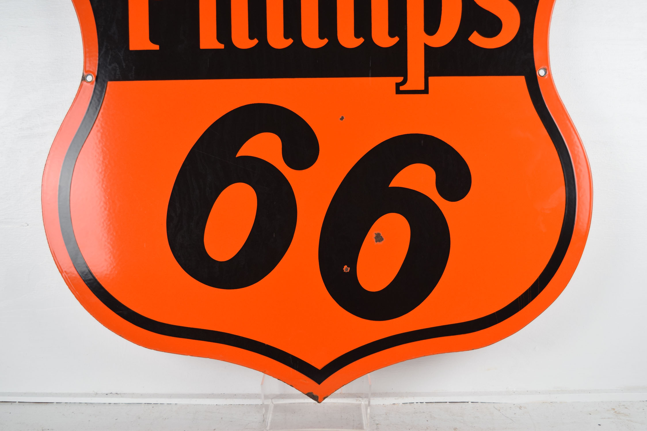 Colorful and bright, this double sided Phillips 66 sign is ready to add to your growing collection! It is die cut and dates from the early 1950’s with a slick porcelain finish on both sides. It measures just over twenty-nine inches top to bottom and side to side. Each side has some minor outer edge chipping with paint loss, along with a few nicks in the ’66’ area. One side has a larger chip than the other, with neither side having any touchup done. It is stamped “Veribrite Signs – Chicago” on the lower portion of one side. Lots of gloss and just the right size make this a great sign for your collection. 19868-WWPP