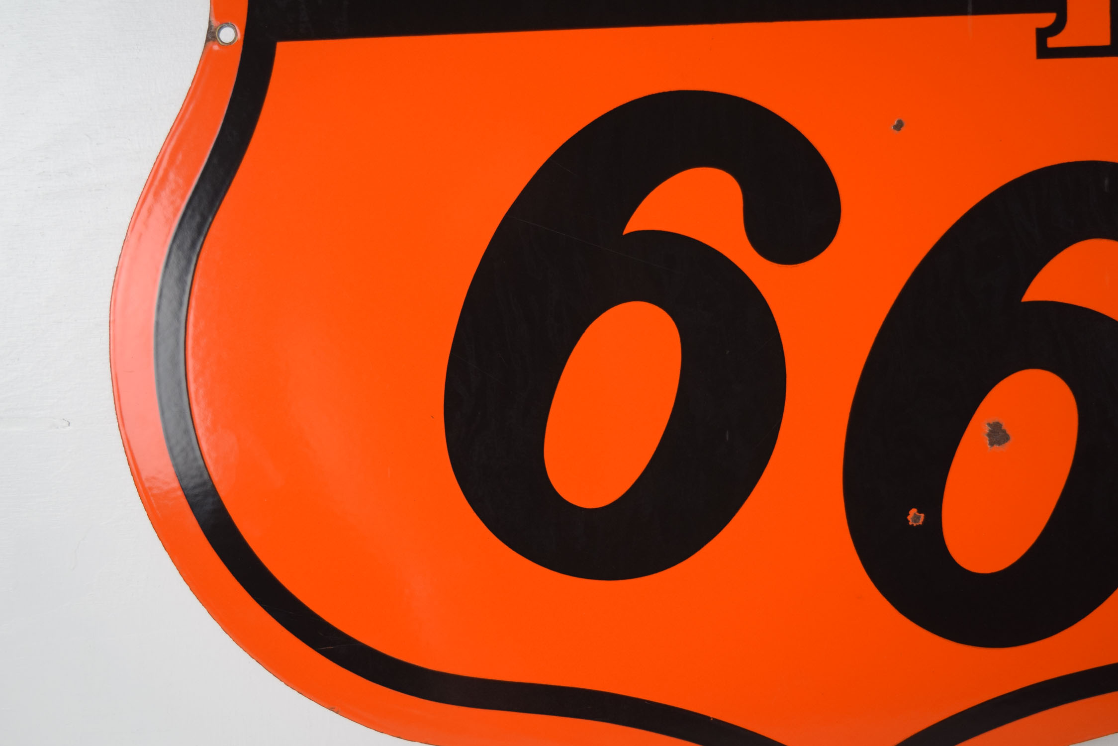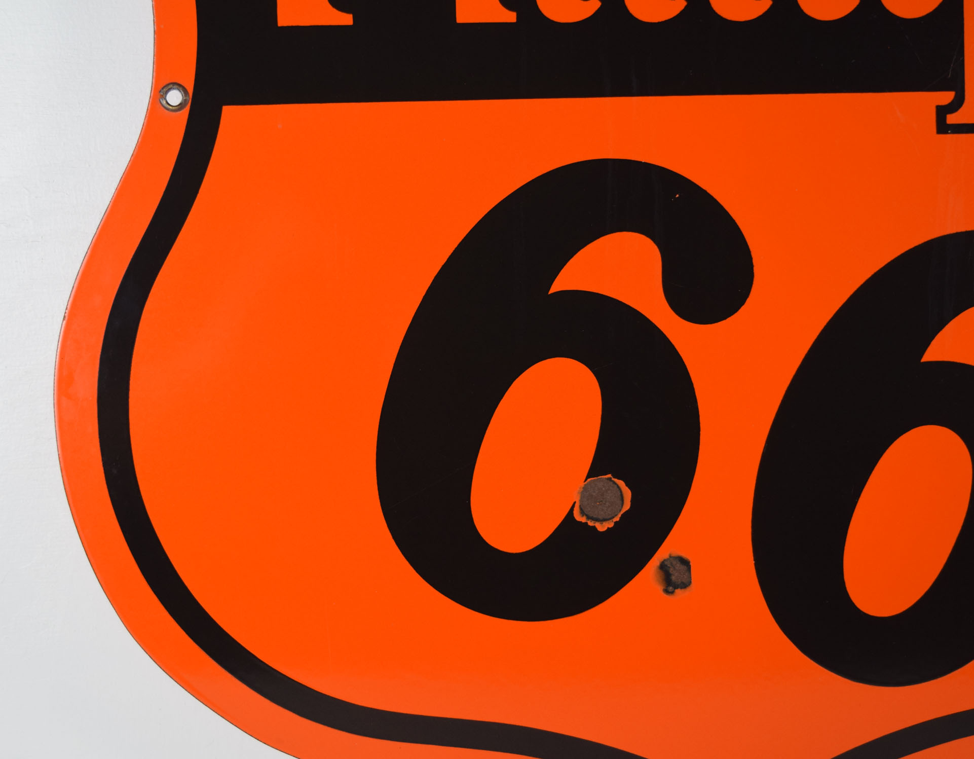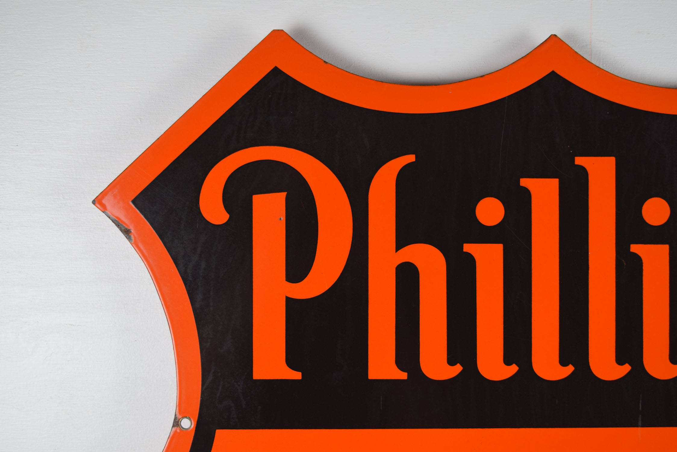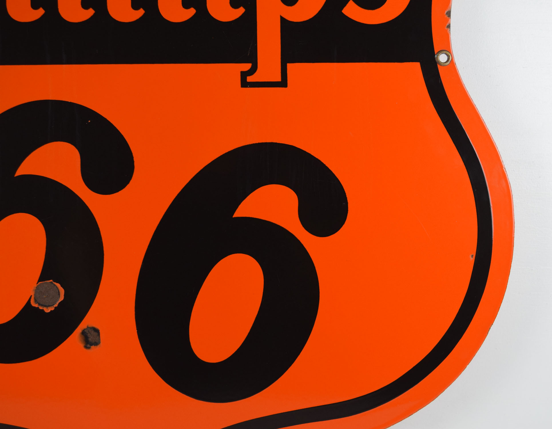 Colorful and bright, this double sided Phillips 66 sign is ready to add to your growing collection! It is die cut and dates from the early 1950’s with a slick porcelain finish on both sides. It measures just over twenty-nine inches top to bottom and side to side. Each side has some minor outer edge chipping with paint loss, along with a few nicks in the ’66’ area. One side has a larger chip than the other, with neither side having any touchup done. It is stamped “Veribrite Signs – Chicago” on the lower portion of one side. Lots of gloss and just the right size make this a great sign for your collection. 19868-WWPP