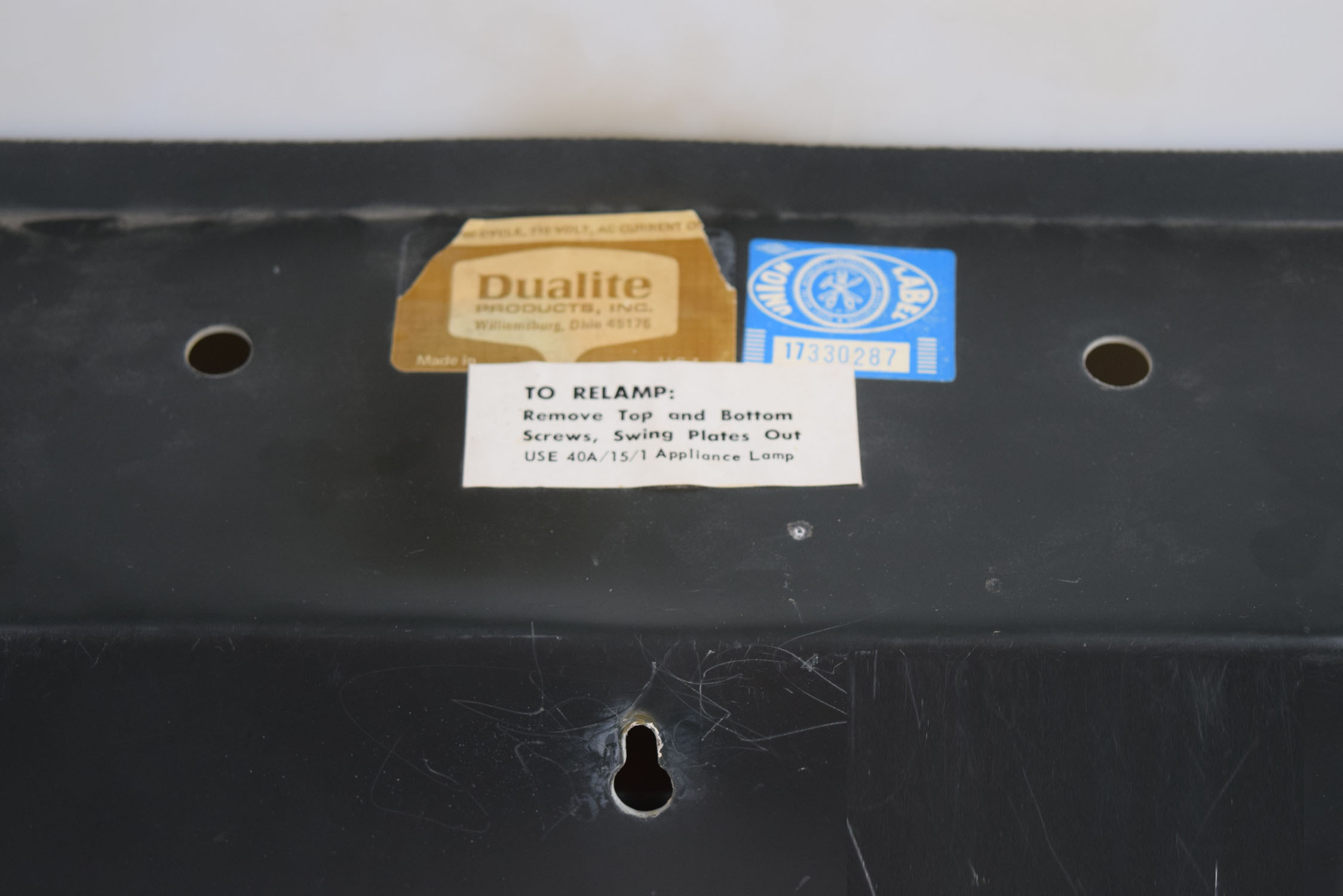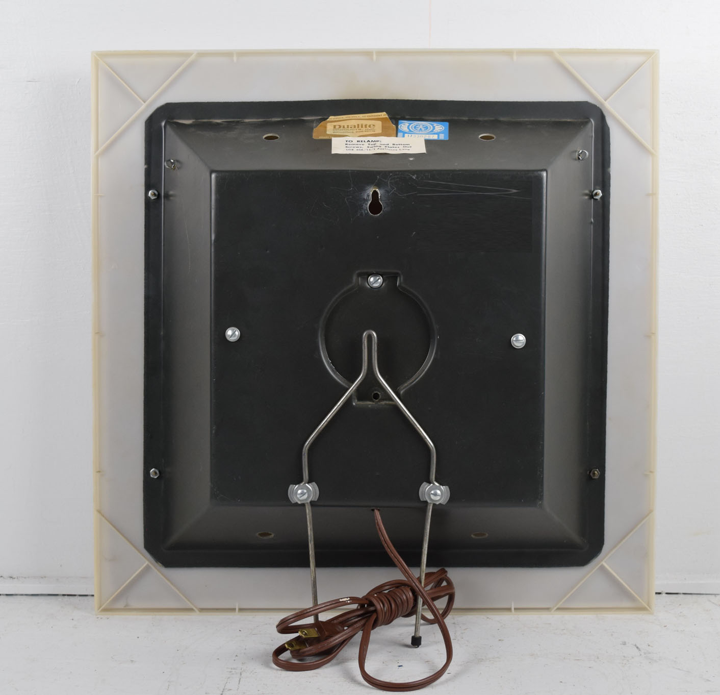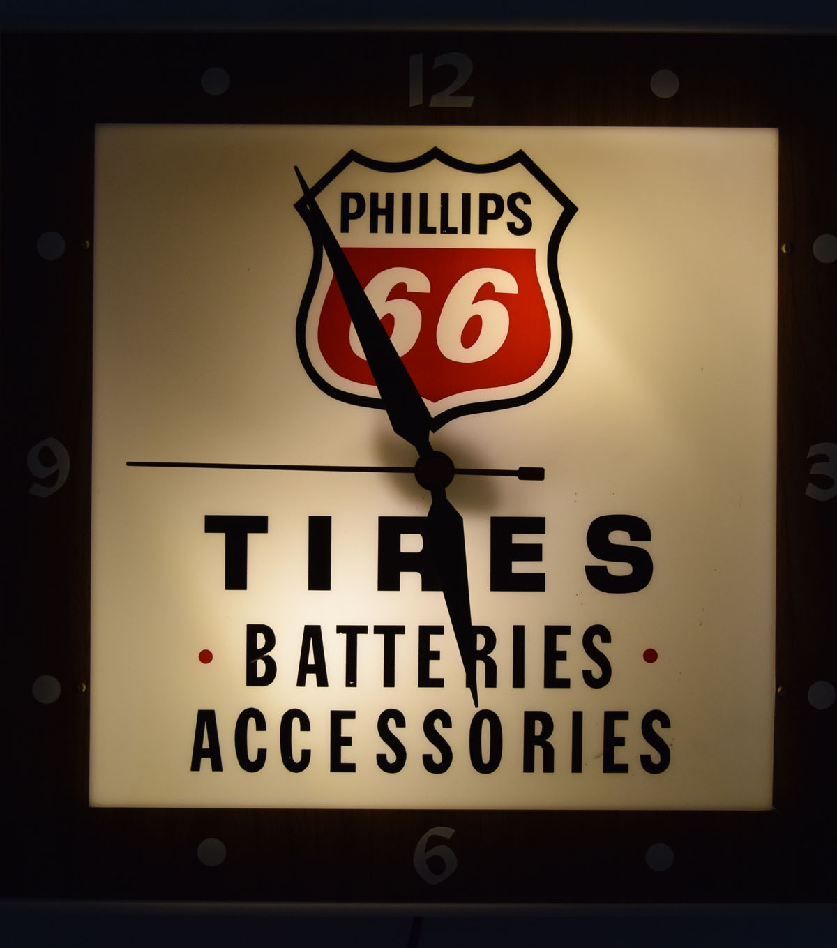 In amazing shape, this plastic Phillips 66 Gasoline clock would have hung in the service area of your local Phillips 66 station. It not only told you the time, but it let you know the service station also carried tires, batteries, and accessories for your vehicle. It is made of plastic with a light up face and wood grain trim around the outer edge. Made by Dualite Products, Inc. the clock can either be hung from the wall, or placed on a shelf with the metal bracket underneath. It works just like it should and it appears to be in new old stock shape, with some minor wear around the rear wall mounting hole. 19679-TTP