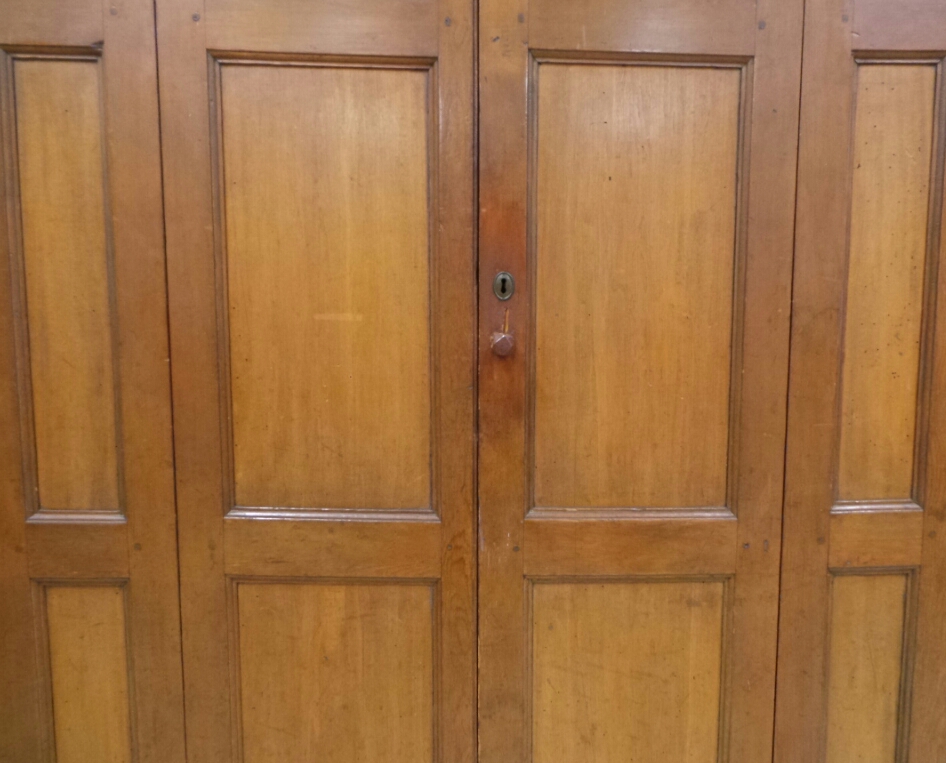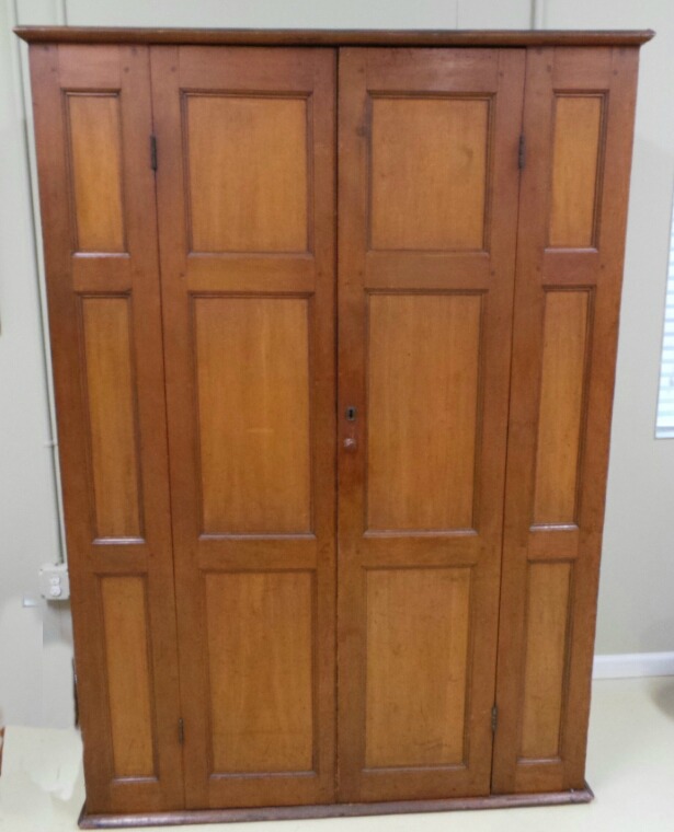 Here is a 19th century poplar and pine wardrobe with peg construction. It has paneled sides, front, and double doors. It has no feet or cornice, although it may have had both at one time. Inside are cast iron hooks and recently added shelves. The floor has an Eastlake cast iron pull and lifts to reveal a storage area. The wardrobe appears to date to the mid 19th century with the hooks and pull added in the 1880’s. This item can arrive at your door via U-Ship. It has been refinished at some point and measures 19”x 51”x 74”. Great store piece with hooks inside and door can be closed to hide your coats. 6225-EPP
