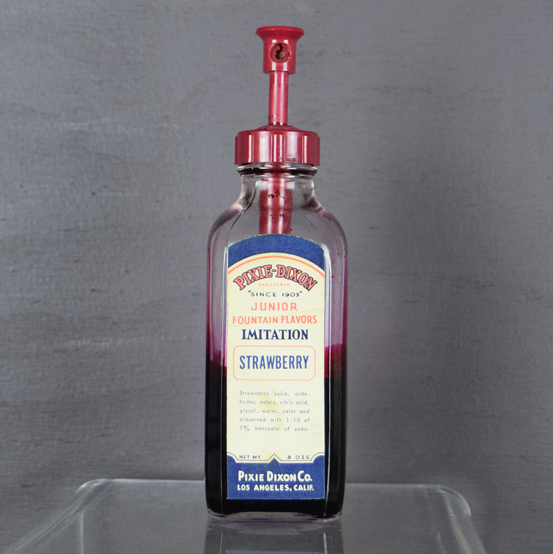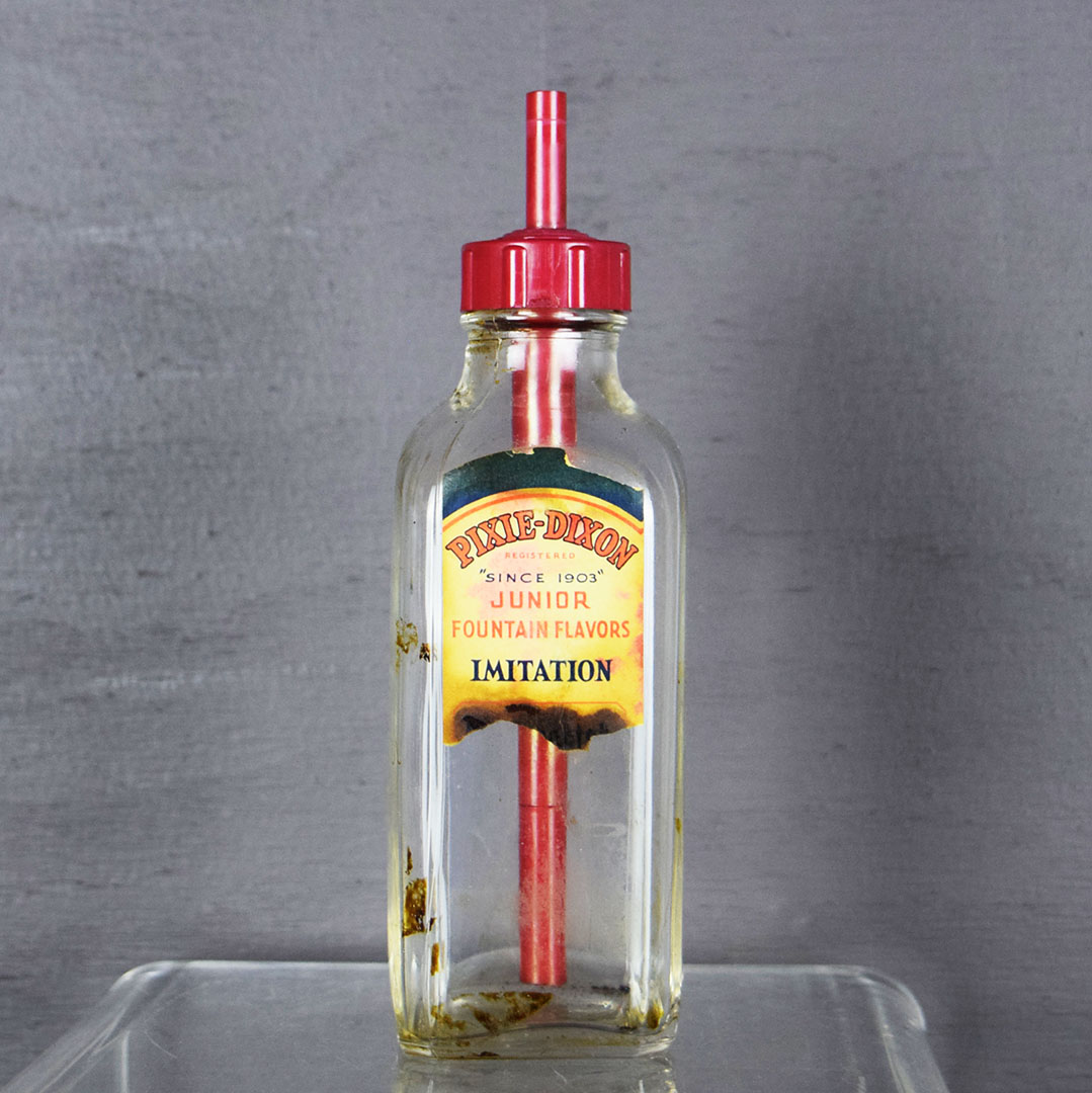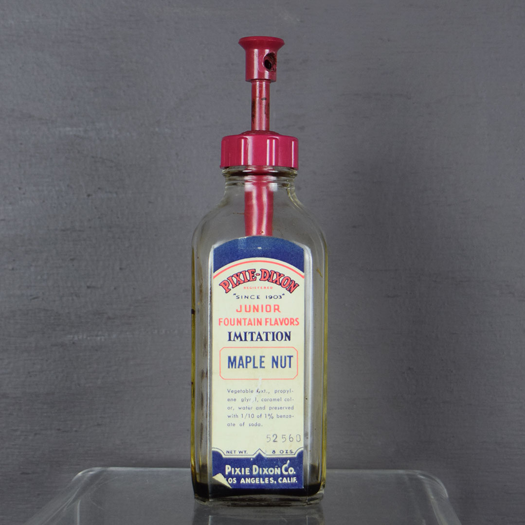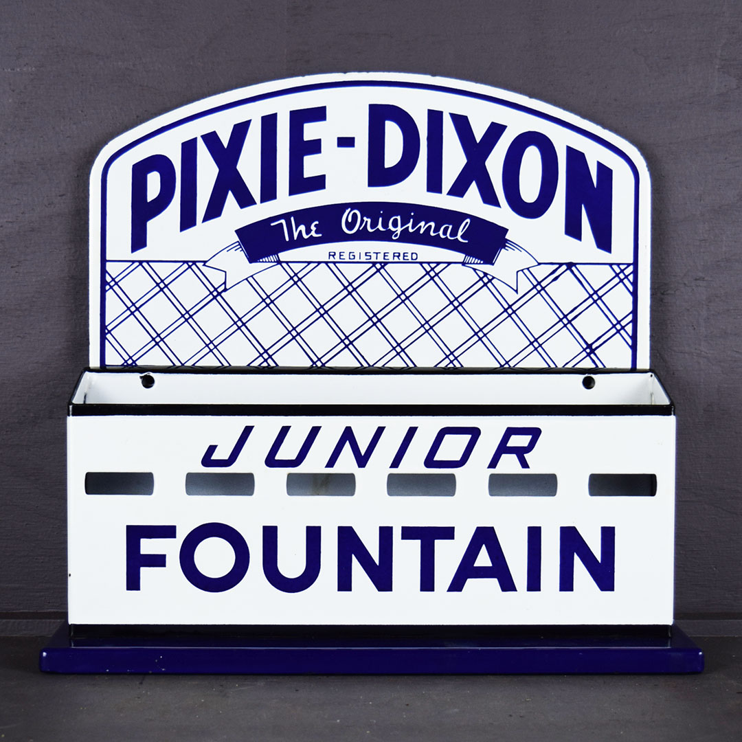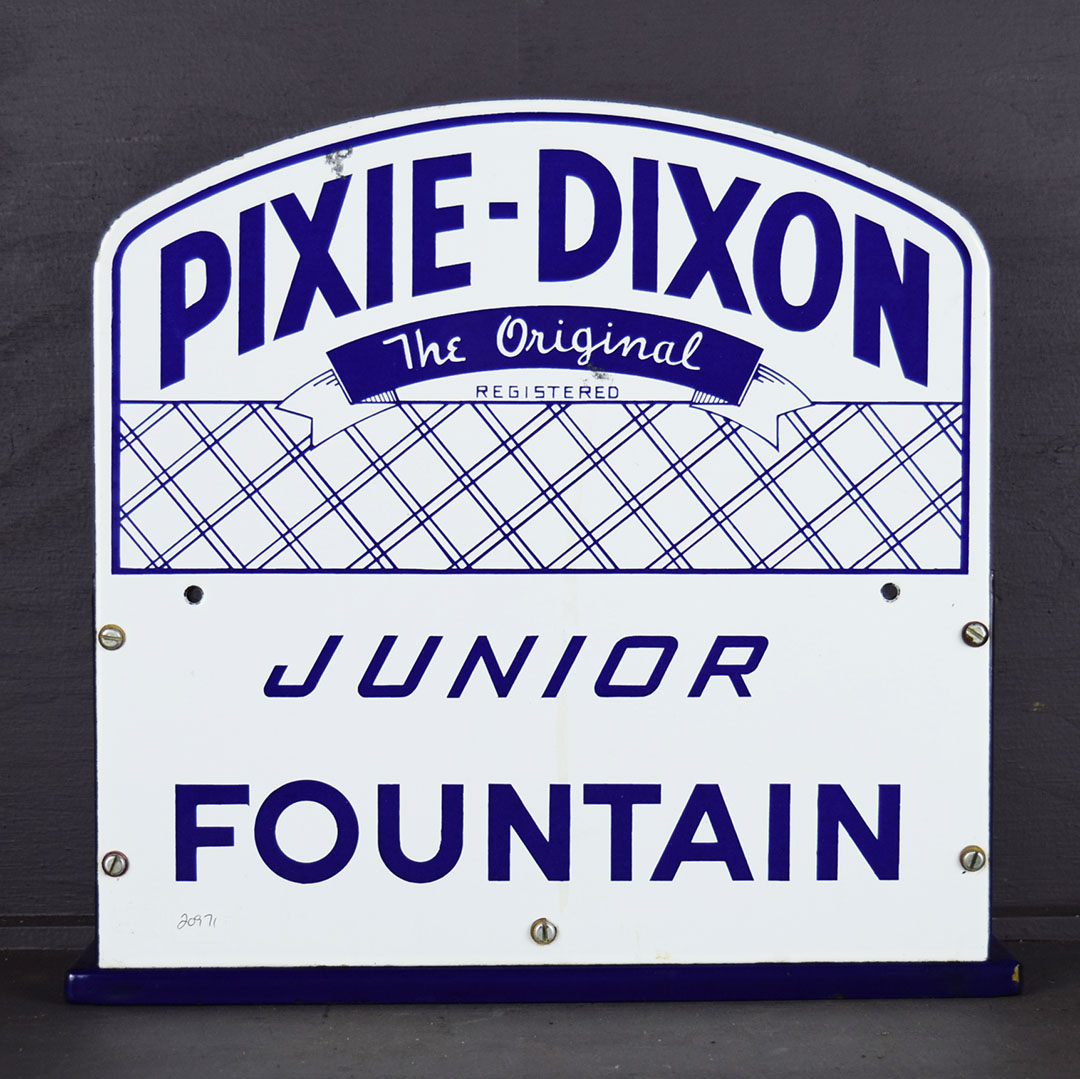 This adorable Pixie Dixon syrup dispenser dates from the 1940s and allows your local soda fountain jerk to add one of six syrups to your freshly made soda or add some flavor to your ice cream! The porcelain display features sharp colors with cutouts on the dispenser, allowing workers to see which flavors are available anytime. The square glass bottles feature paper labels on the front from the Pixie-Dixon factory in Los Angeles, California. Three bottles have plastic dispensers, and the others have metal screw-on caps. The paper labels have wear on them based on age and use. Some edge chipping around the outer edges and a small chip on the left corner are the only issues on the dispenser side of this rare piece. The back has some slight staining and two places in the porcelain finish on the top half of the back. It is a great display piece that will add a nice touch to your soda fountain! 20971-QQTT