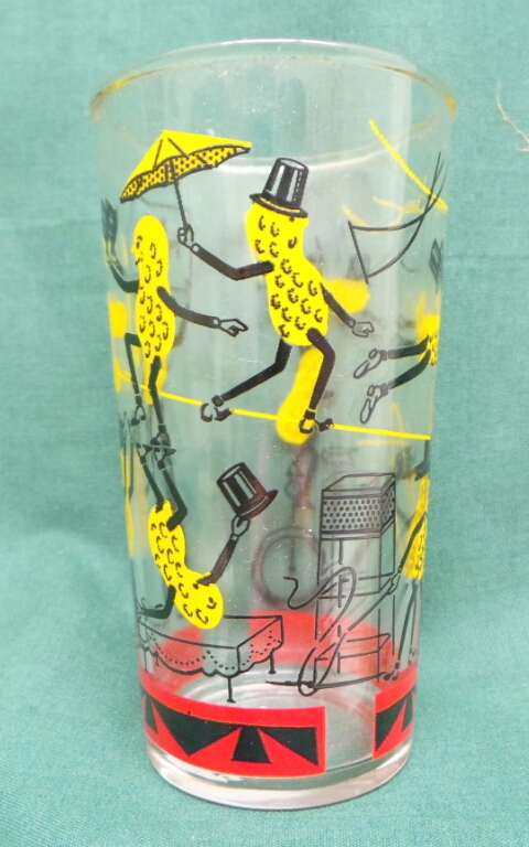 Circa 1950’s Planters Drinking Glass with images of Mr. Peanut juggling, doing acrobatics, walking a tight rope, etc. There are two different versions of this drinking glasses. These were available for sale in the Planters Stores in the 1950’s. It is in near mint condition. 6285-01TP
