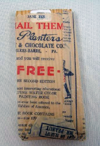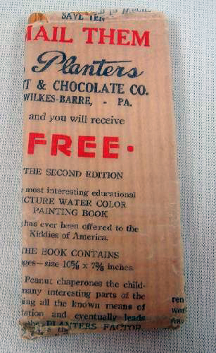 Check out this scarce 1930s Planters Peanut Jumbo Block candy bar wrapper with the wax paper inner liner. There is an image of Mr. Peanut on the top and an inset on the back with a comparison of food value in calories between peanuts and bread, eggs, beef, and milk. Peanuts win hands down two to seven times as many calories as the other listed items. It states that the bar “is 70% peanuts.” The inner wrapper offers a free paint book for ten wrappers. The wrapper is in fair condition, with heavy discoloration and fading, edge wear, and a 2″ tear. 13180-21TP