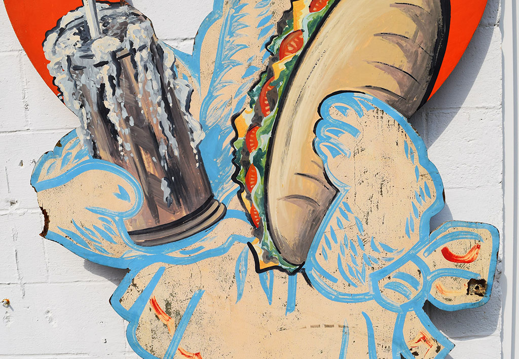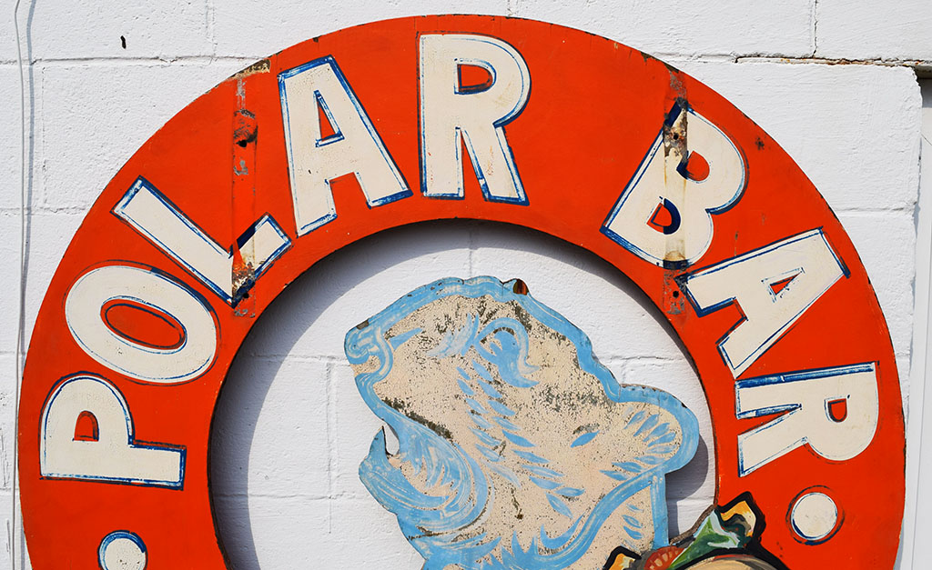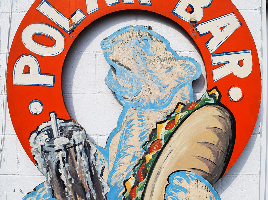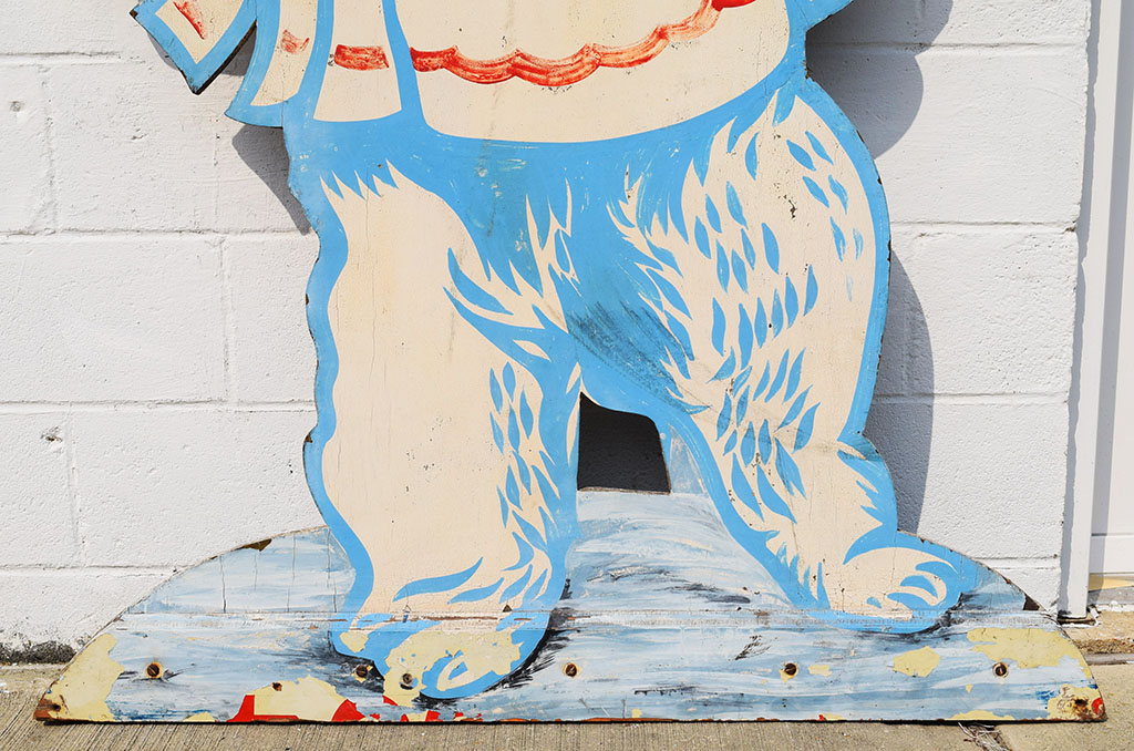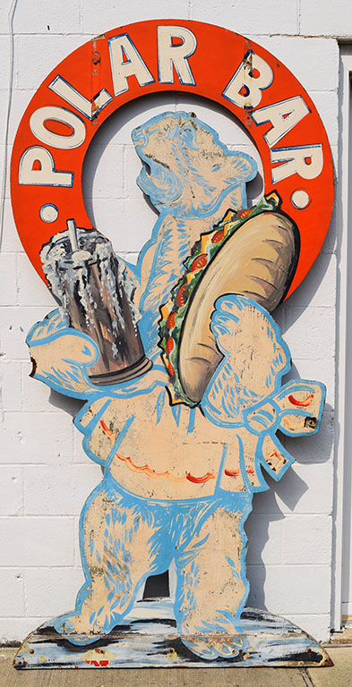 Starting in 1948, the Polar Bar was the local hangout near downtown Salisbury, Maryland, and by the time it closed fifty years later, it was a landmark. This sign was the original double sided sign that was mounted to the roof, so customers could see it easily while driving down Main street. It stands ninety-six inches tall by forty-eight inches wide, and is made of wood. The sign is die cut and features a polar bear holding a sub in one arm and a fountain soda in the other. Some minor damage can be seen on the outer edges, along with some paint wear from being outside for years. Super cool piece that does require a 3rd party shipper. Please contact us for more information. 20161-YPP