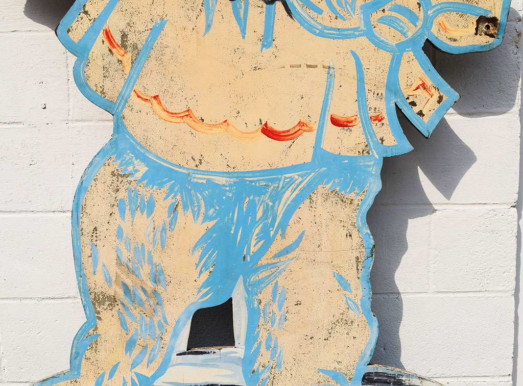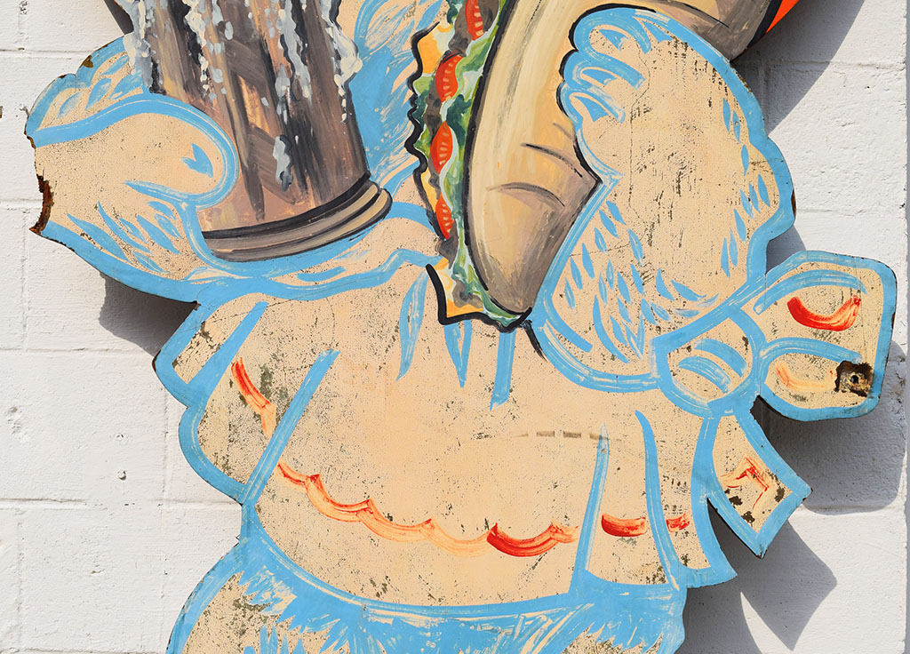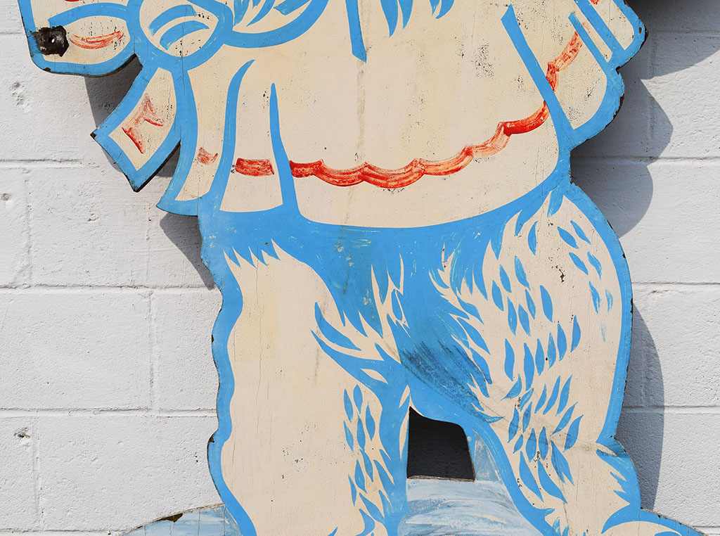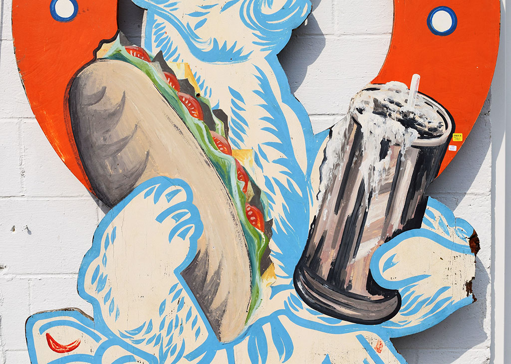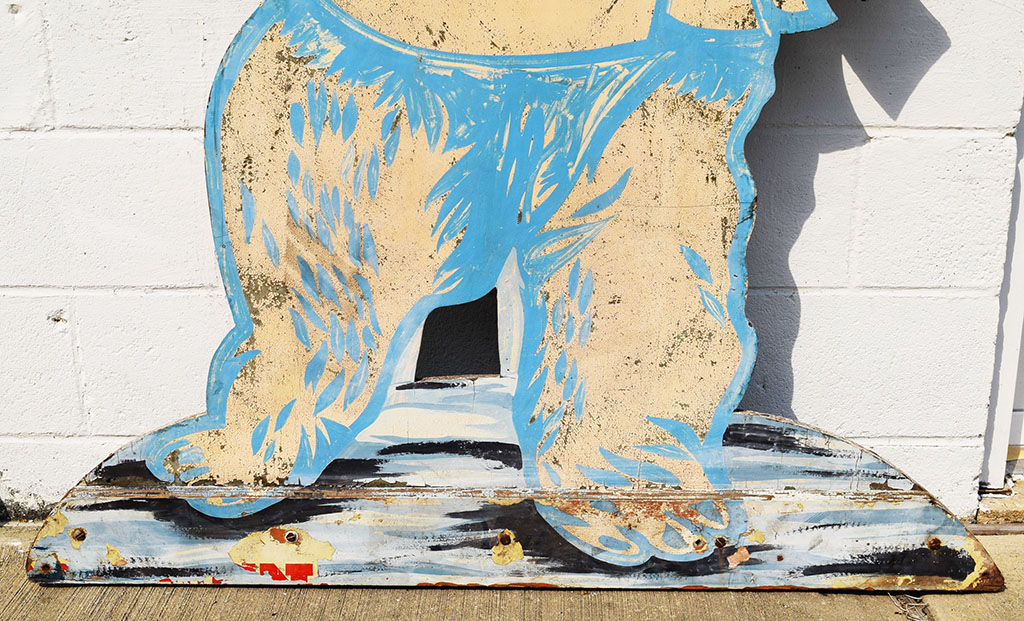 Starting in 1948, the Polar Bar was the local hangout near downtown Salisbury, Maryland, and by the time it closed fifty years later, it was a landmark. This sign was the original double sided sign that was mounted to the roof, so customers could see it easily while driving down Main street. It stands ninety-six inches tall by forty-eight inches wide, and is made of wood. The sign is die cut and features a polar bear holding a sub in one arm and a fountain soda in the other. Some minor damage can be seen on the outer edges, along with some paint wear from being outside for years. Super cool piece that does require a 3rd party shipper. Please contact us for more information. 20161-YPP