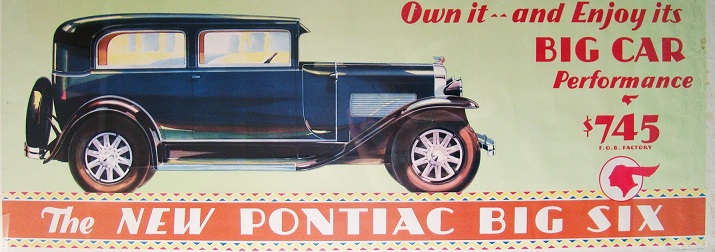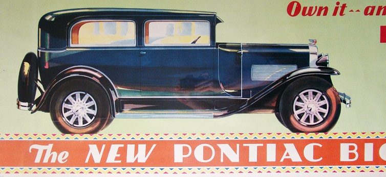 This rare colorful paper poster has a beautiful image of a 1929 Pontiac two door sedan on a light green background with a red, yellow, and blue trimmed brown band below it inscribed “The New Pontiac Big Six”. In the upper right corner in red lettering it is inscribed Own it..and enjoy its Big Car Performance $745 f.o.b. factory. Included is what appears to be its original shipping tube from the Chevrolet Central Office in Detroit to H. F. Haller in Litchfield, NE. He may have been a dealer. The poster measures 20 inches tall by 51 inches wide and is in excellent condition with some water staining and tearing on the right edge. It has been framed for protection. This is an oversized shippable item. Please contact us for shipping quote. 13632-31QQPP