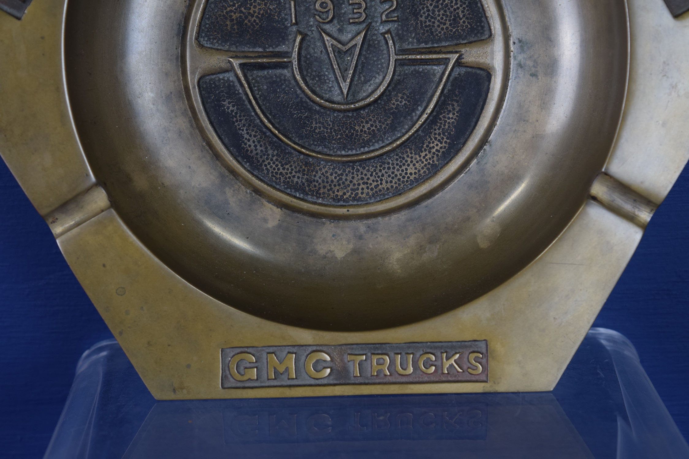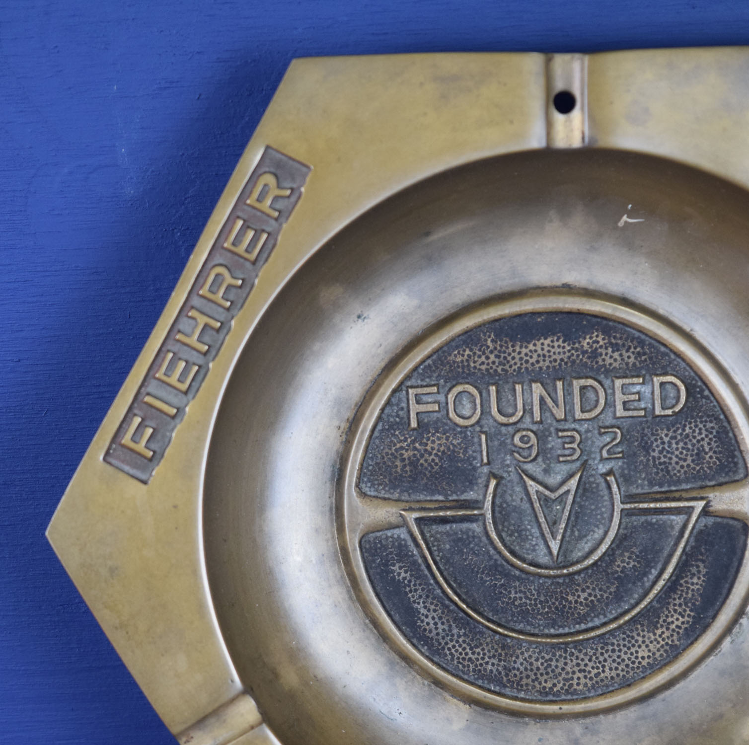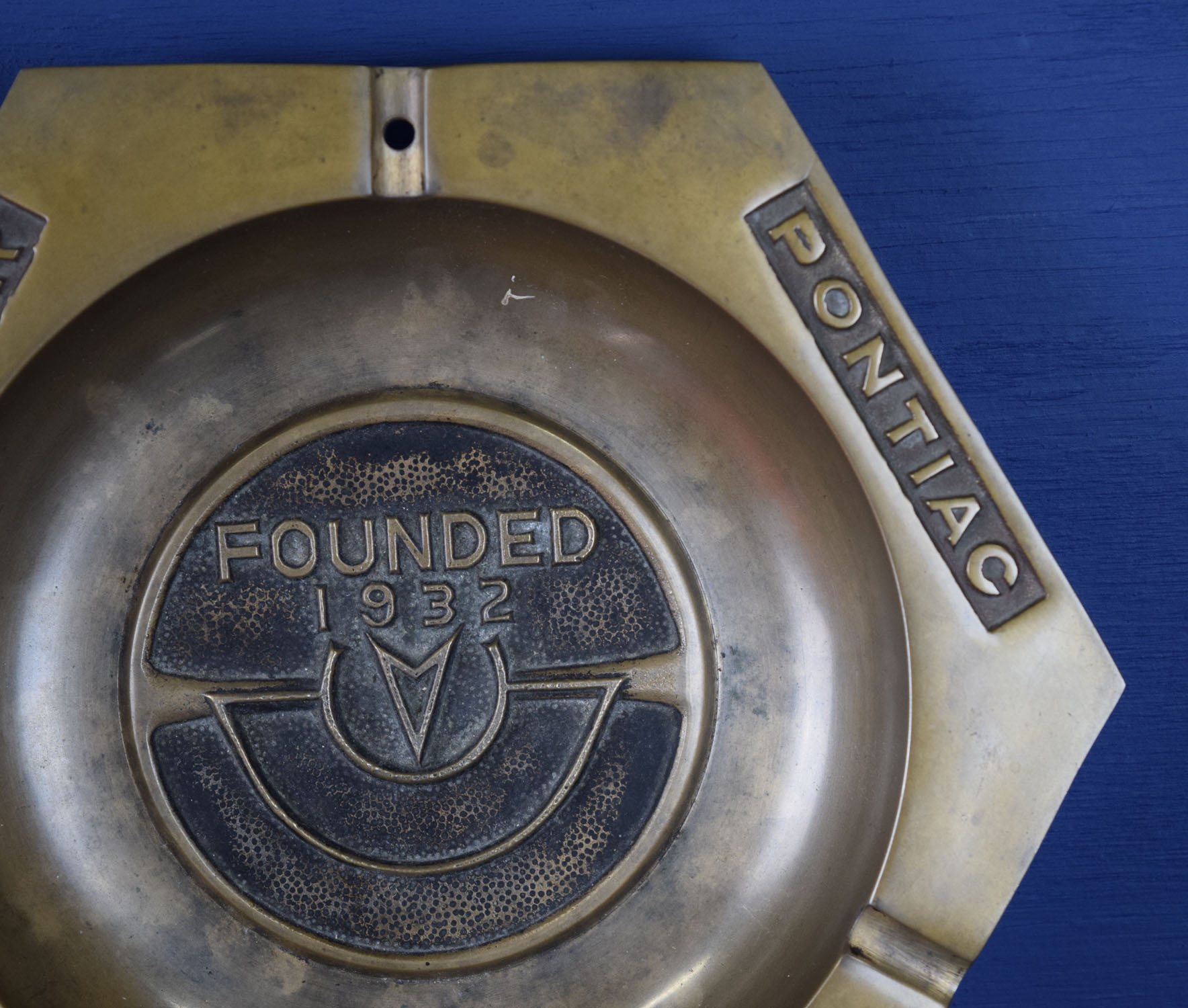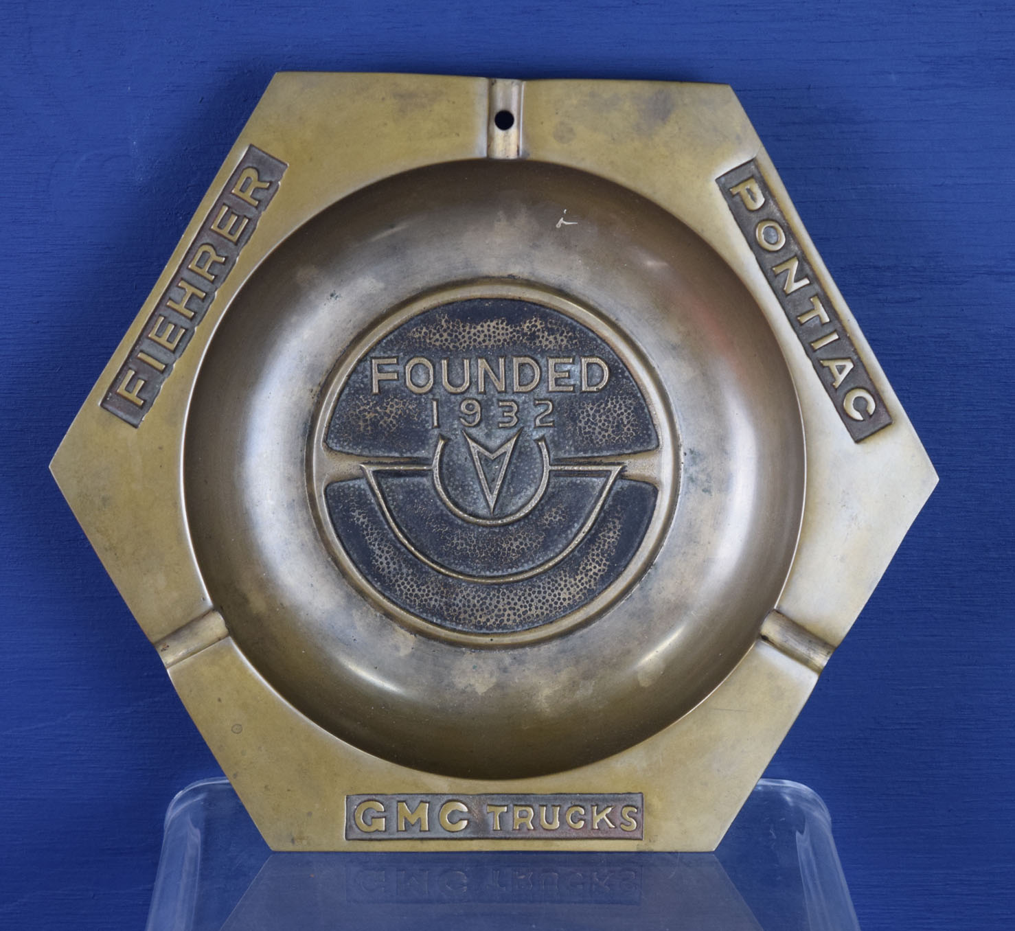 Sixty years ago everyone smoked, especially car salesman, so this vintage brass ashtray was right at home in the Fiehrer Pontiac GMC dealership. The outer edge names are embossed, as is the center section, which reads “Founded 1932” of this brass piece of automotive history. The dealership is located in Hamilton, Ohio and still operates today! It measures eight and a half inches across, and is a six sided hexagon shape. The brass looks amazing for it’s age, and looks to have been used very lightly. 19422-QPP