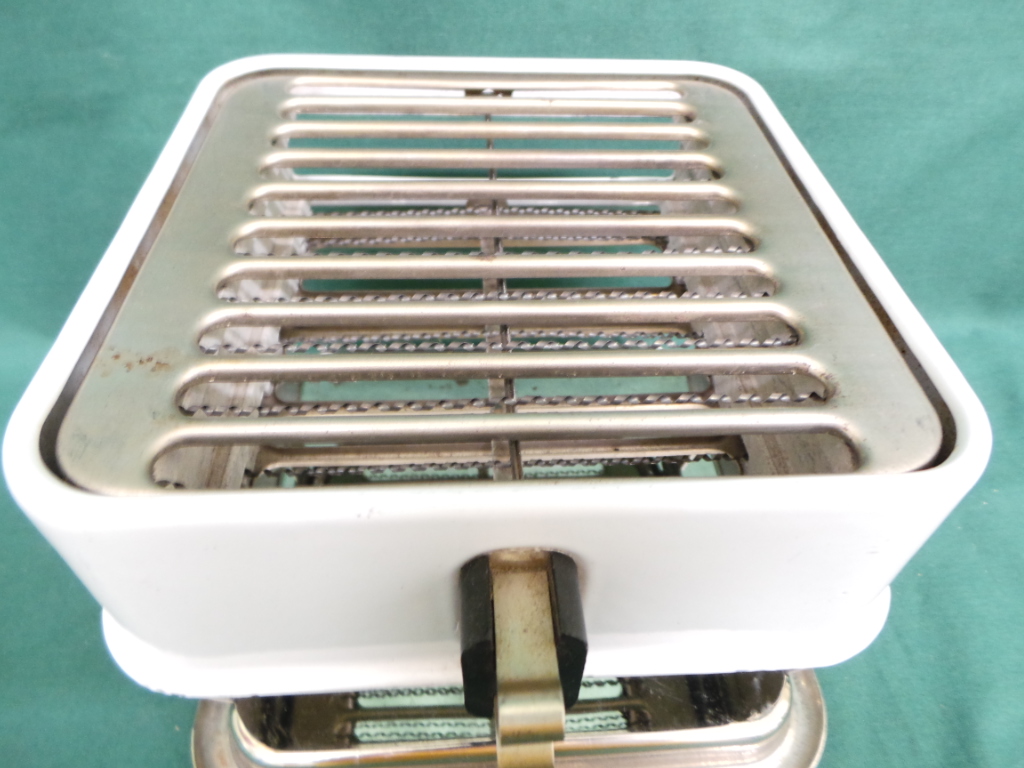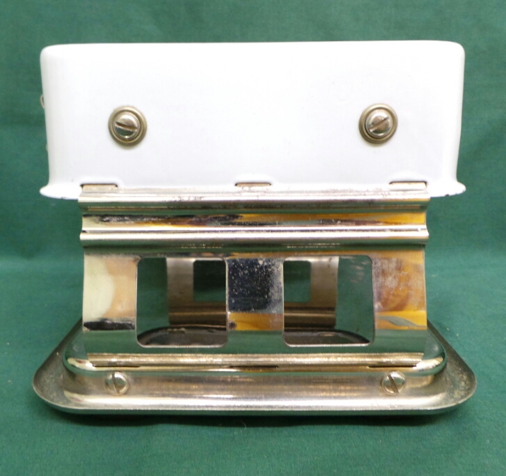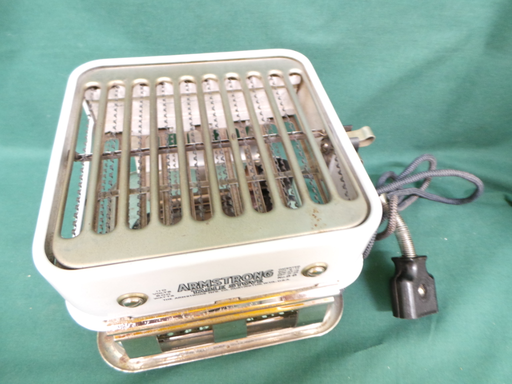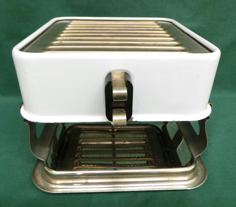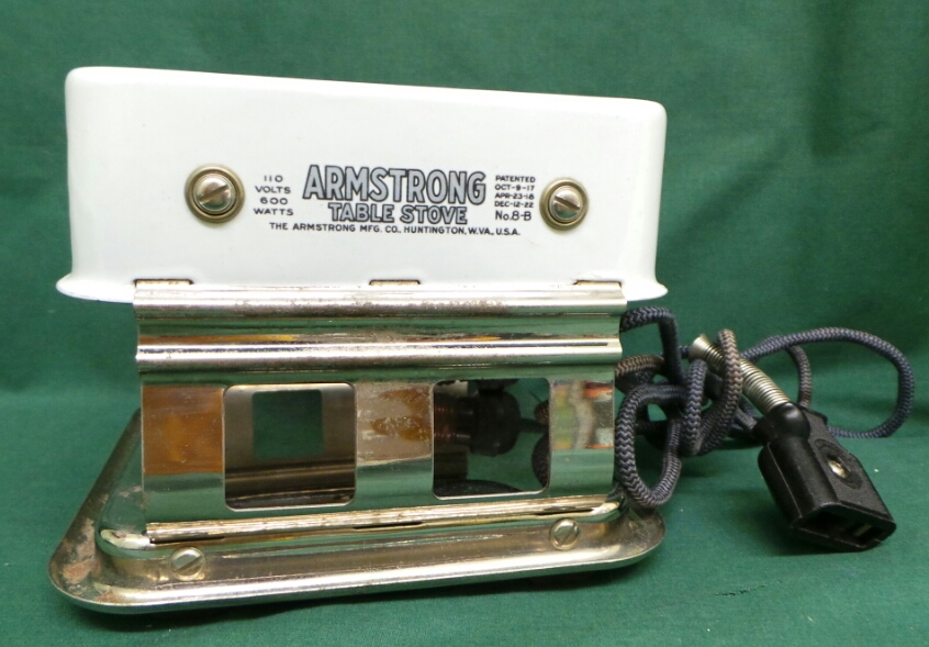The Armstrong Table Stove dates from the 1920’s and is a great decorative piece for a retro kitchen. It has a porcelain body mounted onto a chrome plated base and is more than just a hot plate. It has two rows of elements and can act as a broiler, and oven, and a stove top. Originally it came with a long handled baking pan, open broiler rack, and griddle. It is in excellent working condition with one small chip in the porcelain and a little peeling chrome. It measures six inches tall by eight inches square and includes an original detachable power cord. 9876-51WT