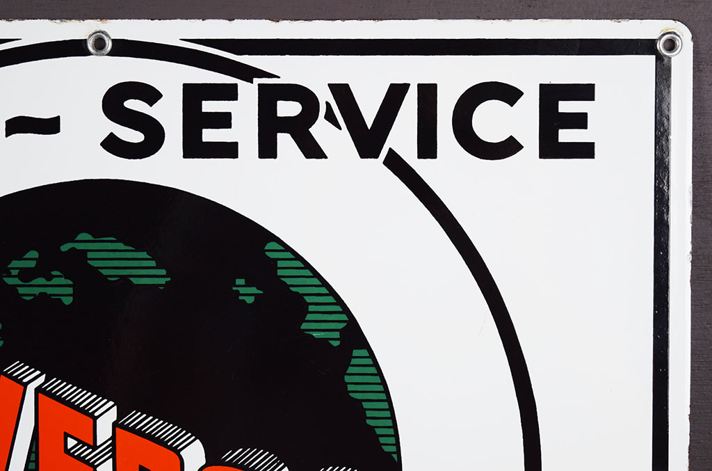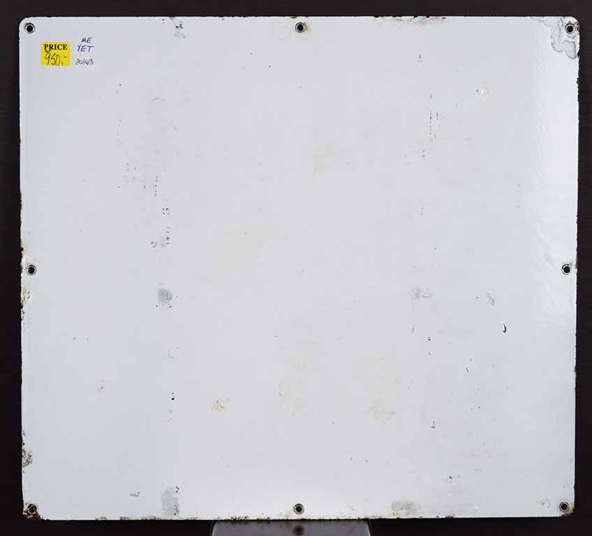 This great looking single sided porcelain sign measures eighteen inches wide by just over sixteen inches tall. The outer corners are slightly rounded with eight original aluminum grommets. Some minor chipping can be seen around the outer edges, with one small chip in the lower right area of the porcelain face. This chip has been touched up so it is not prevalent. Don’t miss your opportunity to own this rare beauty! 20263-YET