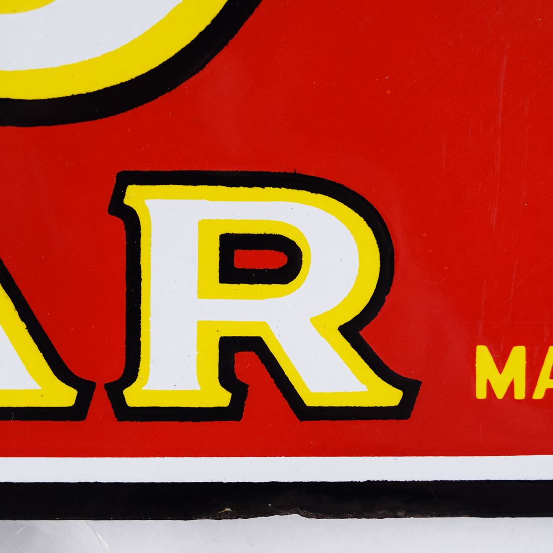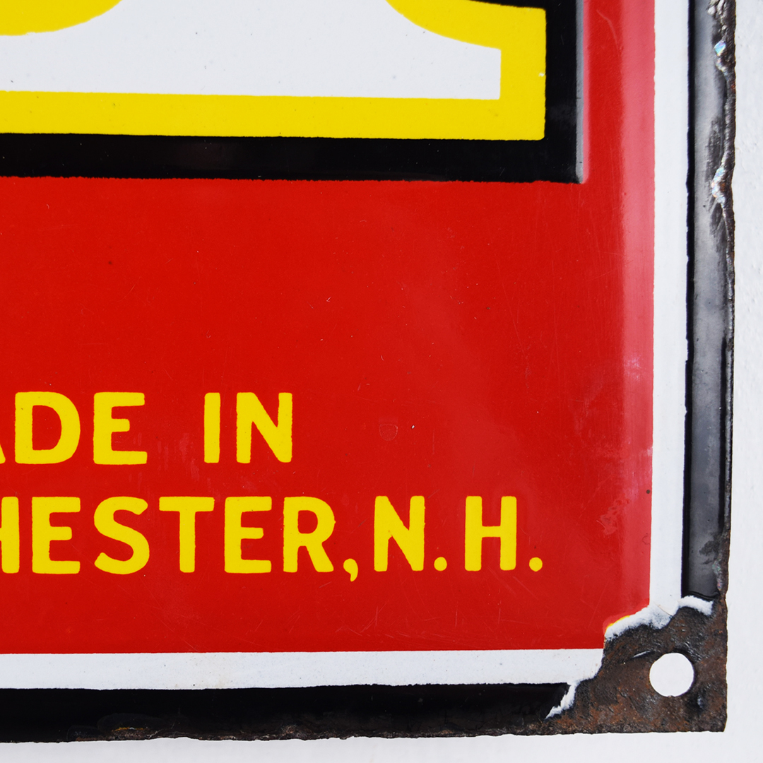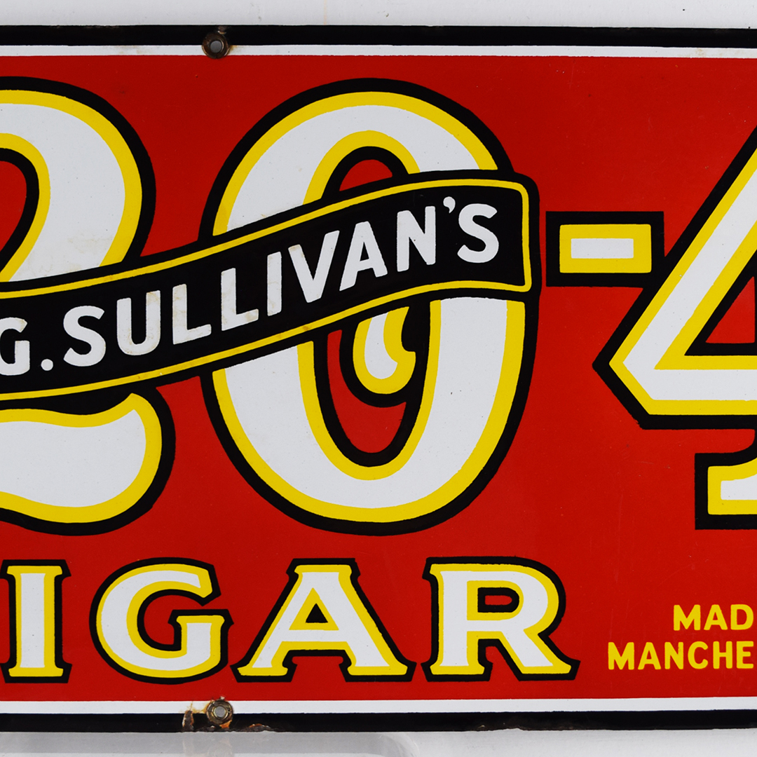 The iconic 7-20-4 name for R. G. Sullivan’s cigars comes straight from the original factory’s address—724 Elm Street in bustling Manchester, New Hampshire. Launched in 1874, this brand quickly soared to become one of the largest cigar makers, thriving right up until its doors closed in 1963. You’re looking at a dazzling porcelain sign from the roaring 1920s, measuring an impressive 10.5 inches tall by 23 inches wide. This vibrant piece shines with sharp gloss across its field, accented by a single tiny chip on the edge of the number 4. You’ll spot a touch of porcelain loss in the upper and lower right corners, plus around the bottom-middle grommet—proof of its vintage charm. Like many early porcelain signs, there’s classic outer-edge wear and very minor loss, attesting to its journey through time. Two sturdy original grommets remain at the top and bottom center mounting holes. This is a stunning piece of cigar history you’ll be thrilled to showcase in your collection! 21453-IWT