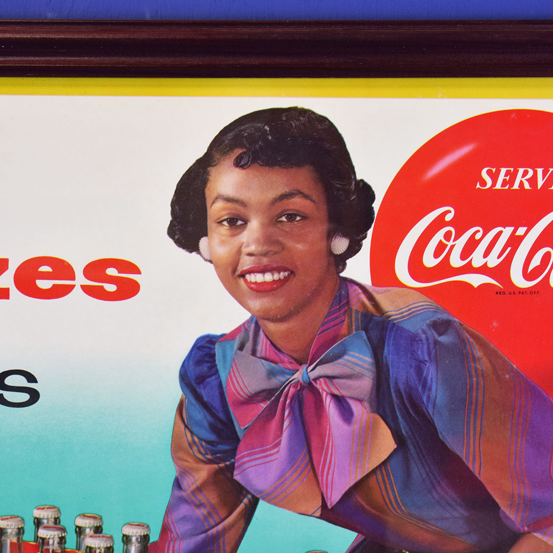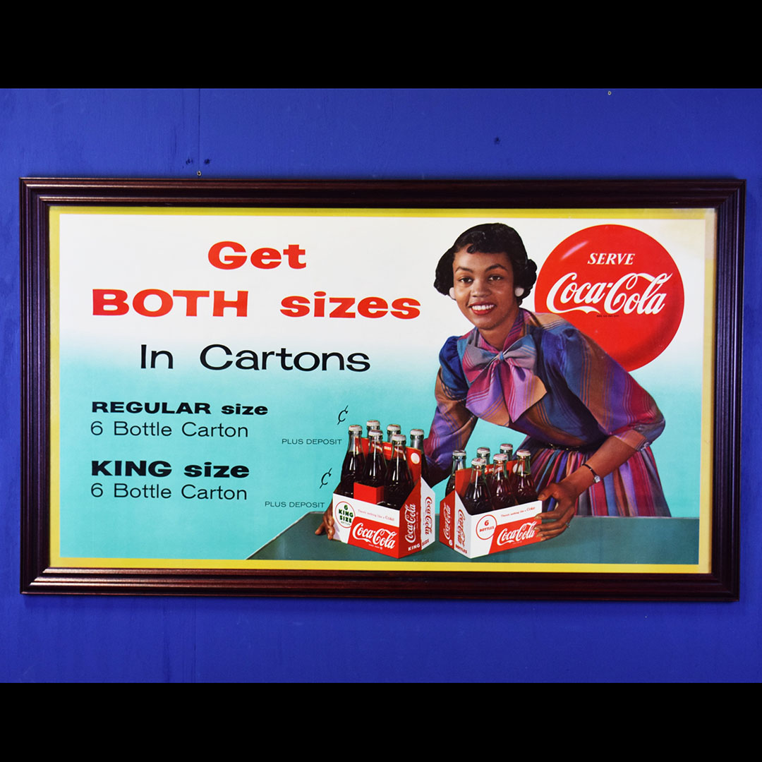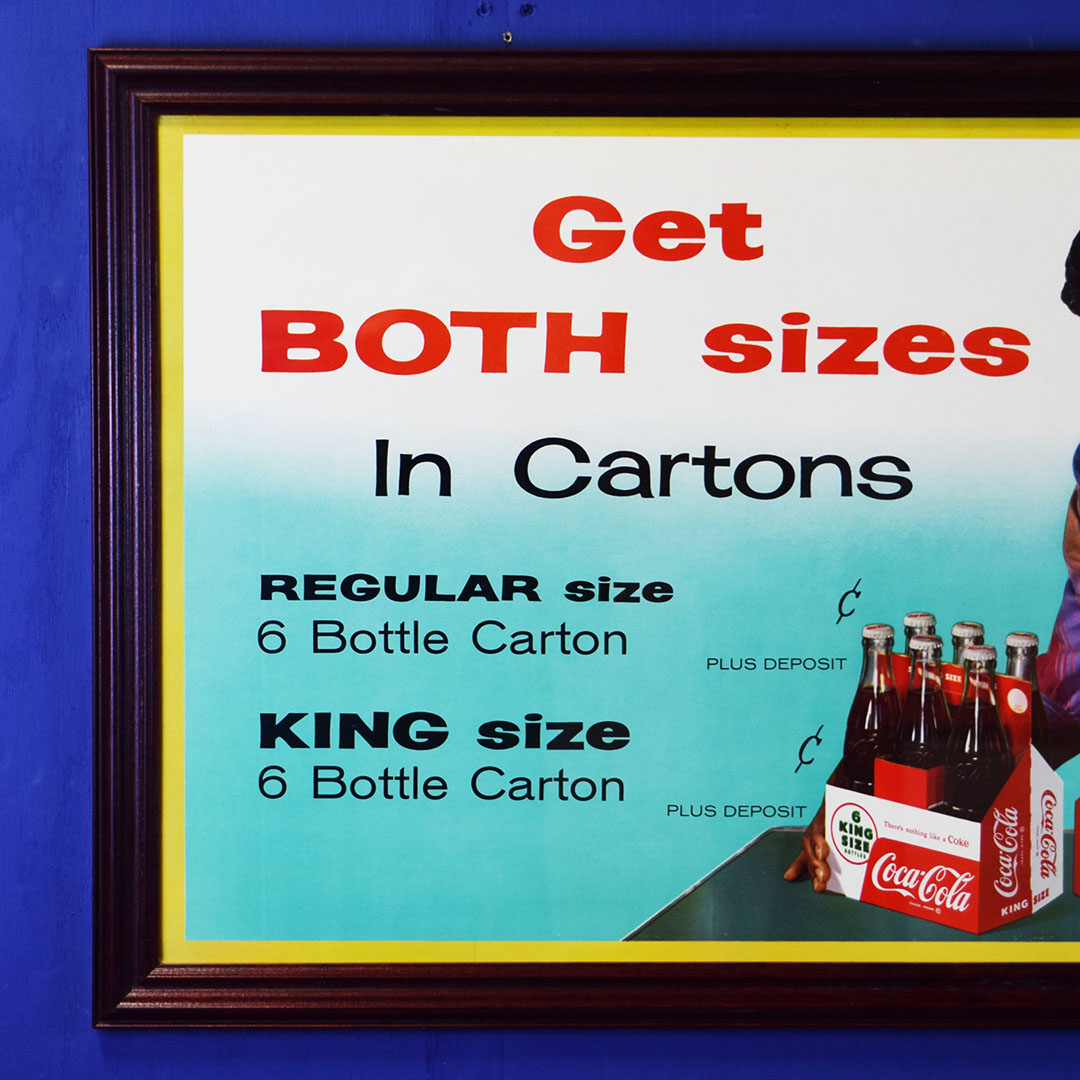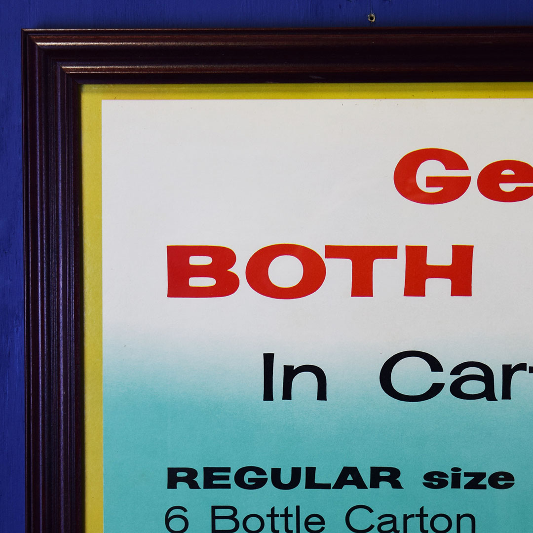Seldom seen, this 1958 Coca-Cola cardboard sign features both sizes of their 6-bottle cartons, the regular (original) 6.5-ounce size or the new King 10-ounce size. The graphics are very sharp on this colorful sign with both 6 packs being shown by a well-dressed lady. This sign has a privilege panel where the store owner could write the prices for each carton, but this sign was never marked. A small bend can be seen in the lower left corner, and some minor water damage is evident in the upper right corner. A great-looking frame has been added to give you an easy way to display this rare sign in your Coca-Cola collection. 20780-IPP