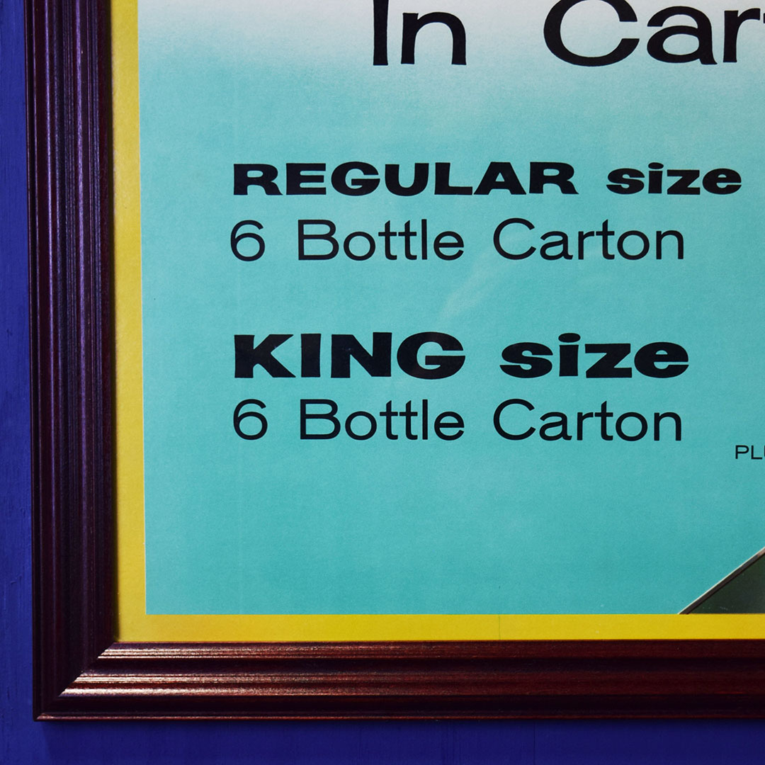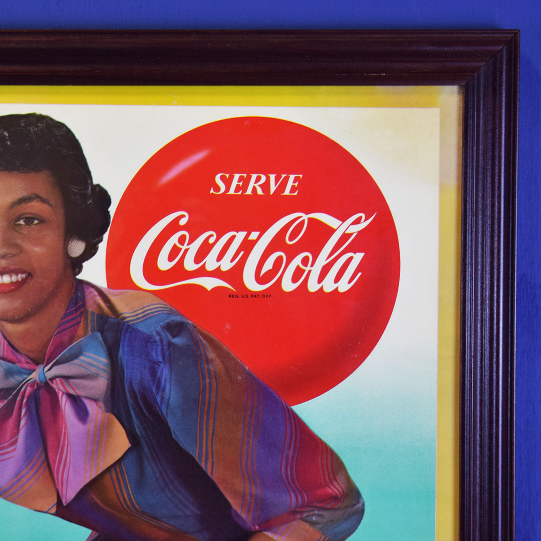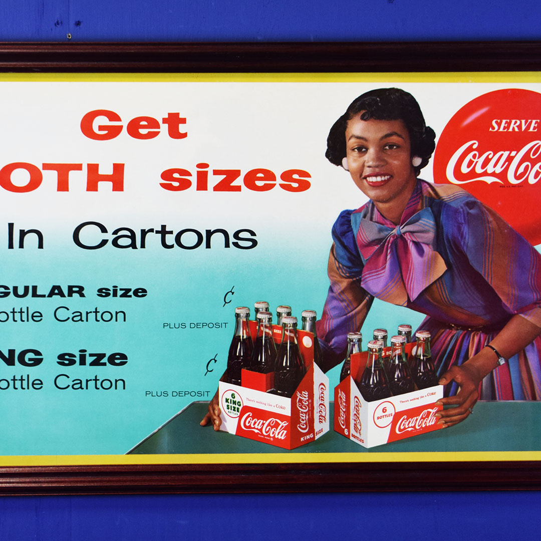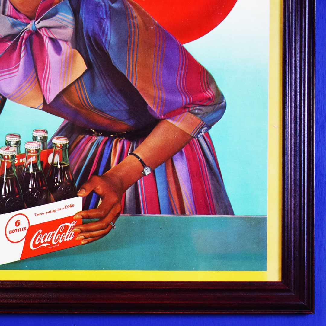 Seldom seen, this 1958 Coca-Cola cardboard sign features both sizes of their 6-bottle cartons, the regular (original) 6.5-ounce size or the new King 10-ounce size. The graphics are very sharp on this colorful sign with both 6 packs being shown by a well-dressed lady. This sign has a privilege panel where the store owner could write the prices for each carton, but this sign was never marked. A small bend can be seen in the lower left corner, and some minor water damage is evident in the upper right corner. A great-looking frame has been added to give you an easy way to display this rare sign in your Coca-Cola collection. 20780-IPP