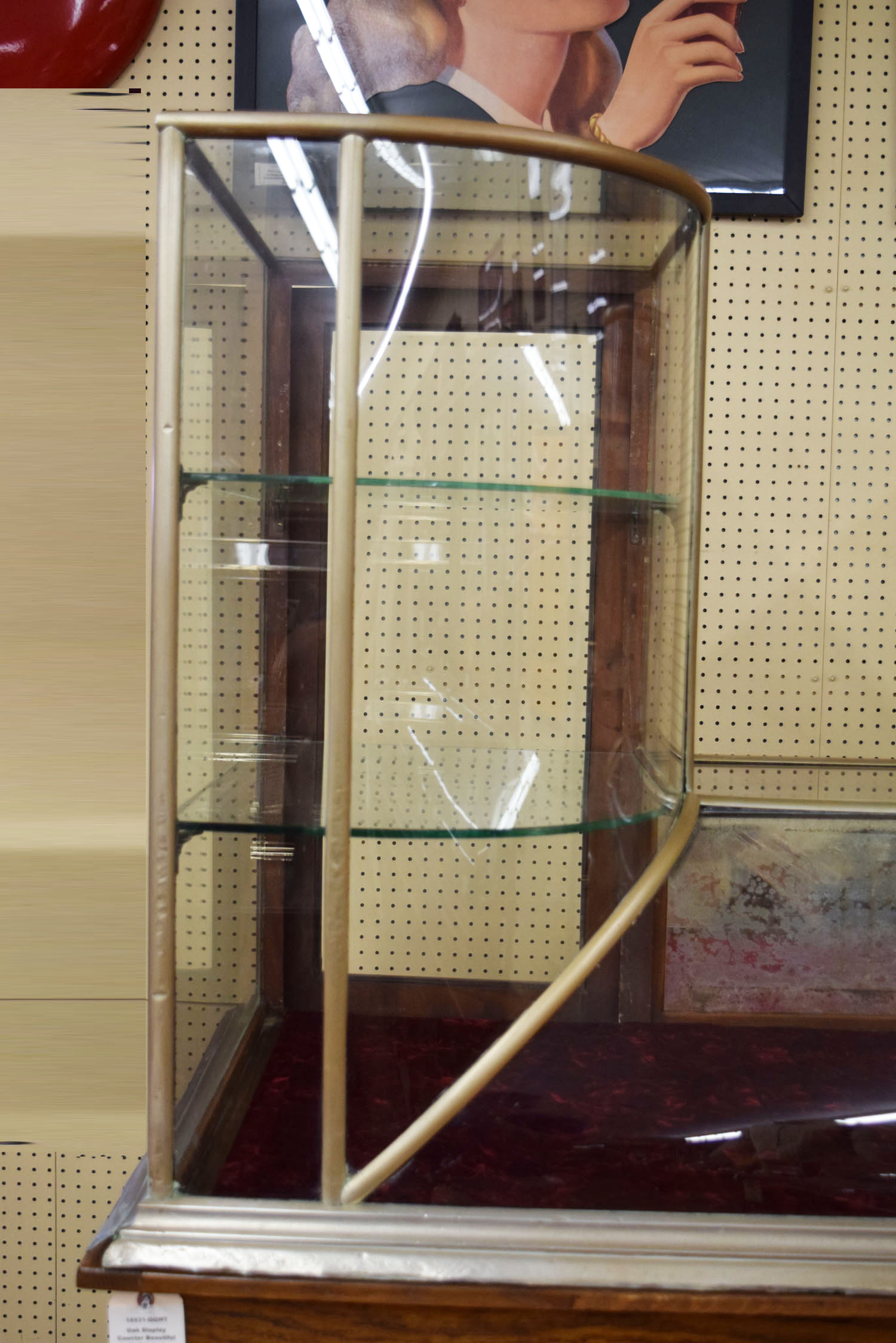 If you are looking for a beautiful showcase to compliment your one of a kind collectibles, look no further than this very rare Starling countertop showcase. Two distinct columns on each side with a curved glass center give this larger showcase a very unique look. The frame is made of oak wood, and it has been completely covered in German nickel. All of the glass is original, including the glass shelves and shelf holders in the two towers. Minor scratching can be seen on the center top glass. Some of the nickel overlay is starting to lift over the years, which can be seen on the lower left side, along with some light denting. The original plaster used to hold the glass has some flaking, but is intact and not been repaired. The mirrored bottom center hinged door has lost most of the silvering over the years, and the top wooden doors are splitting with age. The inside wooden base is covered with three nice felt covers. This one of a kind showcase was made by Starling Showcase Manufacturing Company, on 4th and Arch Street in Philadelphia, and is ready for your home. This item is larger than UPS will allow. Please contact us for shipping or delivery quote. 19652-RPPP