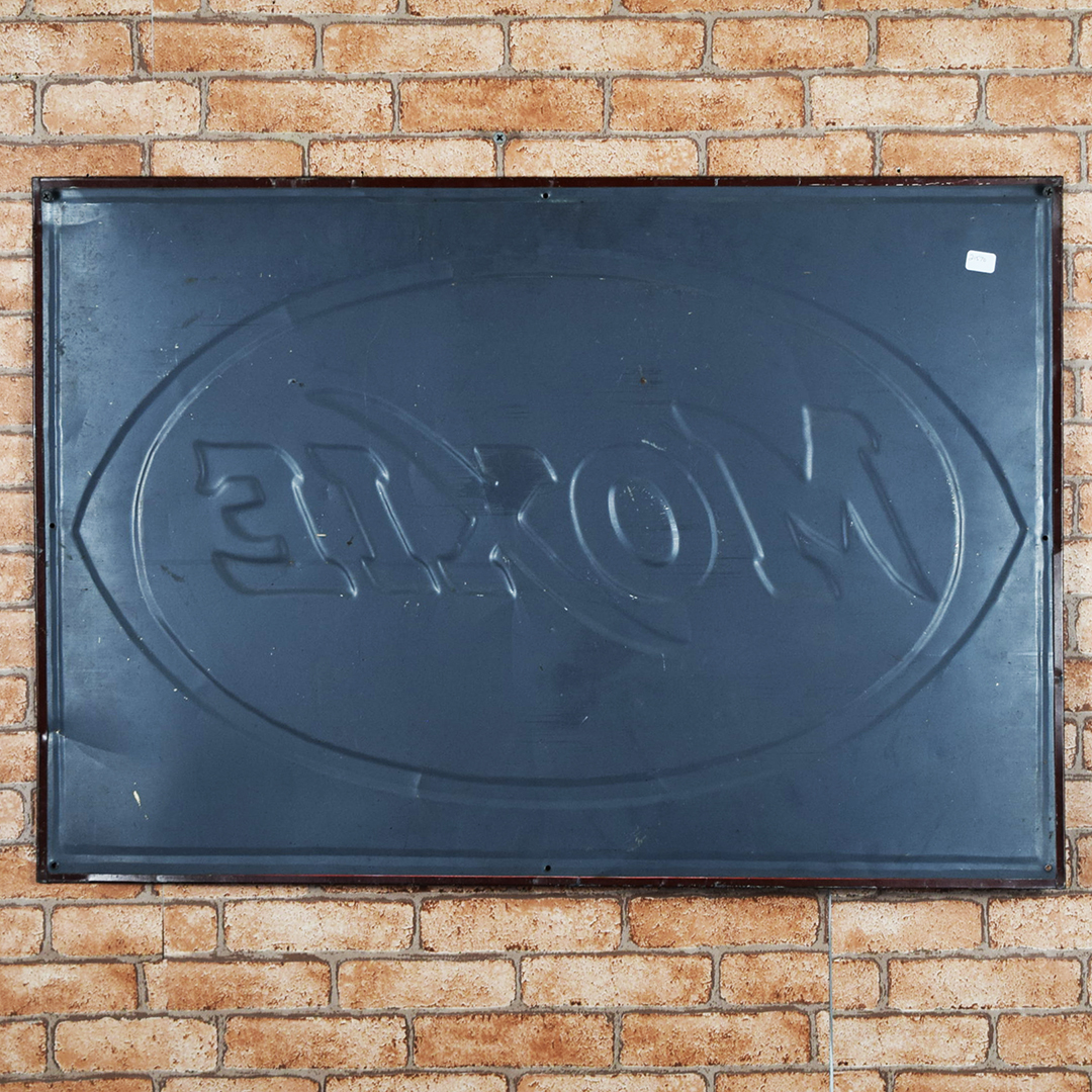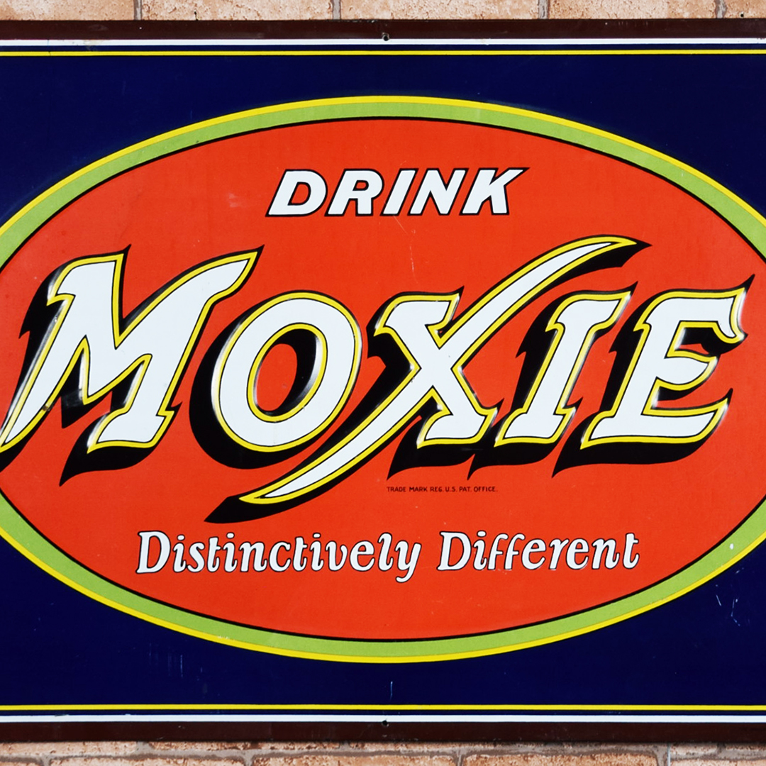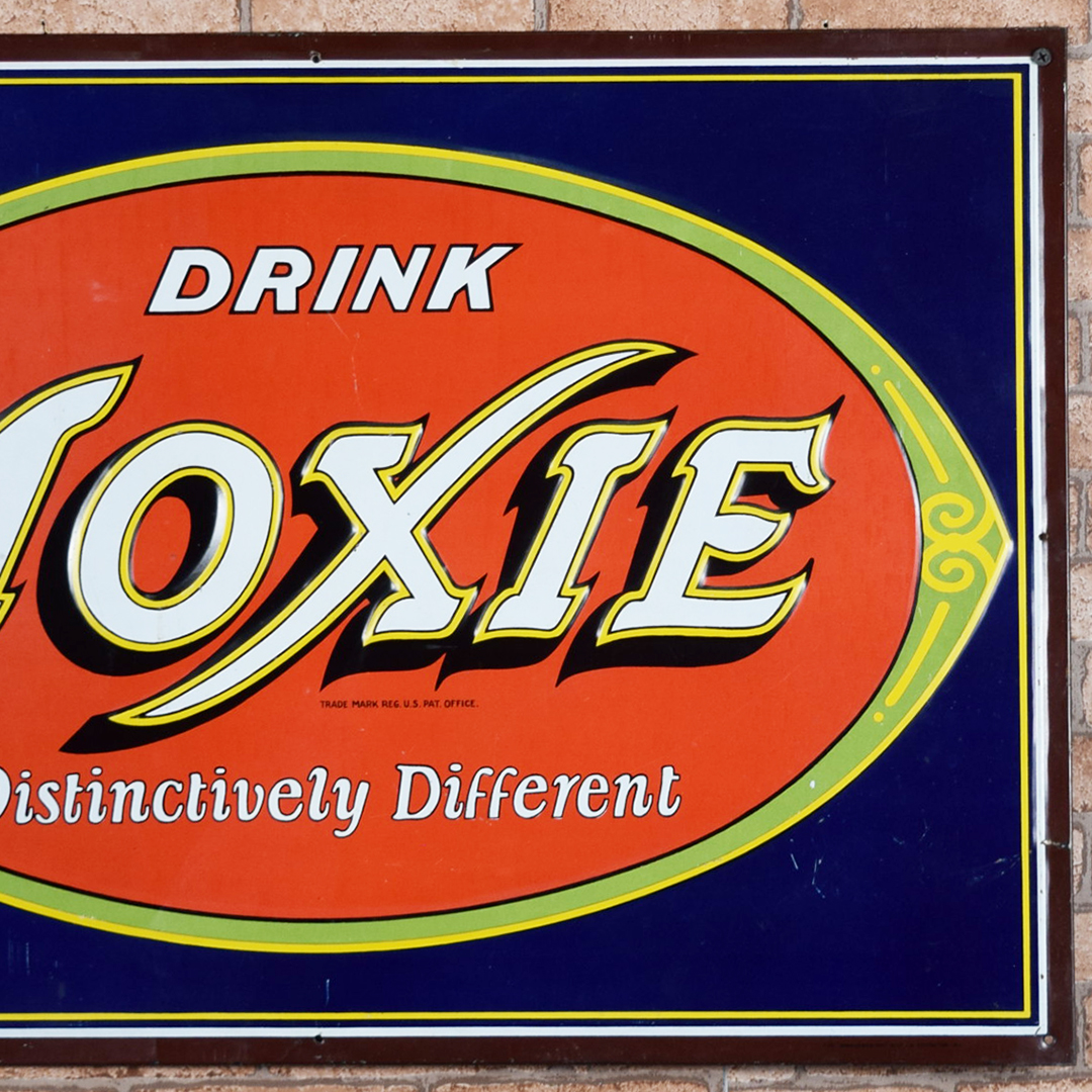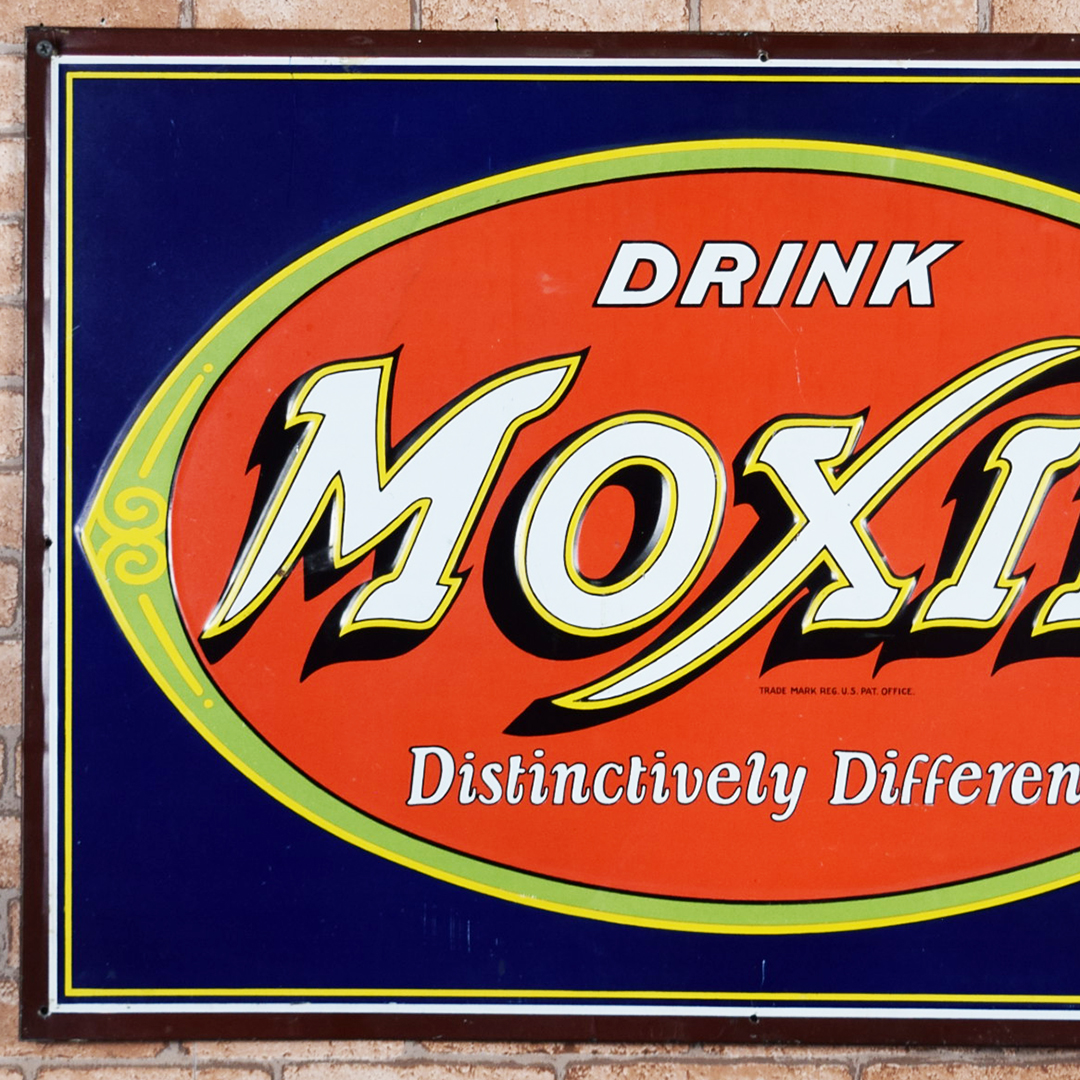 Colorful and rare, this beautiful Moxie tin sign features embossed letters and an embossed oval on its rectangular platform. This sign was produced by Donaldson Art Sign Company, as marked in the lower right-hand corner. It measures 18.75 inches tall by 27.75 inches wide. The sign face itself is glossy, with a few minor surface scratches in the field. A few small chips are visible on the Moxie letters with minor paint loss. Although hard to see, the sign itself has a few light bends visible upon close inspection. With its vibrant colors, this tin sign will make an excellent addition to your collection. 21570-OTT