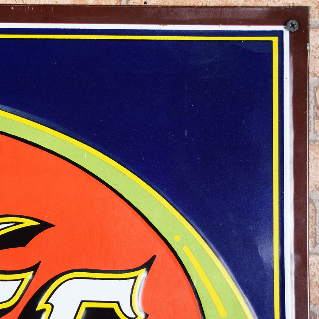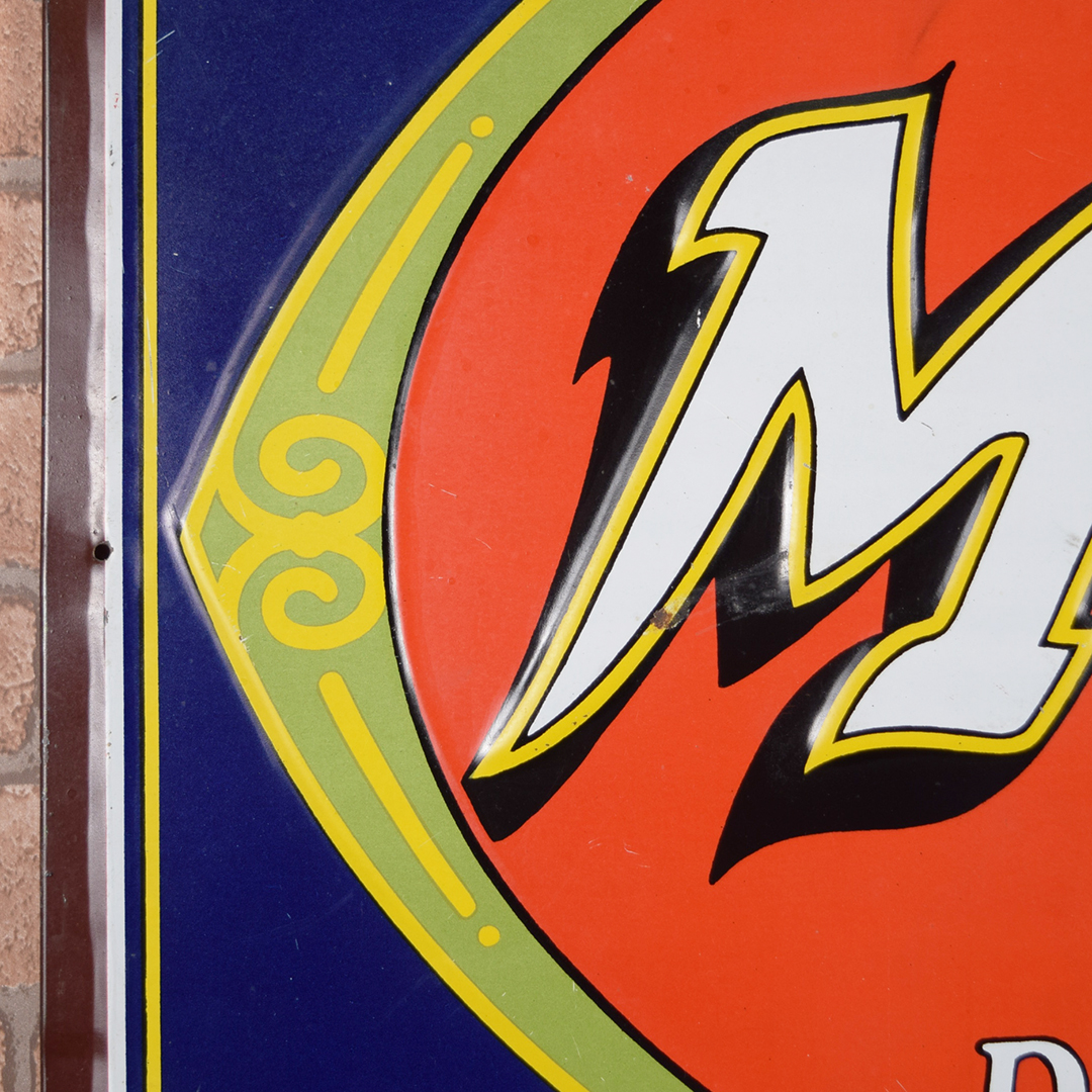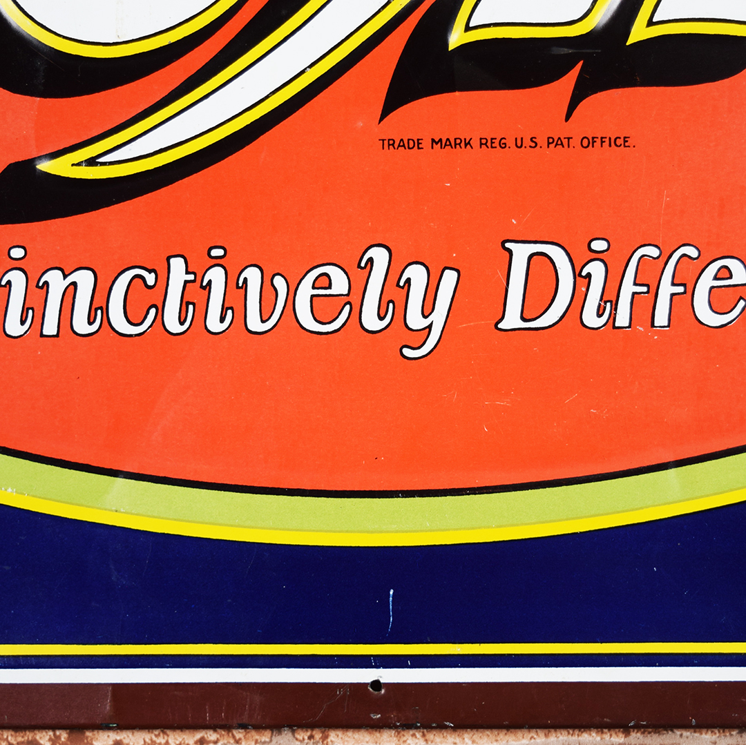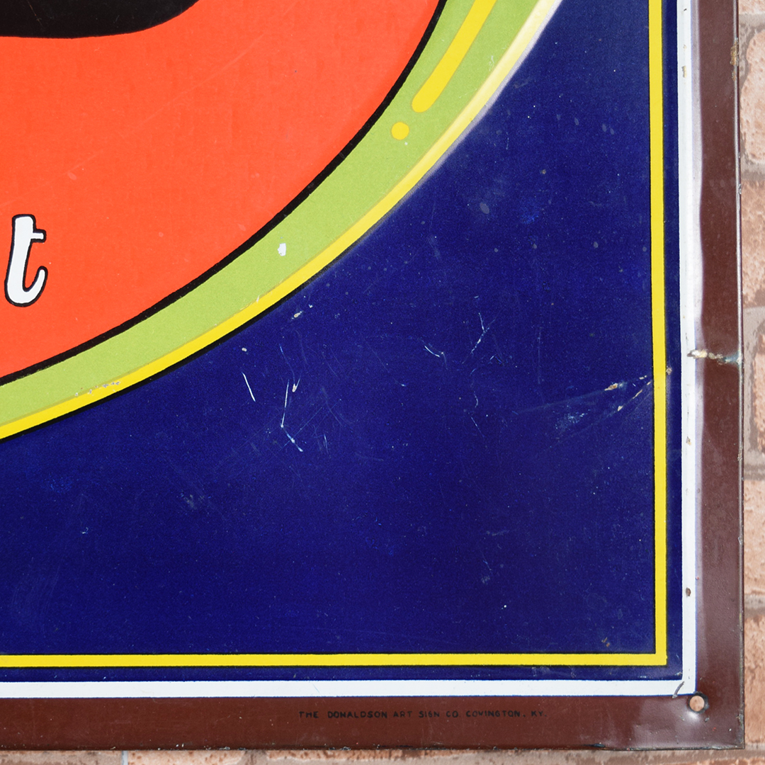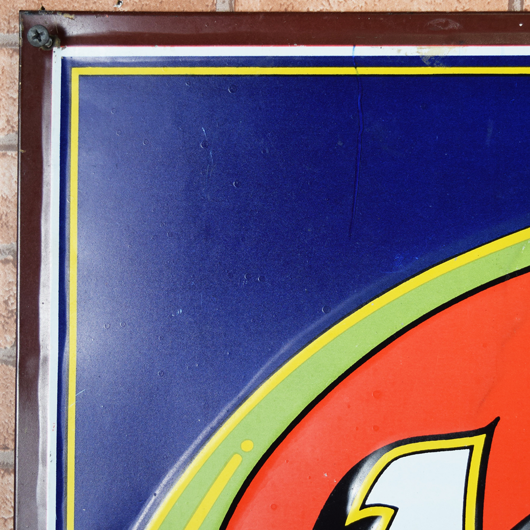 Colorful and rare, this beautiful Moxie tin sign features embossed letters and an embossed oval on its rectangular platform. This sign was produced by Donaldson Art Sign Company, as marked in the lower right-hand corner. It measures 18.75 inches tall by 27.75 inches wide. The sign face itself is glossy, with a few minor surface scratches in the field. A few small chips are visible on the Moxie letters with minor paint loss. Although hard to see, the sign itself has a few light bends visible upon close inspection. With its vibrant colors, this tin sign will make an excellent addition to your collection. 21570-OTT
