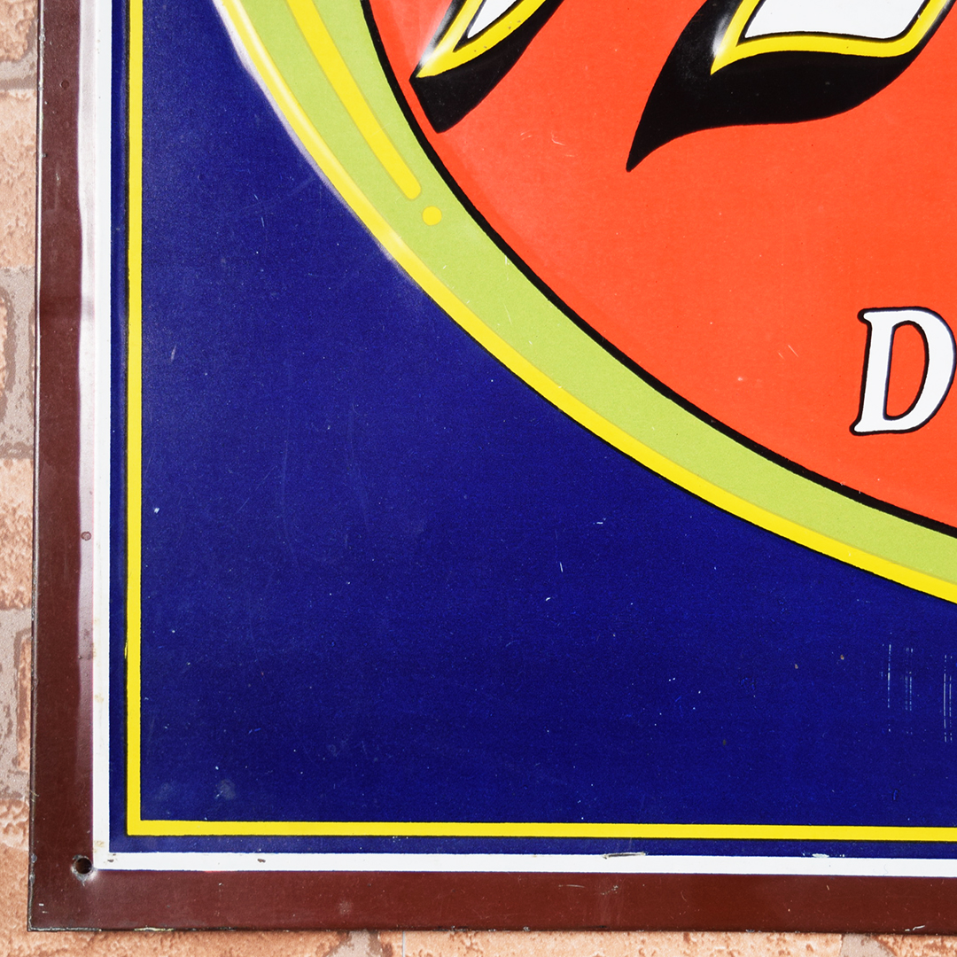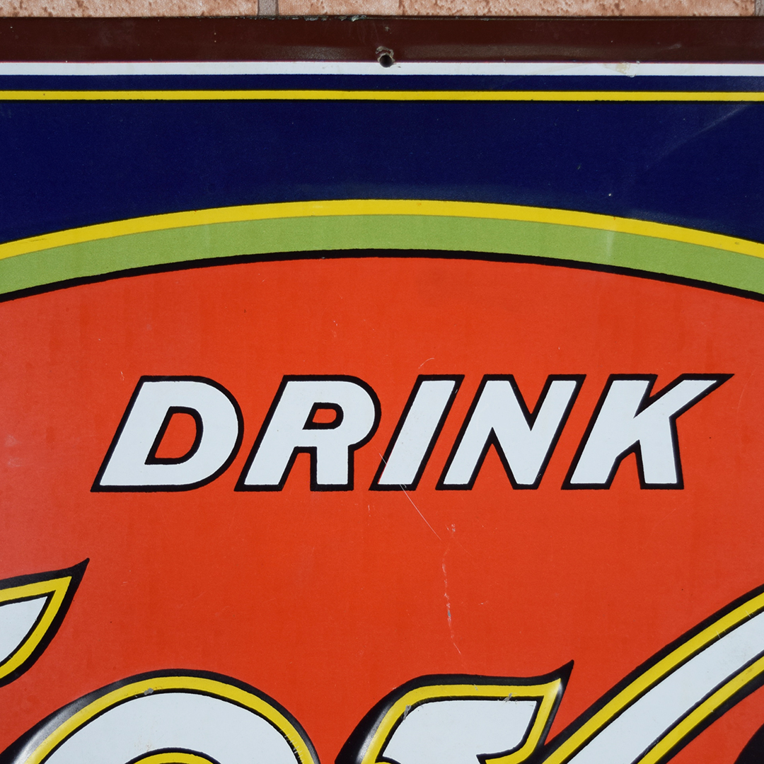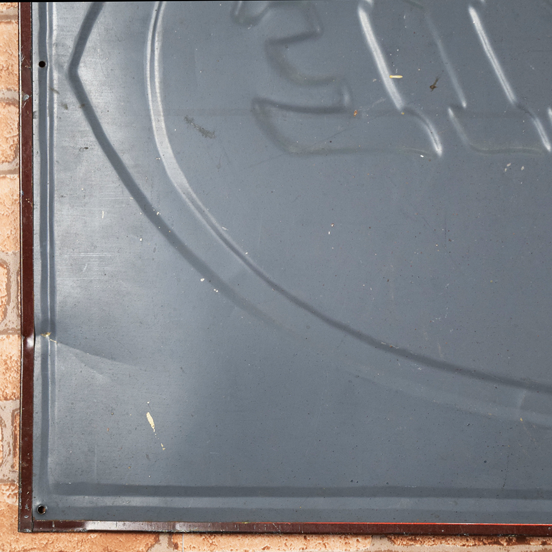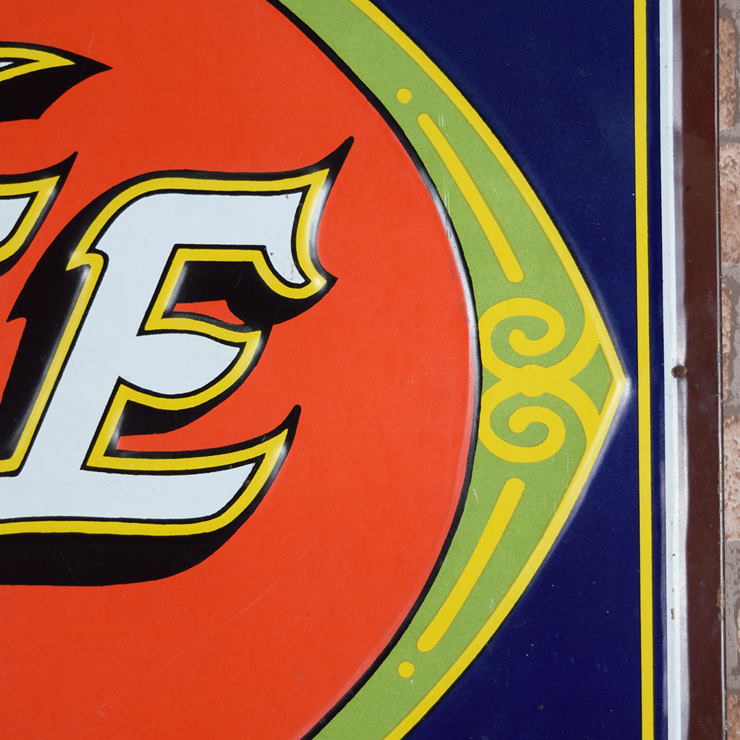 Colorful and rare, this beautiful Moxie tin sign features embossed letters and an embossed oval on its rectangular platform. This sign was produced by Donaldson Art Sign Company, as marked in the lower right-hand corner. It measures 18.75 inches tall by 27.75 inches wide. The sign face itself is glossy, with a few minor surface scratches in the field. A few small chips are visible on the Moxie letters with minor paint loss. Although hard to see, the sign itself has a few light bends visible upon close inspection. With its vibrant colors, this tin sign will make an excellent addition to your collection. 21570-OTT