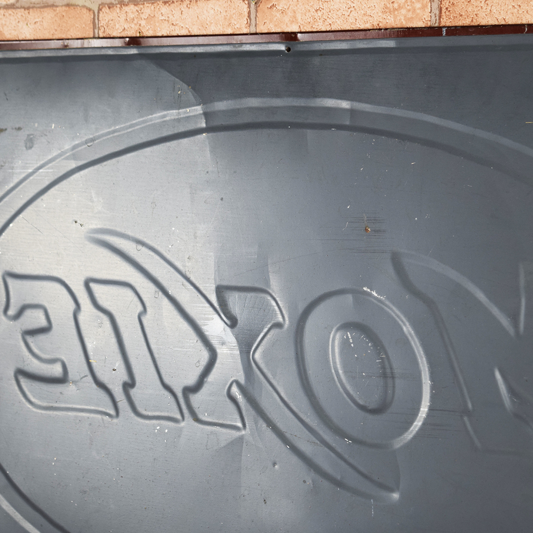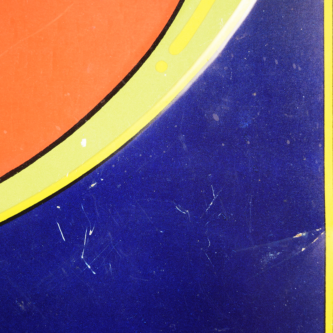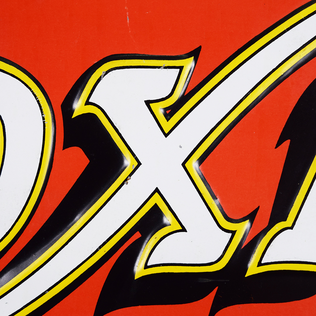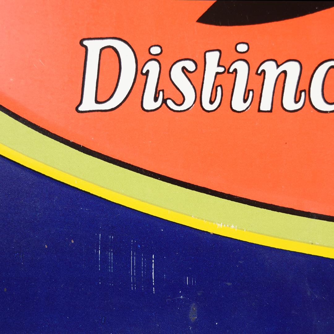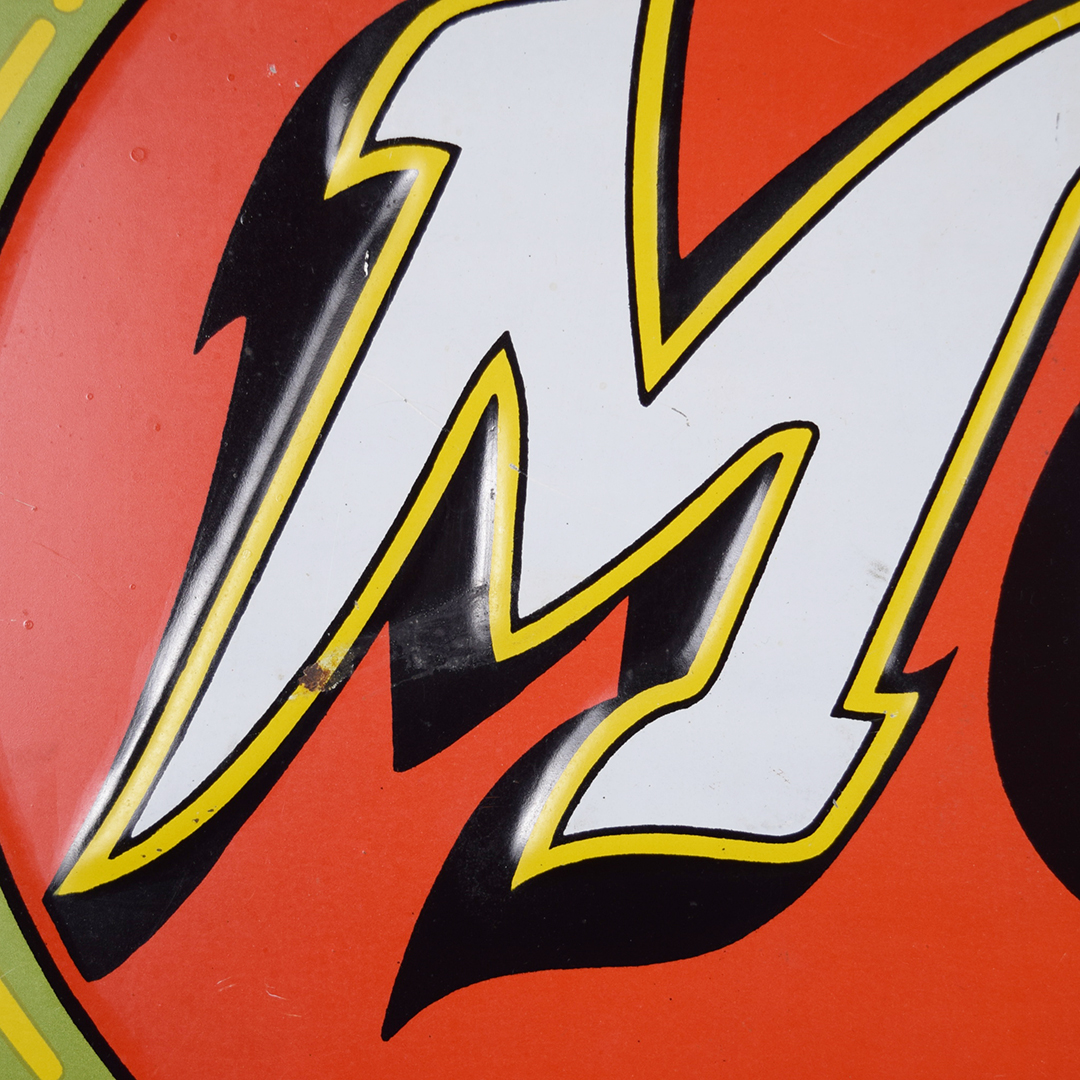 Colorful and rare, this beautiful Moxie tin sign features embossed letters and an embossed oval on its rectangular platform. This sign was produced by Donaldson Art Sign Company, as marked in the lower right-hand corner. It measures 18.75 inches tall by 27.75 inches wide. The sign face itself is glossy, with a few minor surface scratches in the field. A few small chips are visible on the Moxie letters with minor paint loss. Although hard to see, the sign itself has a few light bends visible upon close inspection. With its vibrant colors, this tin sign will make an excellent addition to your collection. 21570-OTT
