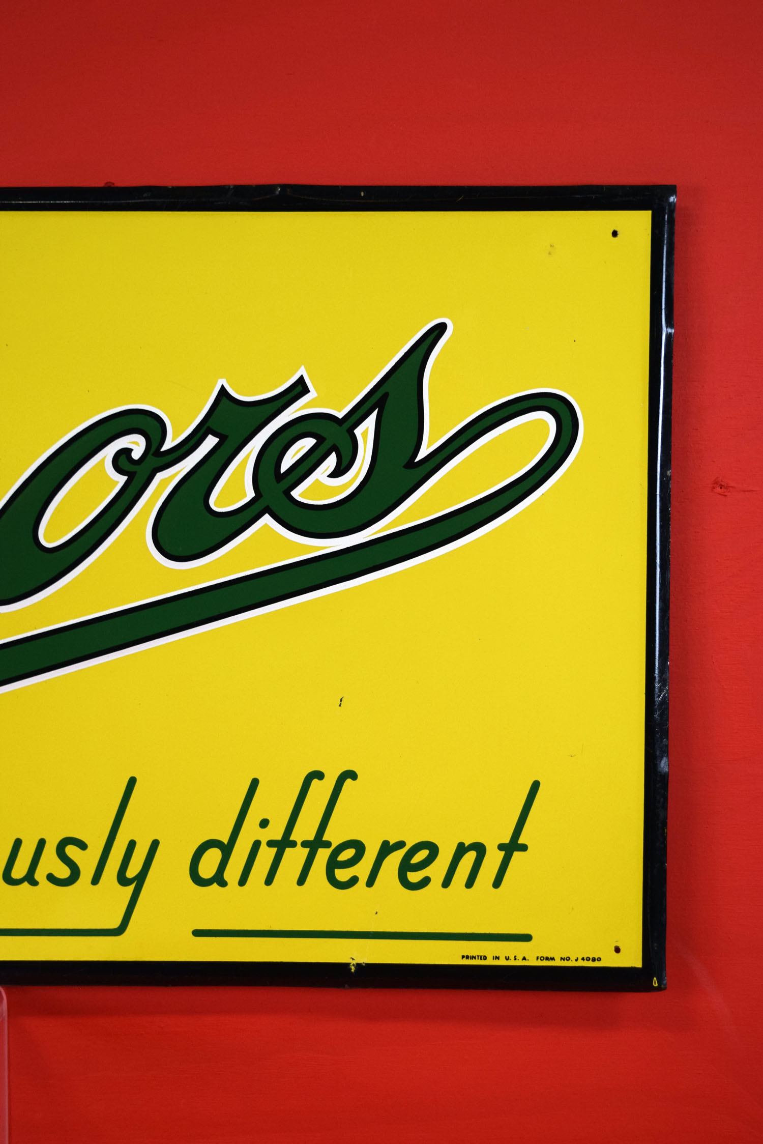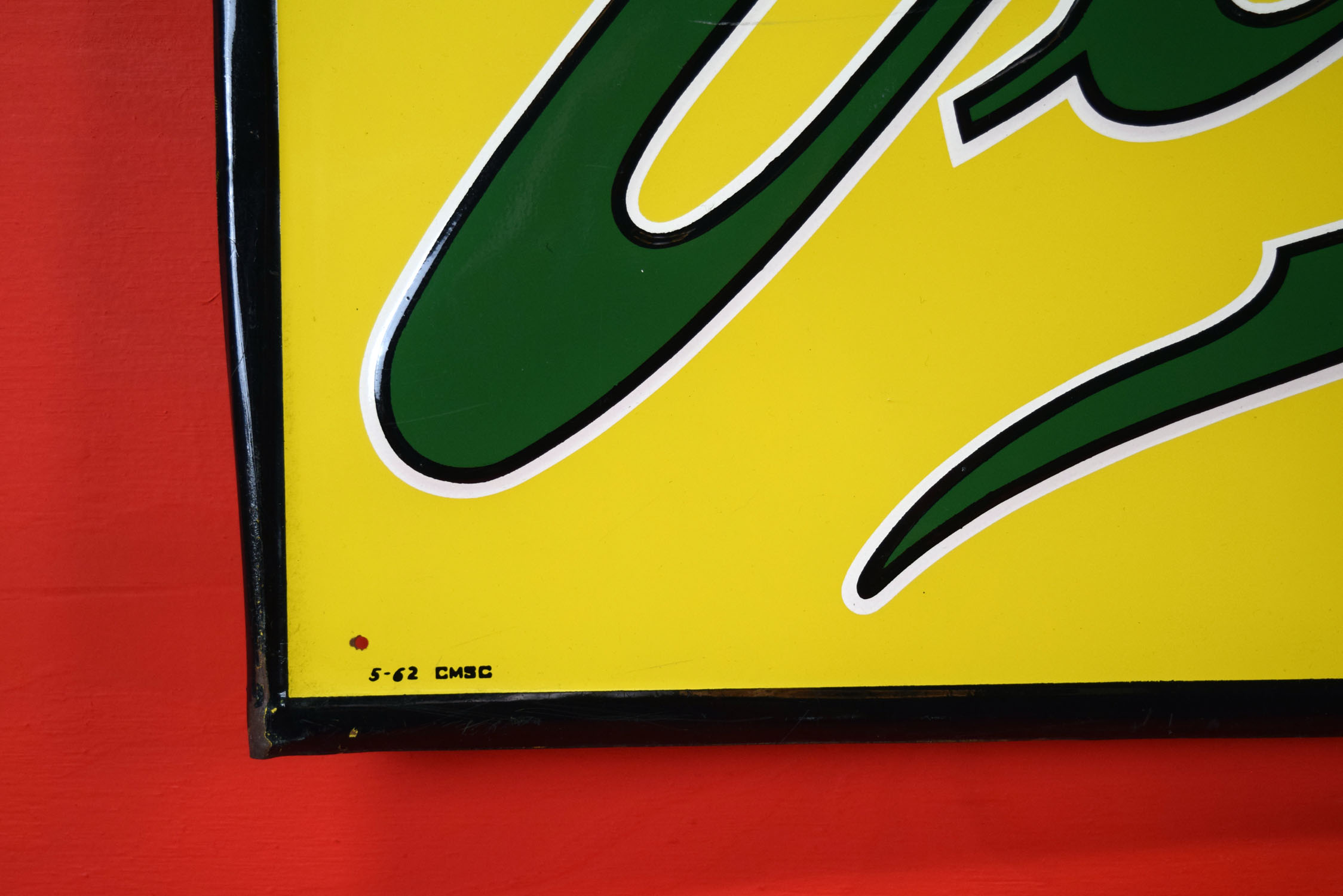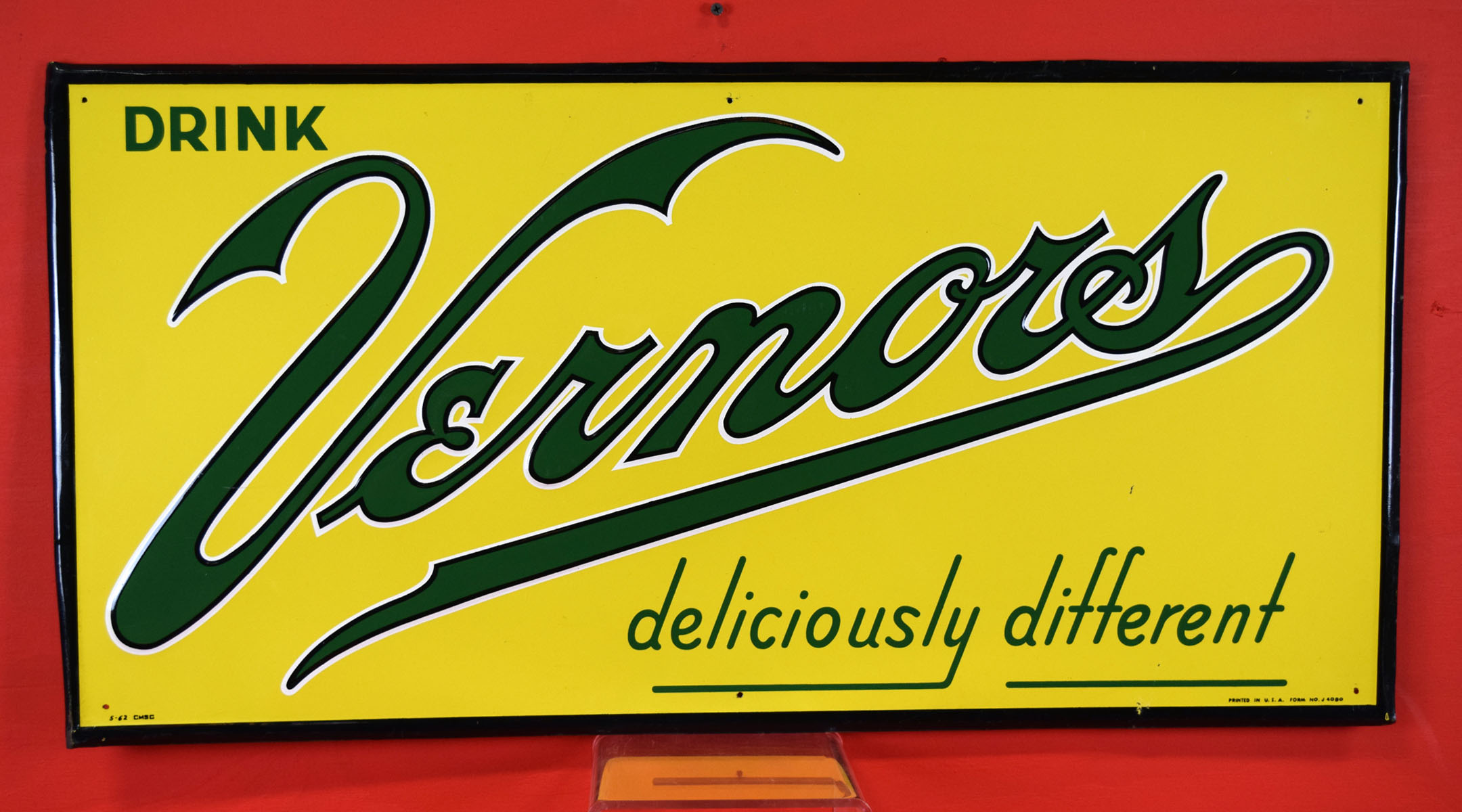 Dated 1962, this rare Vernors embossed metal sign is beautiful and ready for your collection. The colors pop nicely and the subtle black frame adds just a touch of class to an already classy sign. You can see some slight bending on the outer frame up close, along with a few small scratches on the yellow background. The gloss in the field is amazing and very shiny. Very nice sign that you will admire for years. 19860-IRP