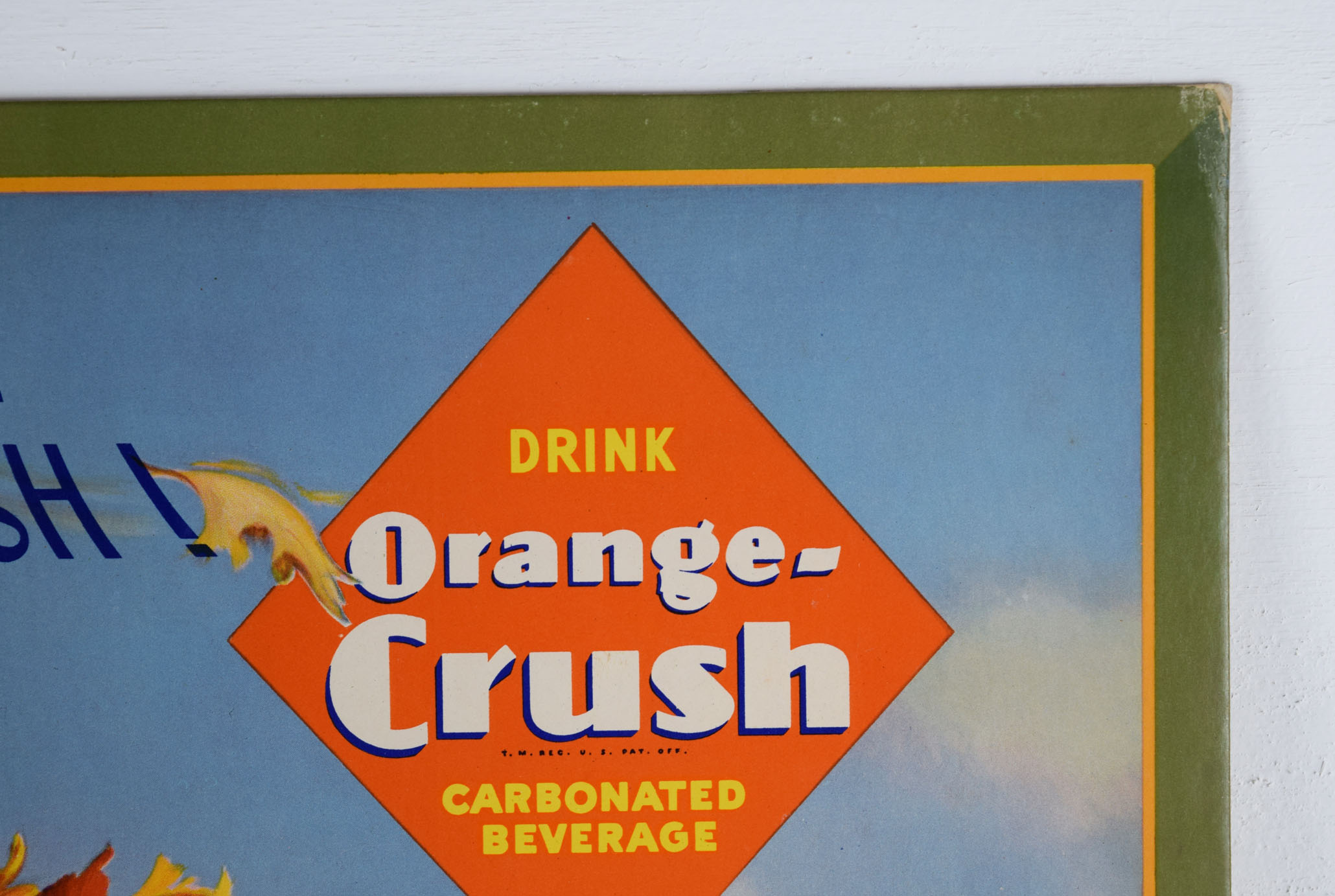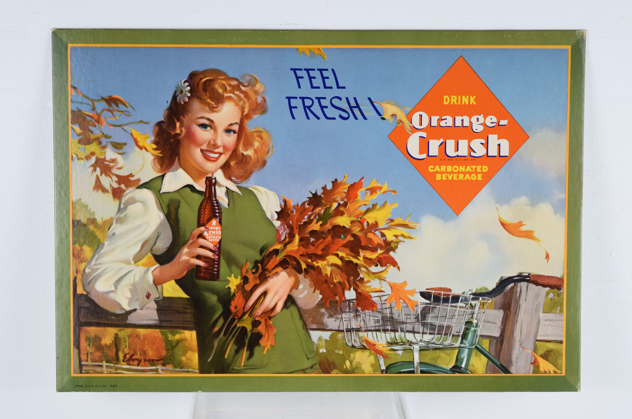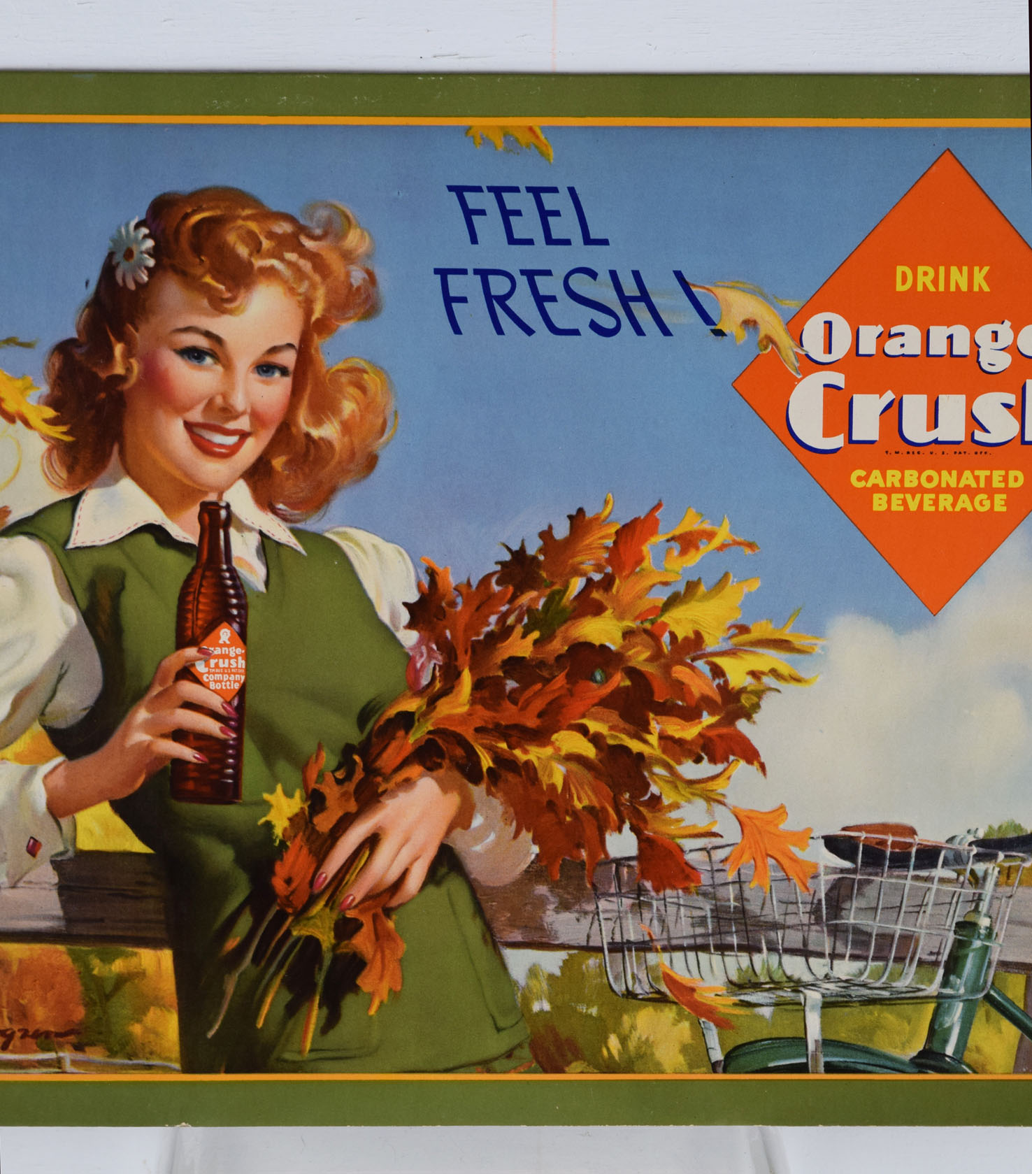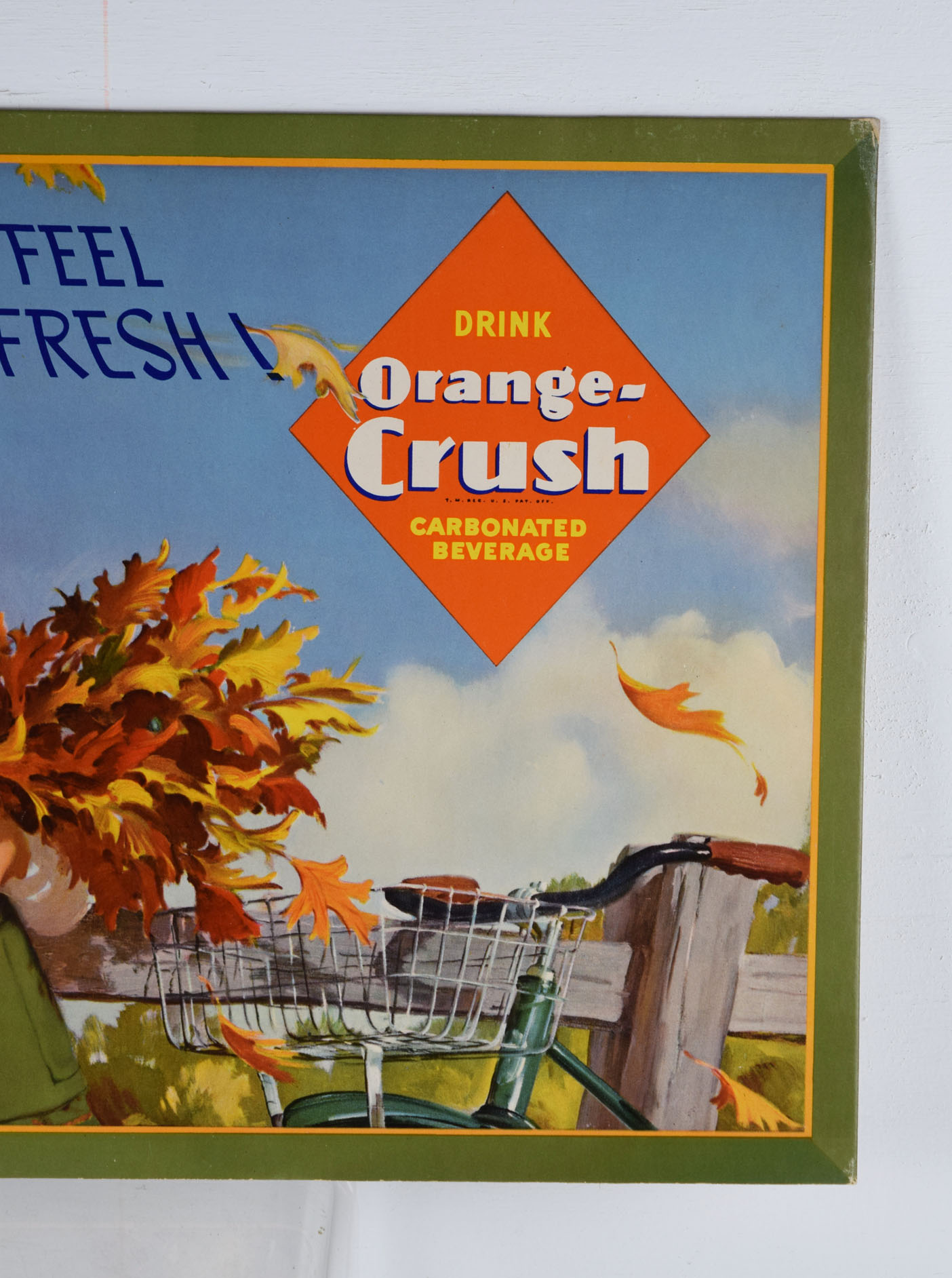 Measuring just eleven inches tall by sixteen and a quarter inches wide, this lithograph over cardboard features a young lady holding a period correct bottle of Orange Crush in her right hand and fall leaves in her left hand while leaning against a wooden fence beside her bicycle. It is marked “Litho. U.S.A. N.L. Co. B-872” in the lower left corner. It has a flat back with a frame around the outside that is part of the lithograph. Some very minor wear on the outer corners, with the inside about as perfect as it can be. We date this from the 1920’s to 1930’s with the design of the bottle in her hand. Nice rare piece that will look great in your Orange Crush collection. 19579-UIP