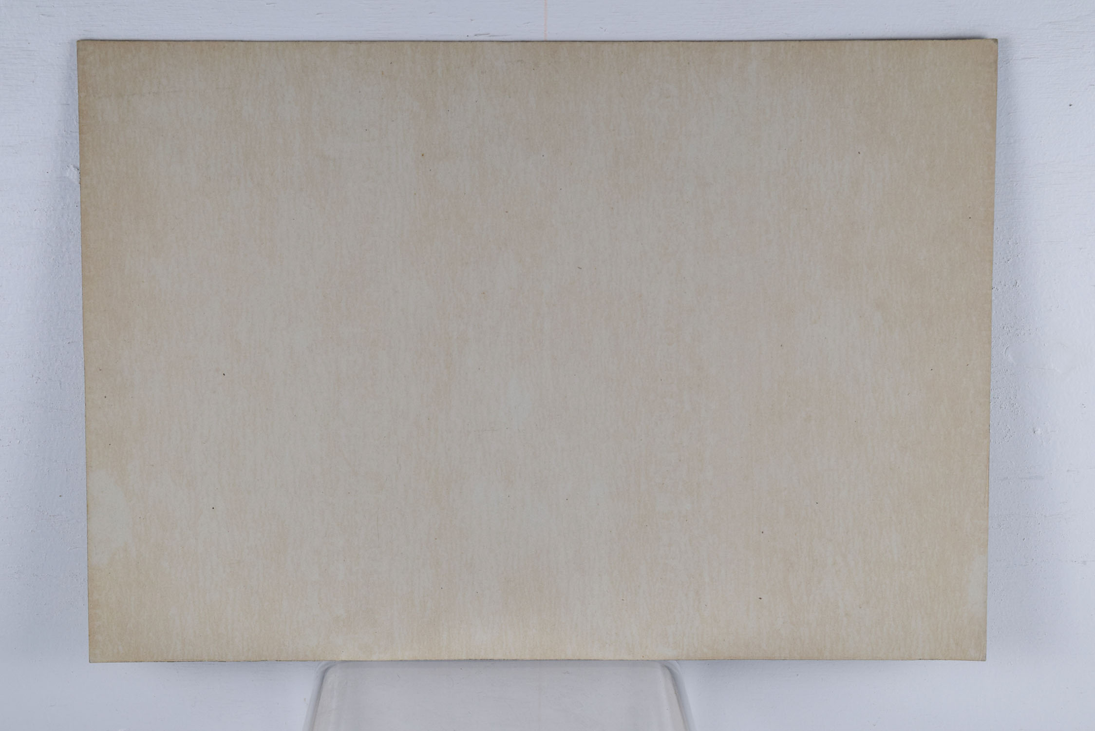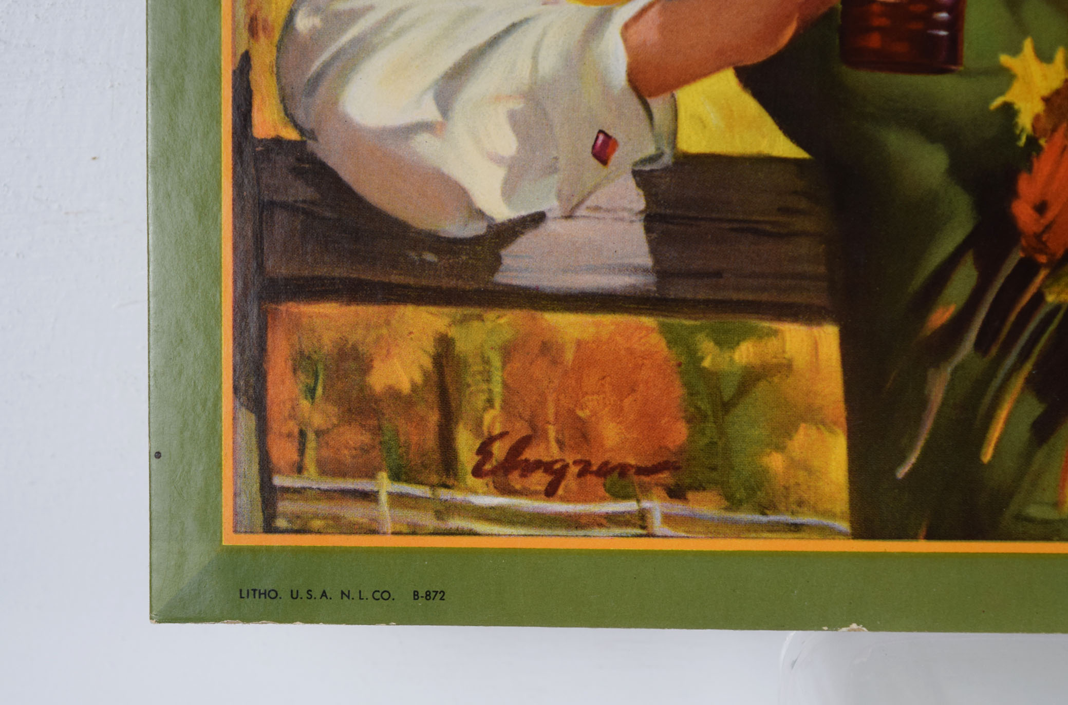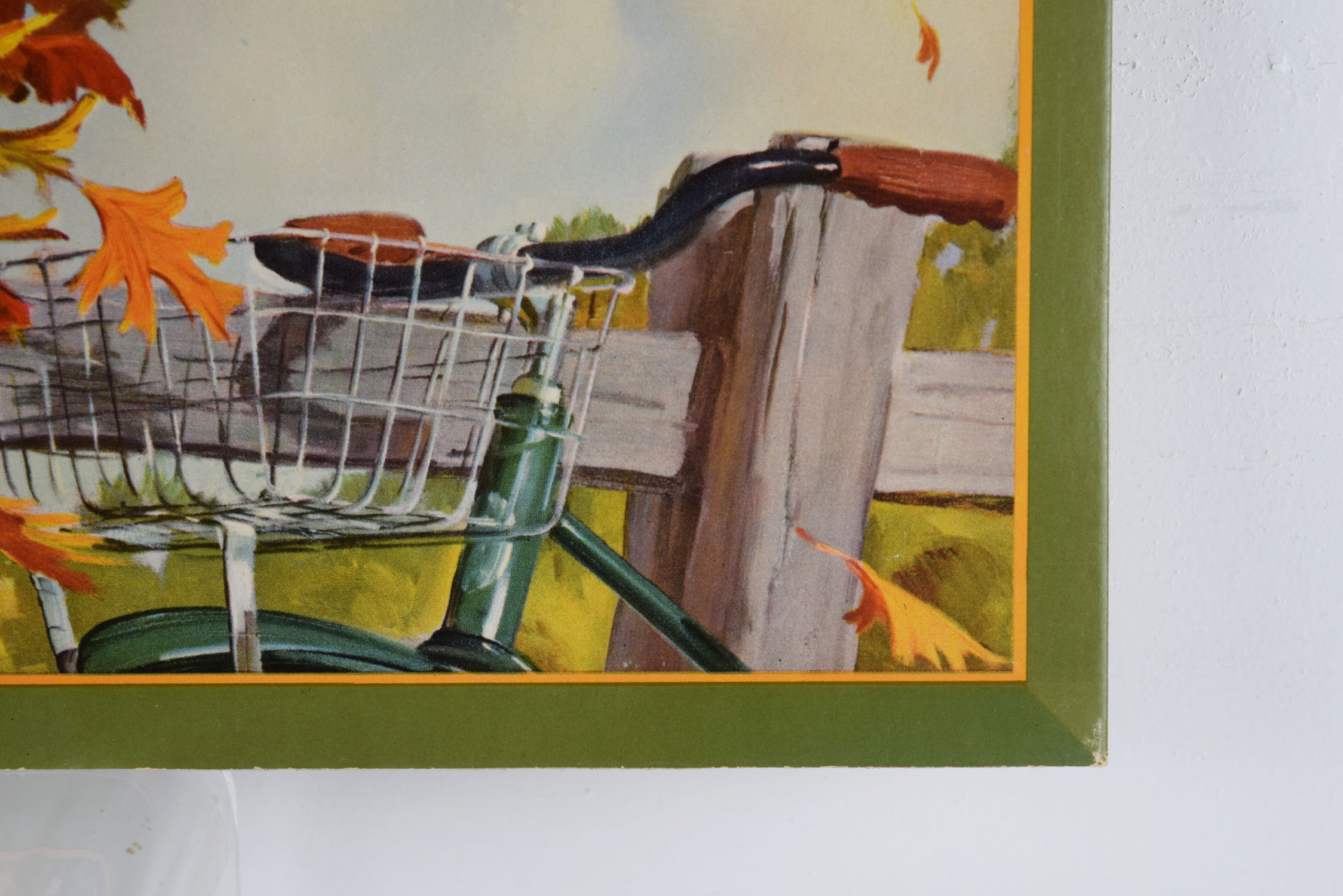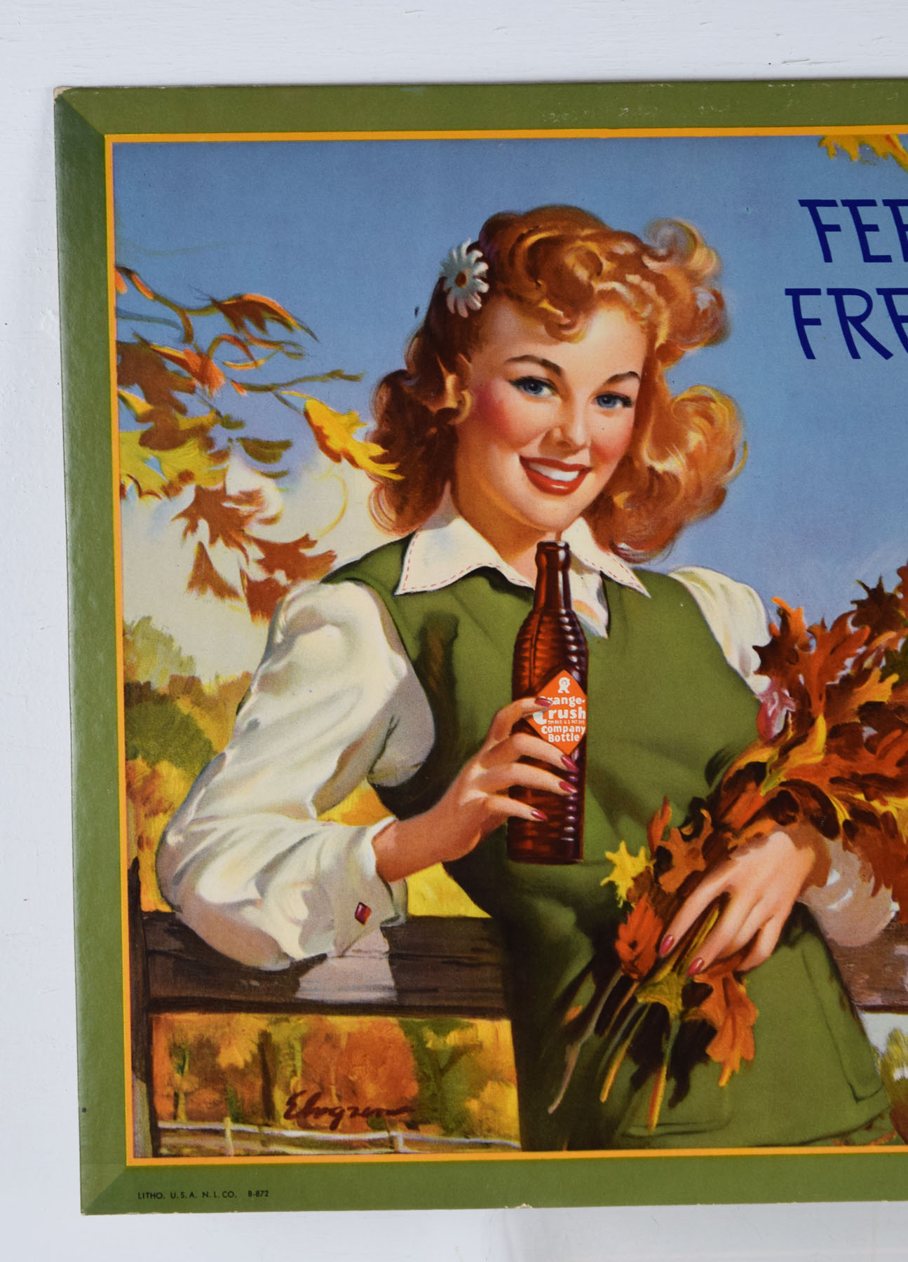 Measuring just eleven inches tall by sixteen and a quarter inches wide, this lithograph over cardboard features a young lady holding a period correct bottle of Orange Crush in her right hand and fall leaves in her left hand while leaning against a wooden fence beside her bicycle. It is marked “Litho. U.S.A. N.L. Co. B-872” in the lower left corner. It has a flat back with a frame around the outside that is part of the lithograph. Some very minor wear on the outer corners, with the inside about as perfect as it can be. We date this from the 1920’s to 1930’s with the design of the bottle in her hand. Nice rare piece that will look great in your Orange Crush collection. 19579-UIP