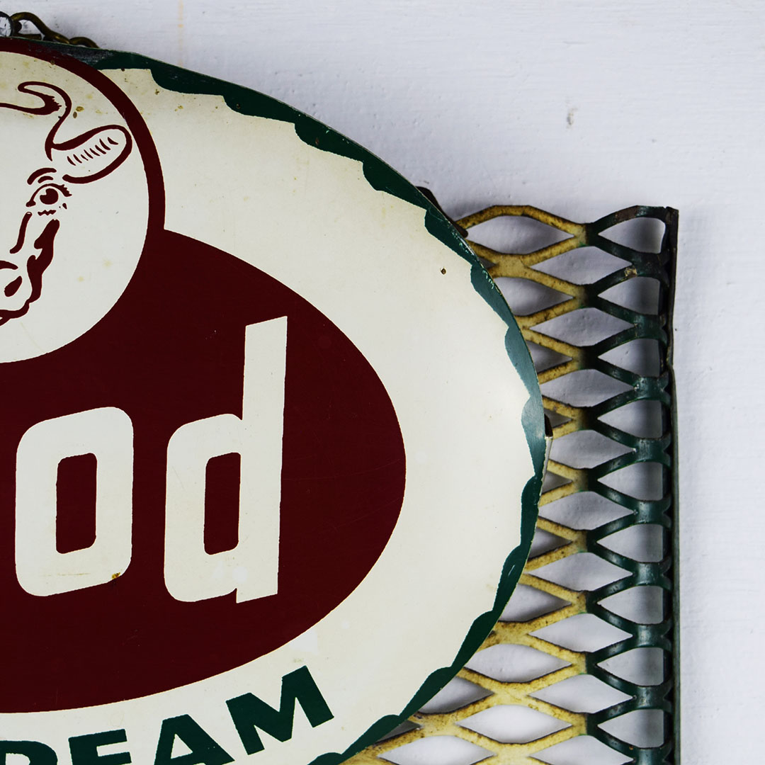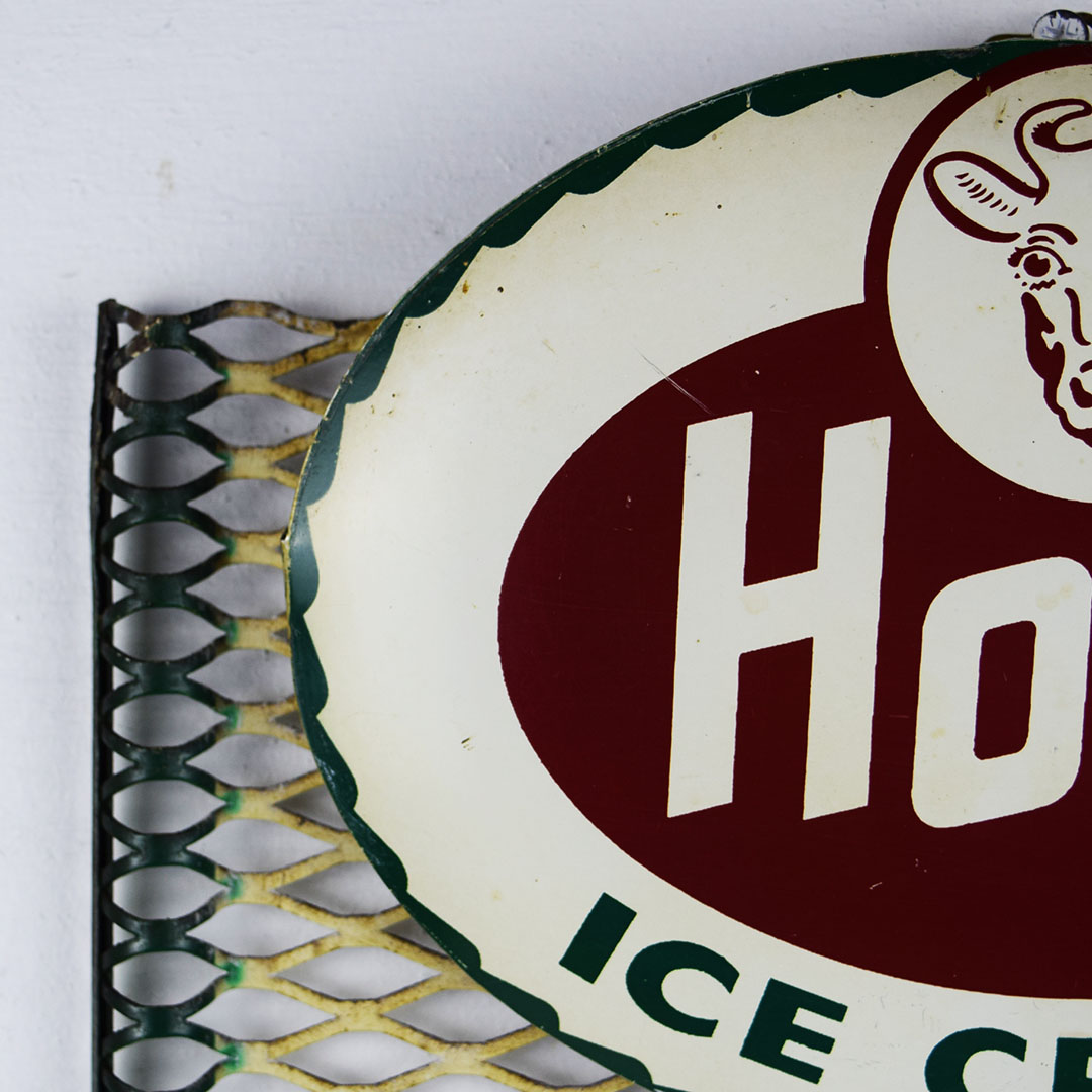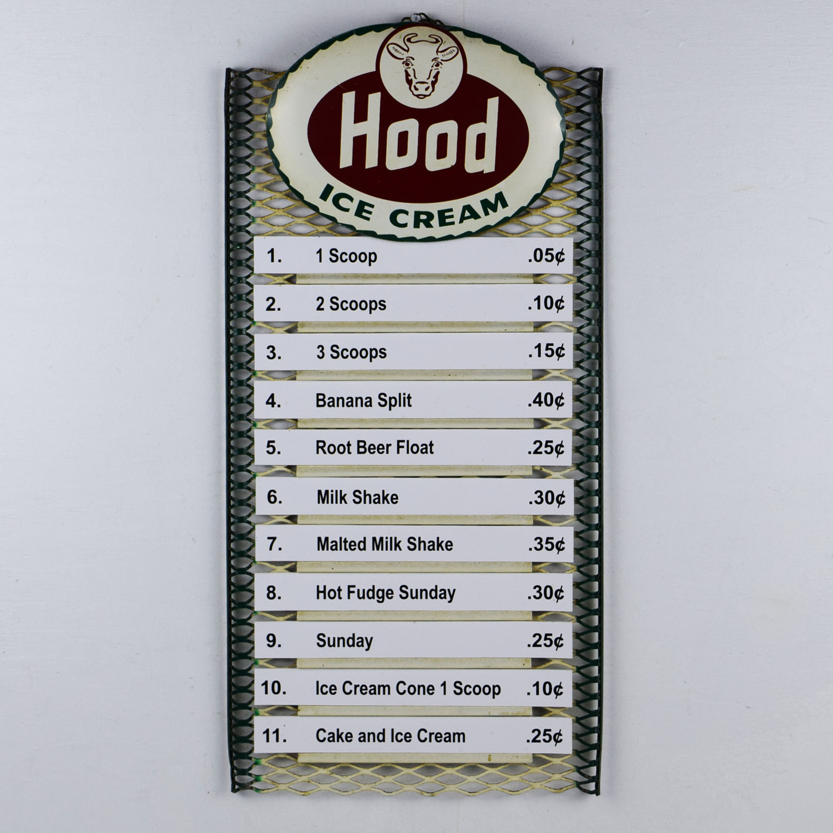 Seldom seen, this metal Hood Ice Cream menu board would be right at home in your ice cream collection. The oval Hood Ice Cream sign at the top of the menu board features Hood’s cow logo along with their red and green colors on a white background. The top lip has a slight bend with minor chipping. The menu section is a wire mesh with 11 slots for different ice cream flavors. We added menu options instead of flavors to complete the menu board. Minor bends on the outer edges with slight paint loss. The sign retains the original chain on the back to easily hang from the wall. It measures 23 inches tall by 11.25 inches wide. Perfect size! 21065-ROP