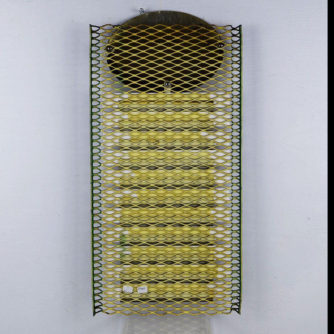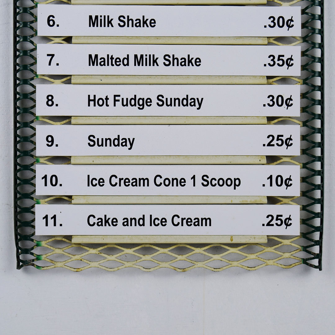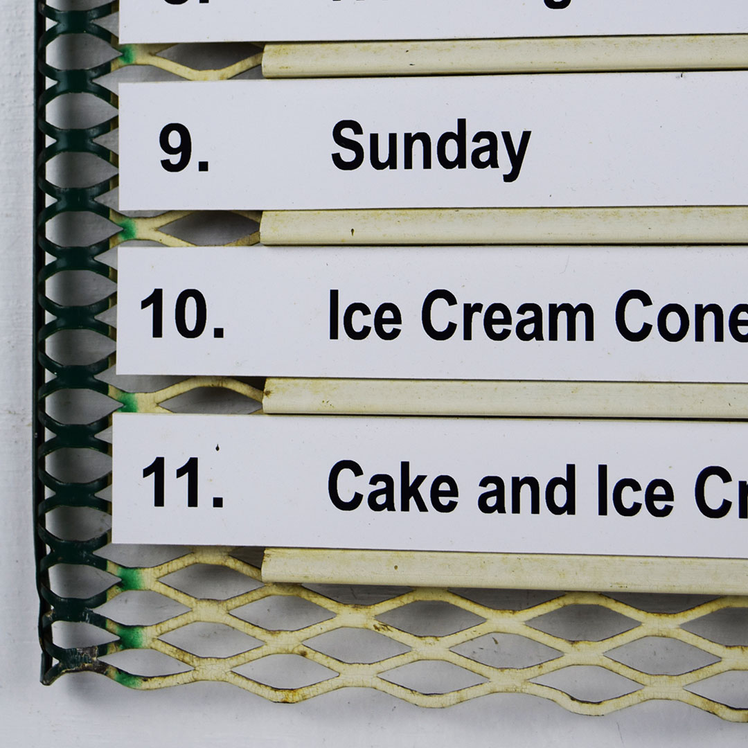Seldom seen, this metal Hood Ice Cream menu board would be right at home in your ice cream collection. The oval Hood Ice Cream sign at the top of the menu board features Hood’s cow logo along with their red and green colors on a white background. The top lip has a slight bend with minor chipping. The menu section is a wire mesh with 11 slots for different ice cream flavors. We added menu options instead of flavors to complete the menu board. Minor bends on the outer edges with slight paint loss. The sign retains the original chain on the back to easily hang from the wall. It measures 23 inches tall by 11.25 inches wide. Perfect size! 21065-ROP