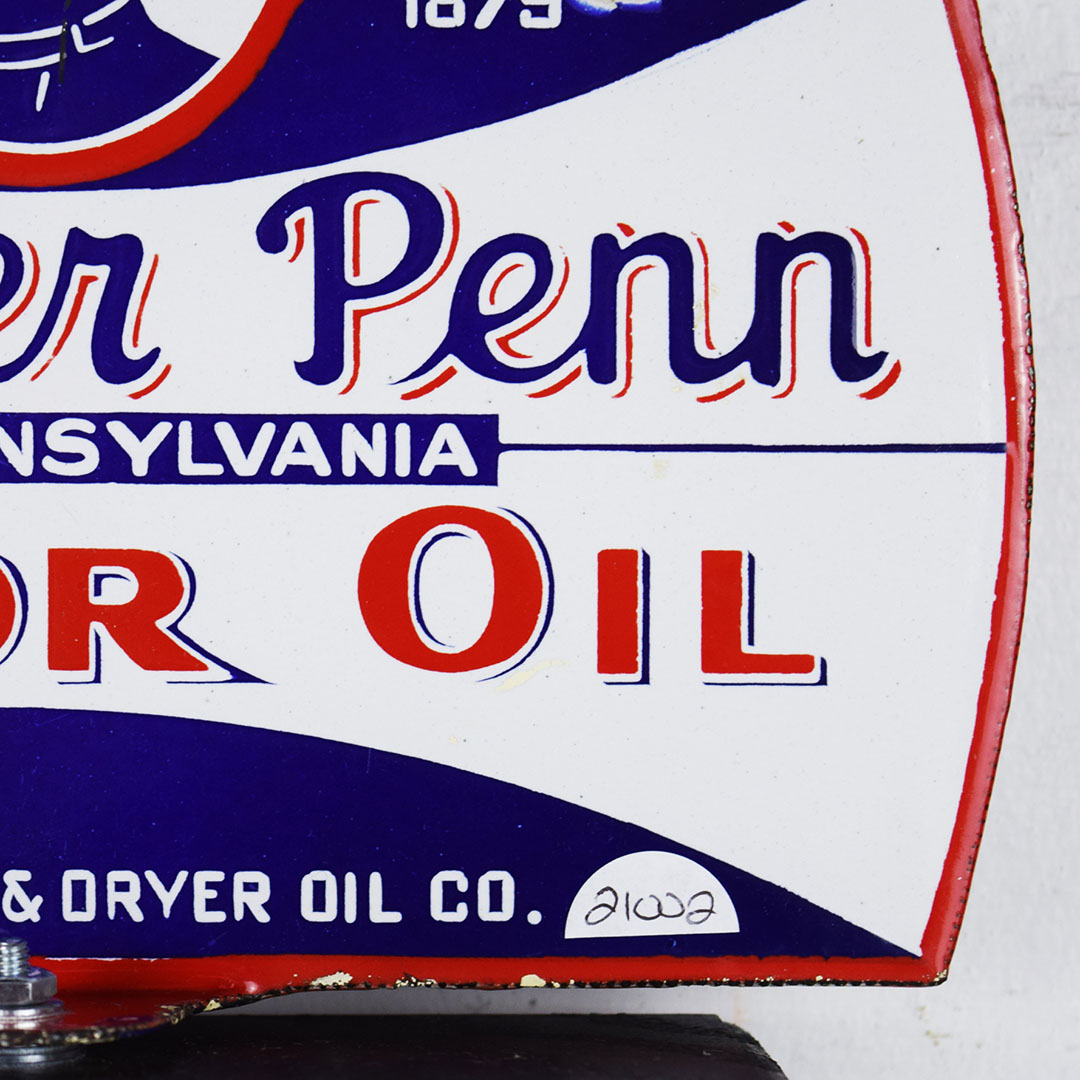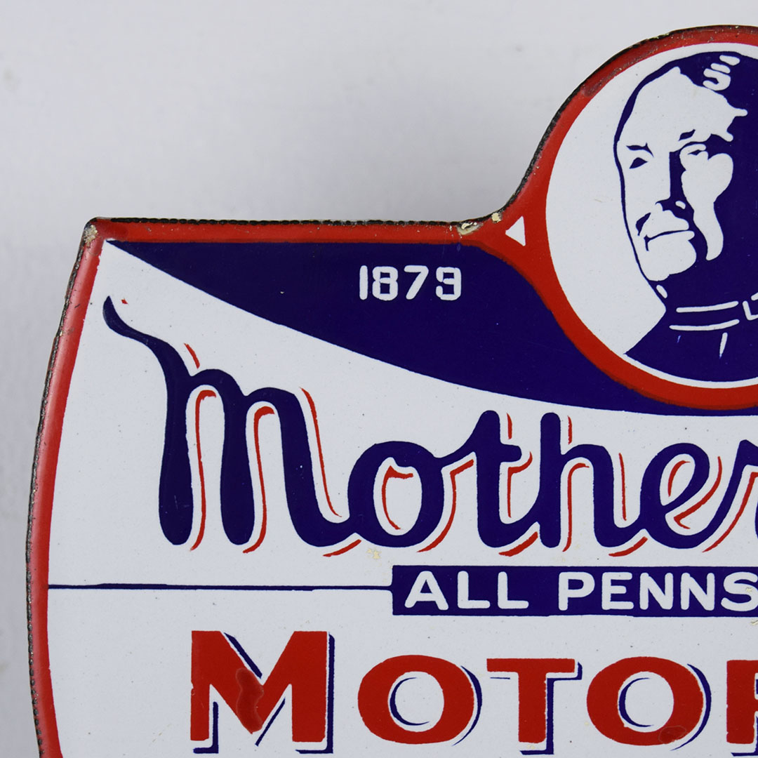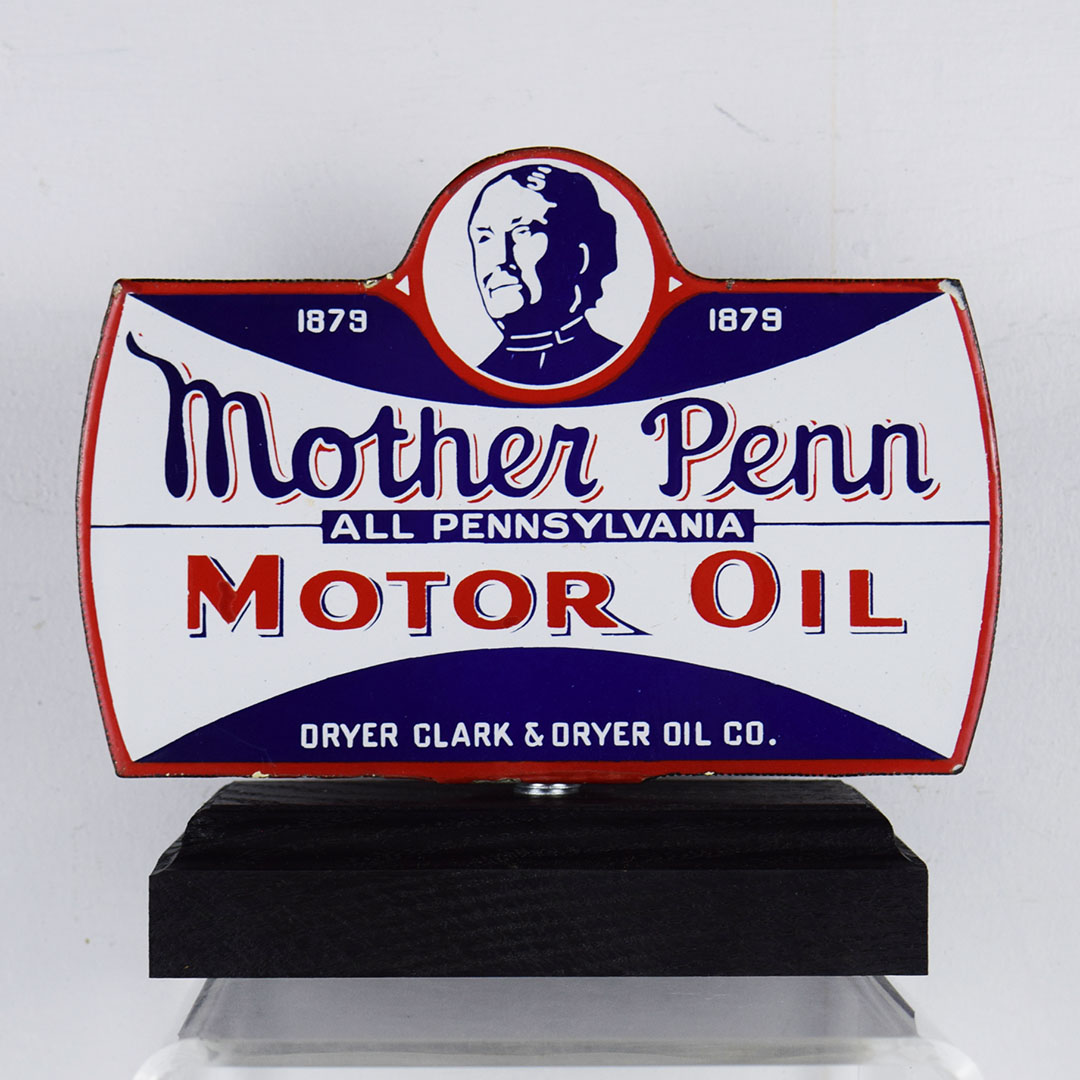 Designed for a hand-operated oil lubester, this porcelain double-sided Mother Penn Motor Oil sign lets the service station operator know which oil he is using. The trademark picture on the sign is that of John Dryer’s mother, Mrs. Minnie Dryer. This sign measures 6 inches tall by 8.5 inches wide and is rated 8.9. Minor chips along the bottom edge, with touchup on the flange edge. A half-inch porcelain chip is on the upper edge, and a minor chip is on the upper right corner on the opposite side. We have mounted it to a wooden base for display; this smaller sign will look amazing in your collection. 21002-QUIP