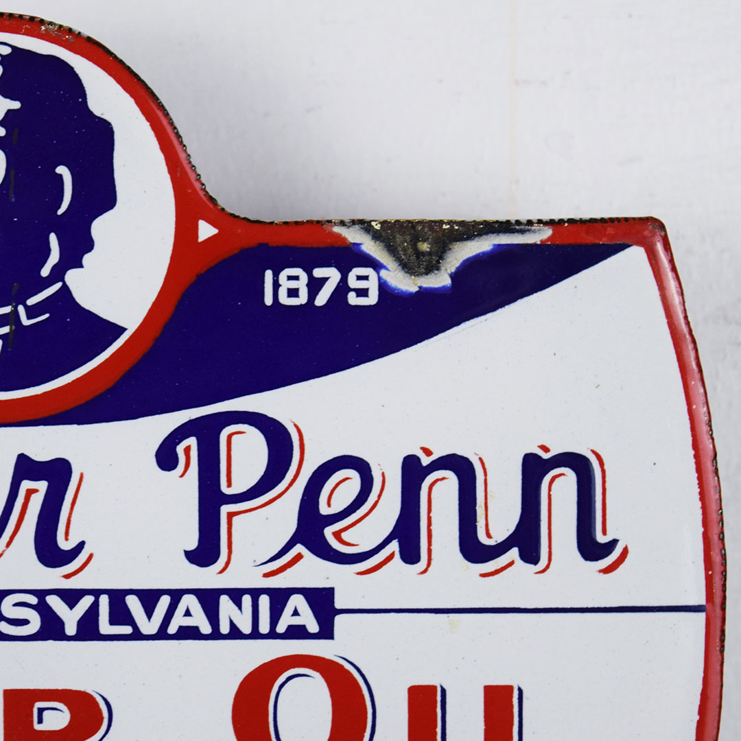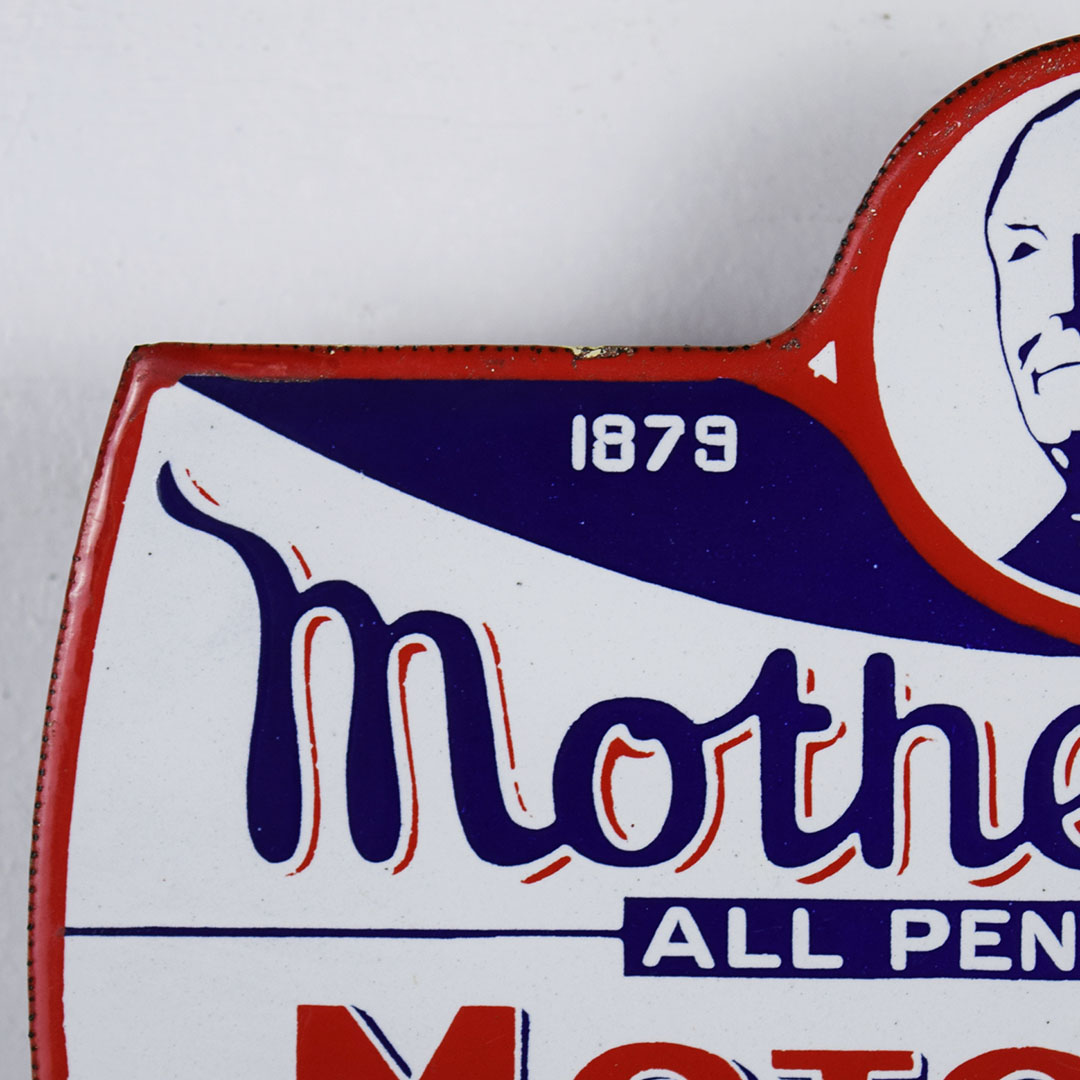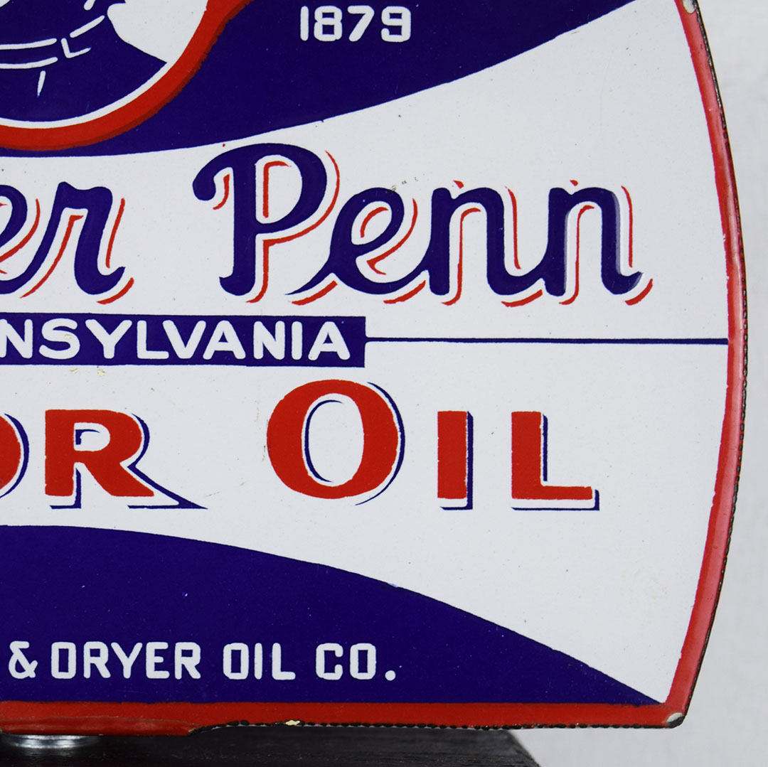 Designed for a hand-operated oil lubester, this porcelain double-sided Mother Penn Motor Oil sign lets the service station operator know which oil he is using. The trademark picture on the sign is that of John Dryer’s mother, Mrs. Minnie Dryer. This sign measures 6 inches tall by 8.5 inches wide and is rated 8.9. Minor chips along the bottom edge, with touchup on the flange edge. A half-inch porcelain chip is on the upper edge, and a minor chip is on the upper right corner on the opposite side. We have mounted it to a wooden base for display; this smaller sign will look amazing in your collection. 21002-QUIP