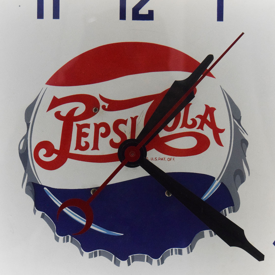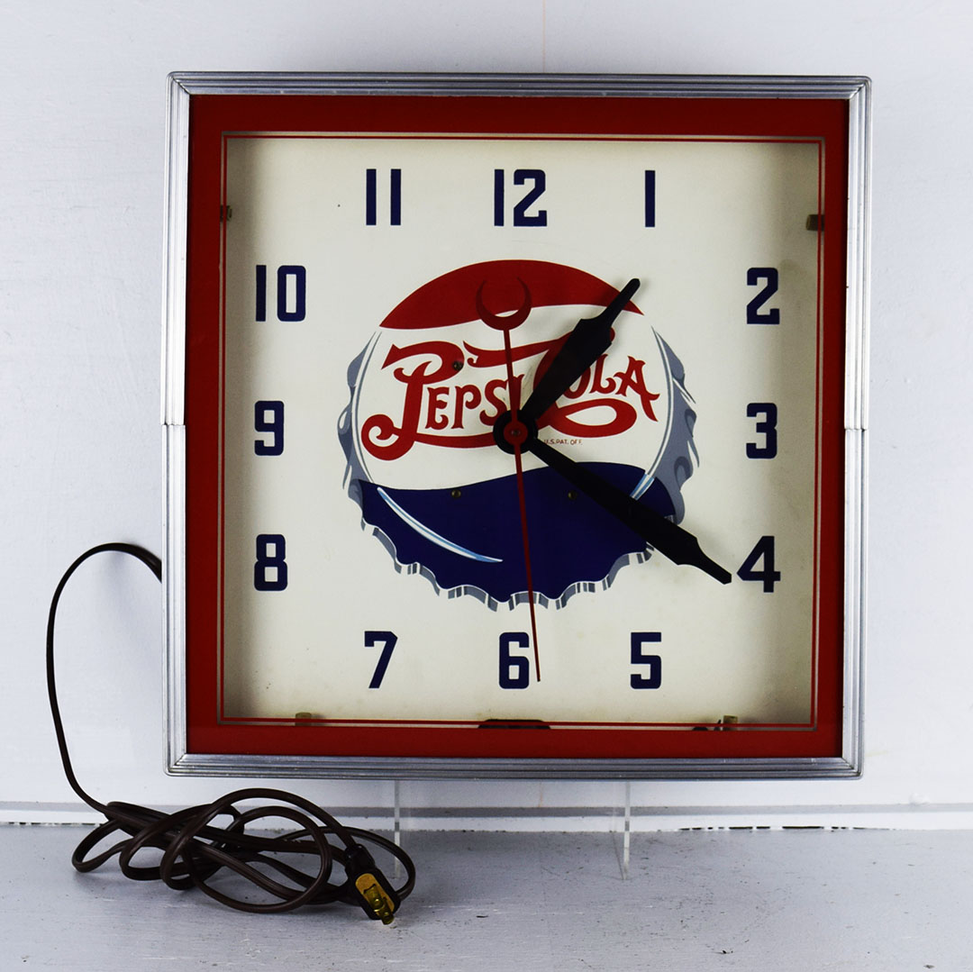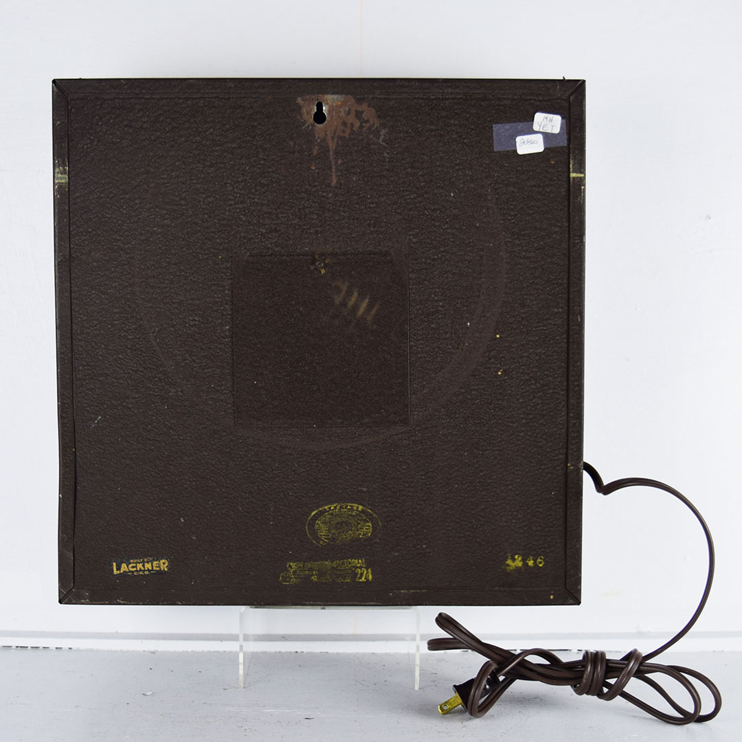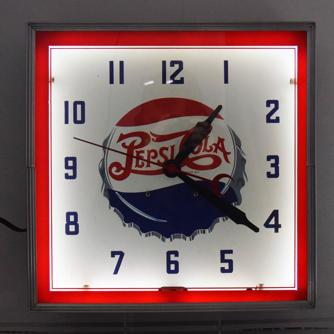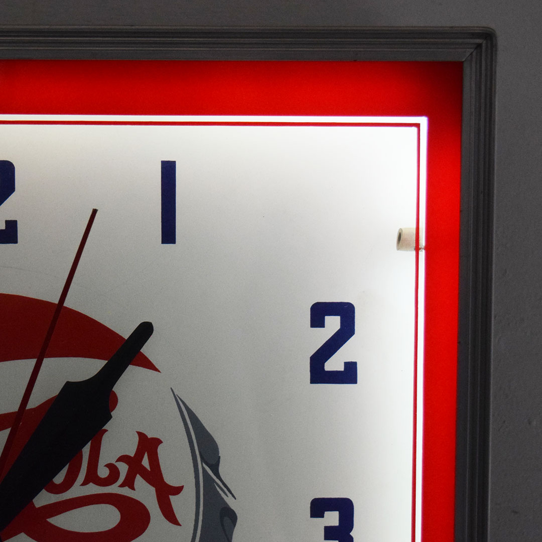 If you love rare clocks, we have one here for you! This seldom-seen Lackner Company neon clock features the iconic Pepsi Cola bottle cap logo in the center with a beautiful red border around the outer edge of the front glass. The front glass is gorgeous, as is the metal clock face. The colors are great on the Pepsi-Cola logo, with two minor scratches in the center. The clock works great when plugged in, and the neon lights up quickly. A slight hum emits from the neon, which is typical for the age of this piece. The metal cabinet has a painted texture finish and is stamped “Lackner” on the back, with an access panel. It’s tough to find these clocks today! 20860-YET
