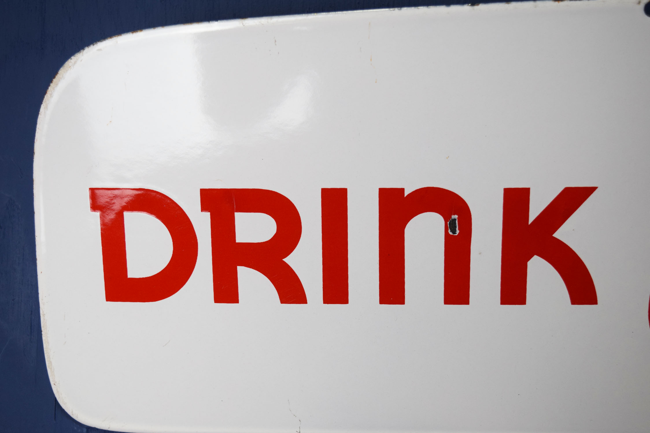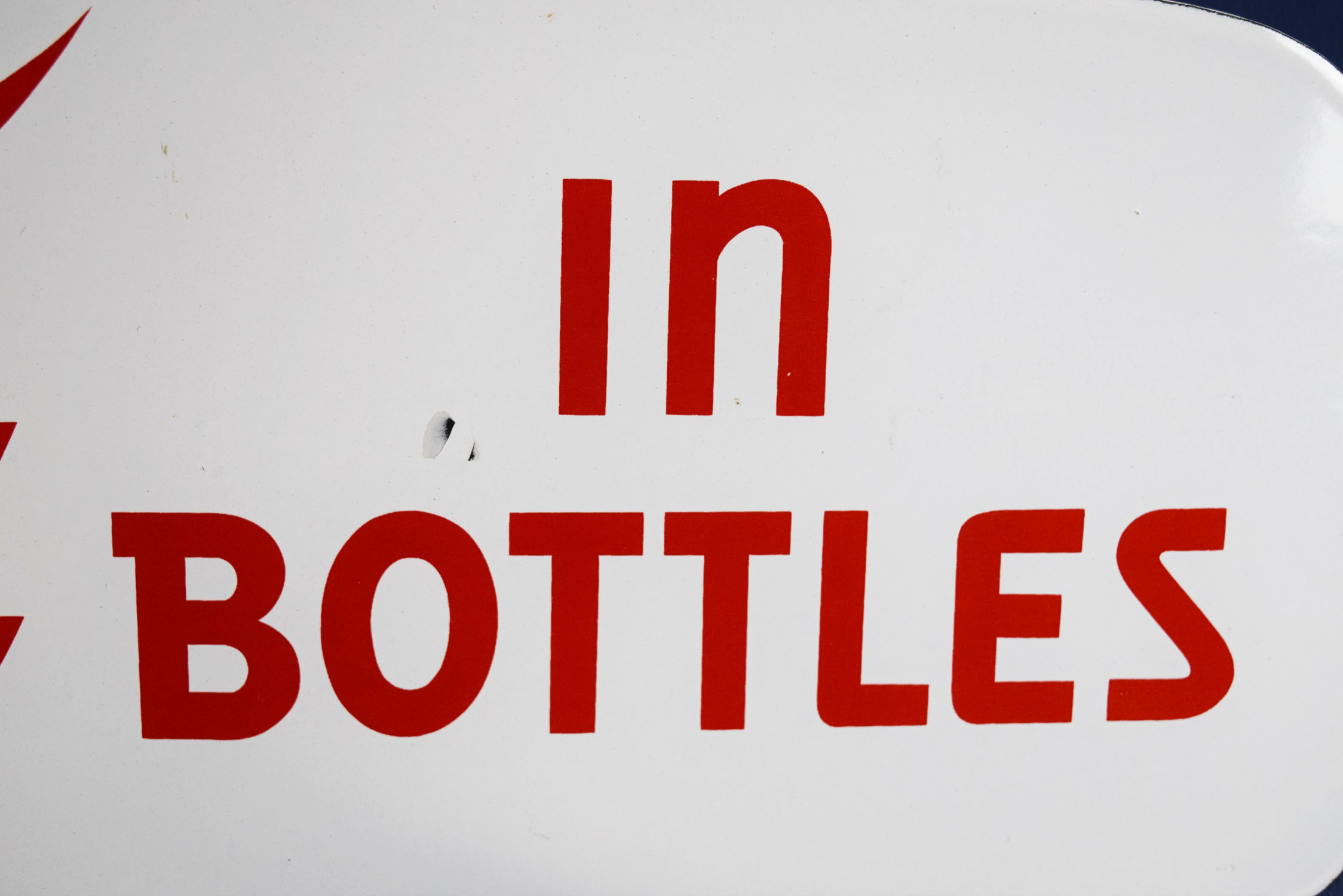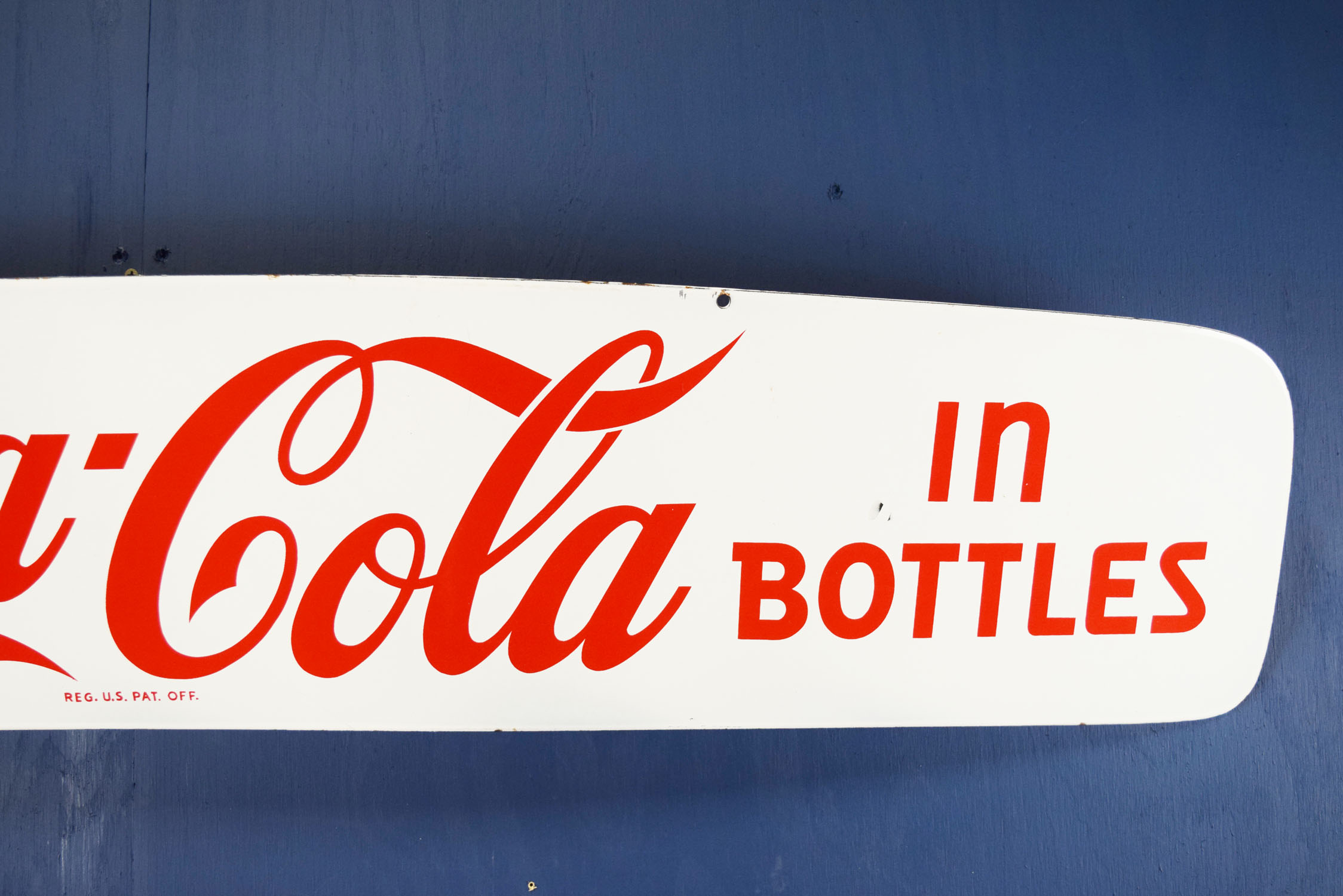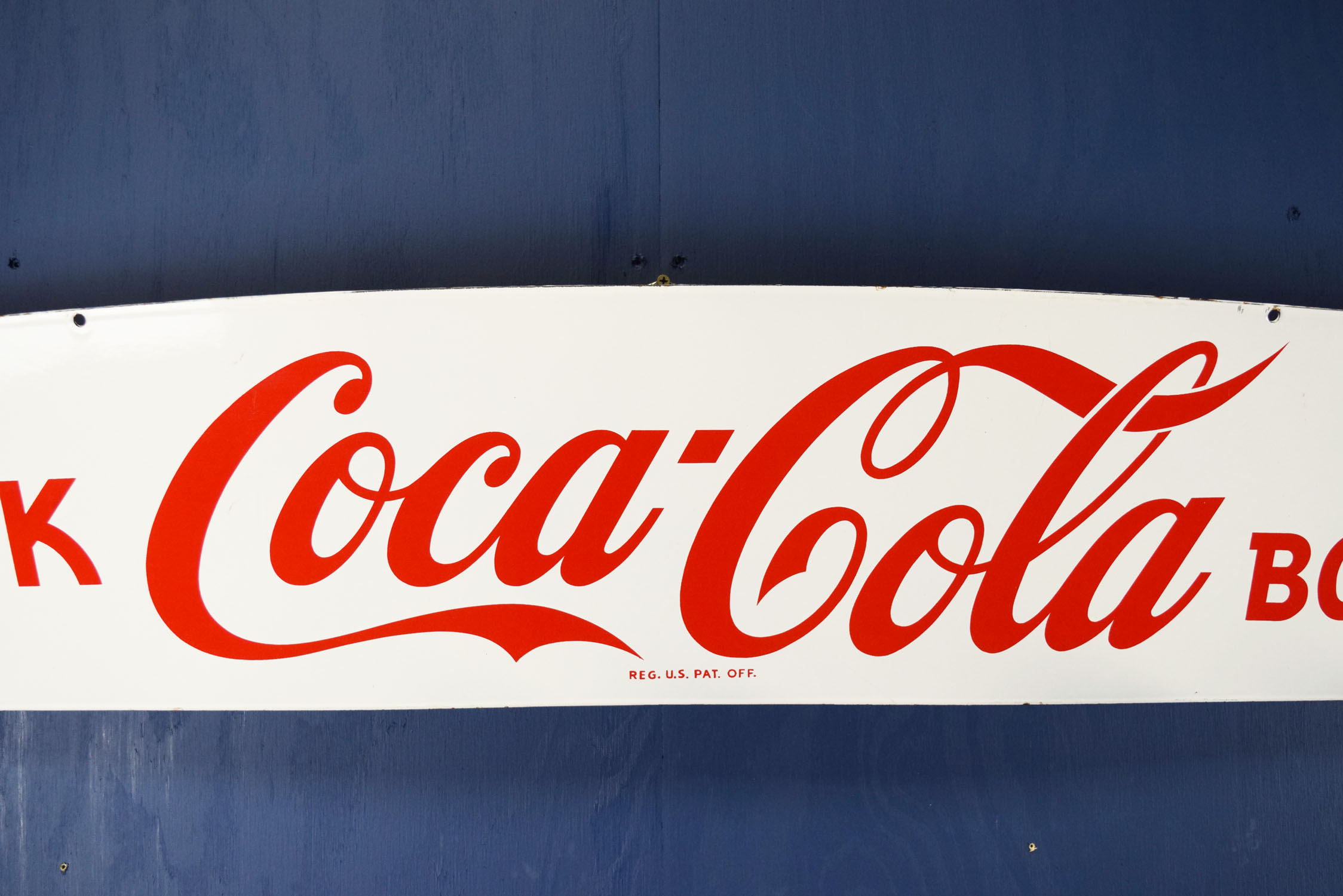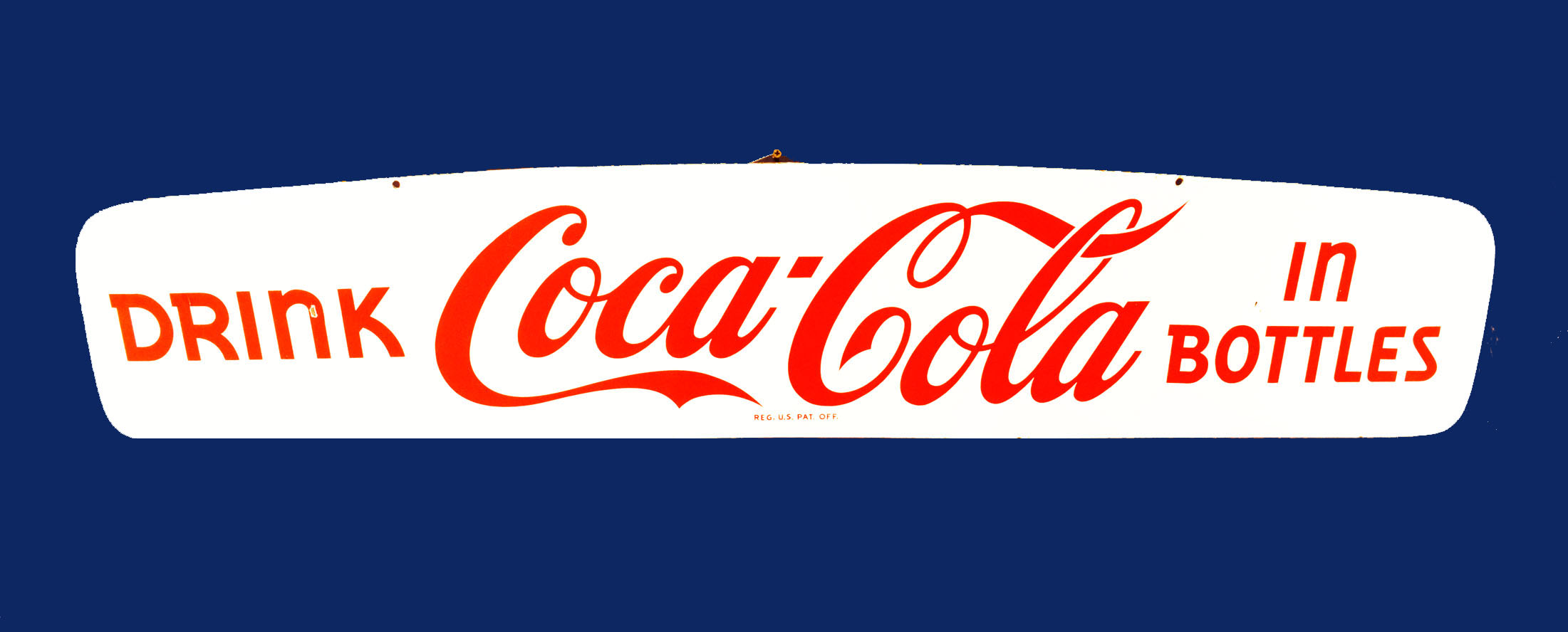 Dating from the 1950’s, this super nice “Drink Coca Cola In Bottles” porcelain sign was once attached to a Coca Cola delivery truck! It was mounted over the front part of the cab, over the windshield to accomplish a couple of things. One was to advertise Coca Cola on the front of the truck, so you could see the truck when it approached you, and the other to shield the driver’s eyes from the sun, as not many large trucks had sun visors in them. This visor has some amazing gloss with a couple small chips in the face. One in the ‘n’ in Drink, and two just above the ‘o’ in Bottles. Some minor chips on the outer edges can be seen as well. Very hard to find these visors, as they appeal to both automotive enthusiasts and Coca Cola collectors! This is an oversized shippable item. Please contact us for shipping info. 19471-QEWP
