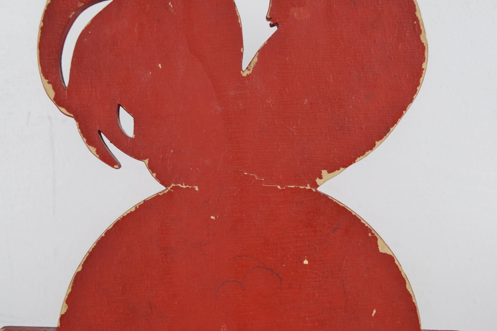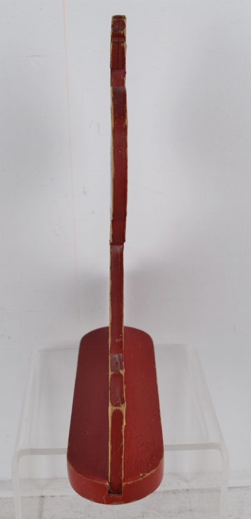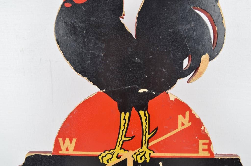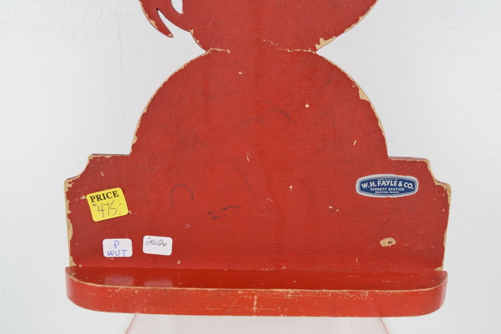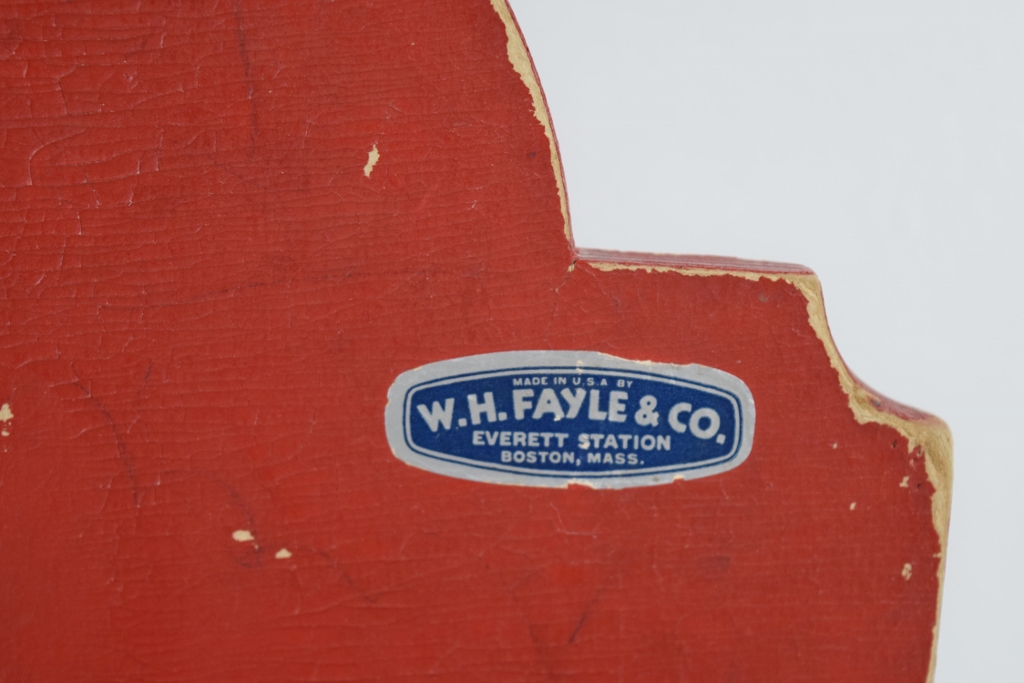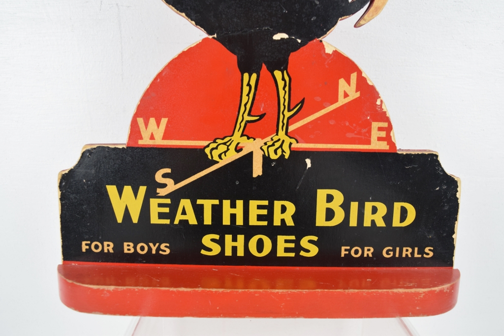 This rare display will look great with your other Weatherbird collectibles! Standing thirteen inches tall, the Weatherbird mascot is die cut, as is the base he is standing on. Some minor wear can be seen on the outer edges along with the tail feathers. This piece looks like wood, but is apparently heavy cardboard or pressed paper, and it has been bent slightly in the middle, causing it to crack. The reverse side has a decal “Made In U. S. A. By W. H. Fayle & Co. Everett Station Boston, Mass.”. Nice rare piece that is seldom seen. 20026-WUT
