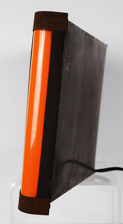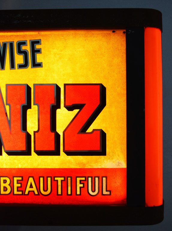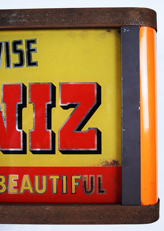 Dating from the 1940’s, this beautiful Simoniz car wax light up sign creates a magnetic attraction, and will look beautiful in your growing collection. The reverse painted center glass is housed in a metal cabinet with lights on each side covered by plastic covers. Some minor scratching and paint loss can be seen on the outer edges and the lower right corner of the glass sign, which reads “Motorists Wise Simonize” and “Makes Cars Stay Beautiful”. The outer plastic lenses are cracked, and you can see a minor dent with oxidation on the metal case. Once plugged in, a nice glow emits from the glass and sides, and it is ready to hang from the original metal chain! 20390-QPWP