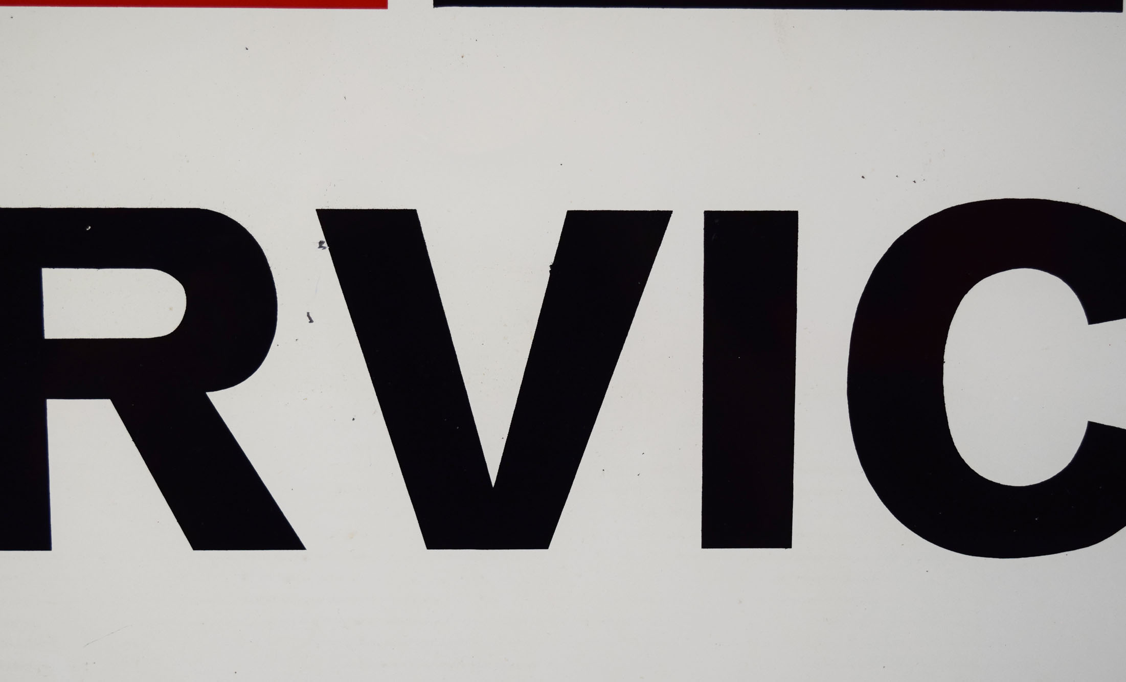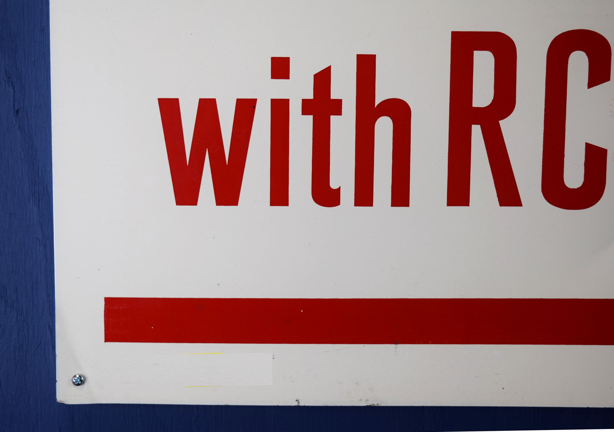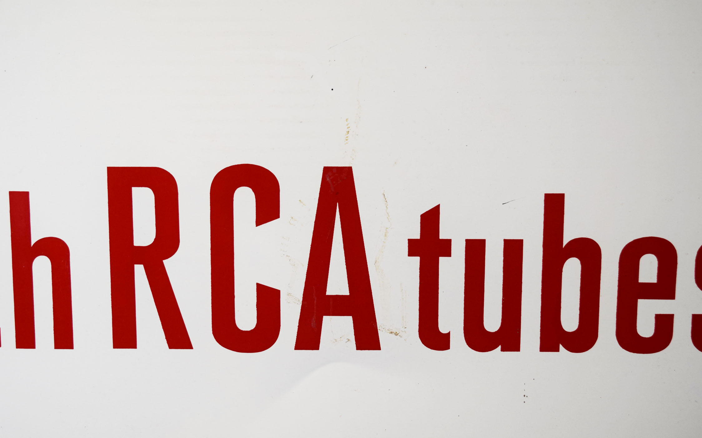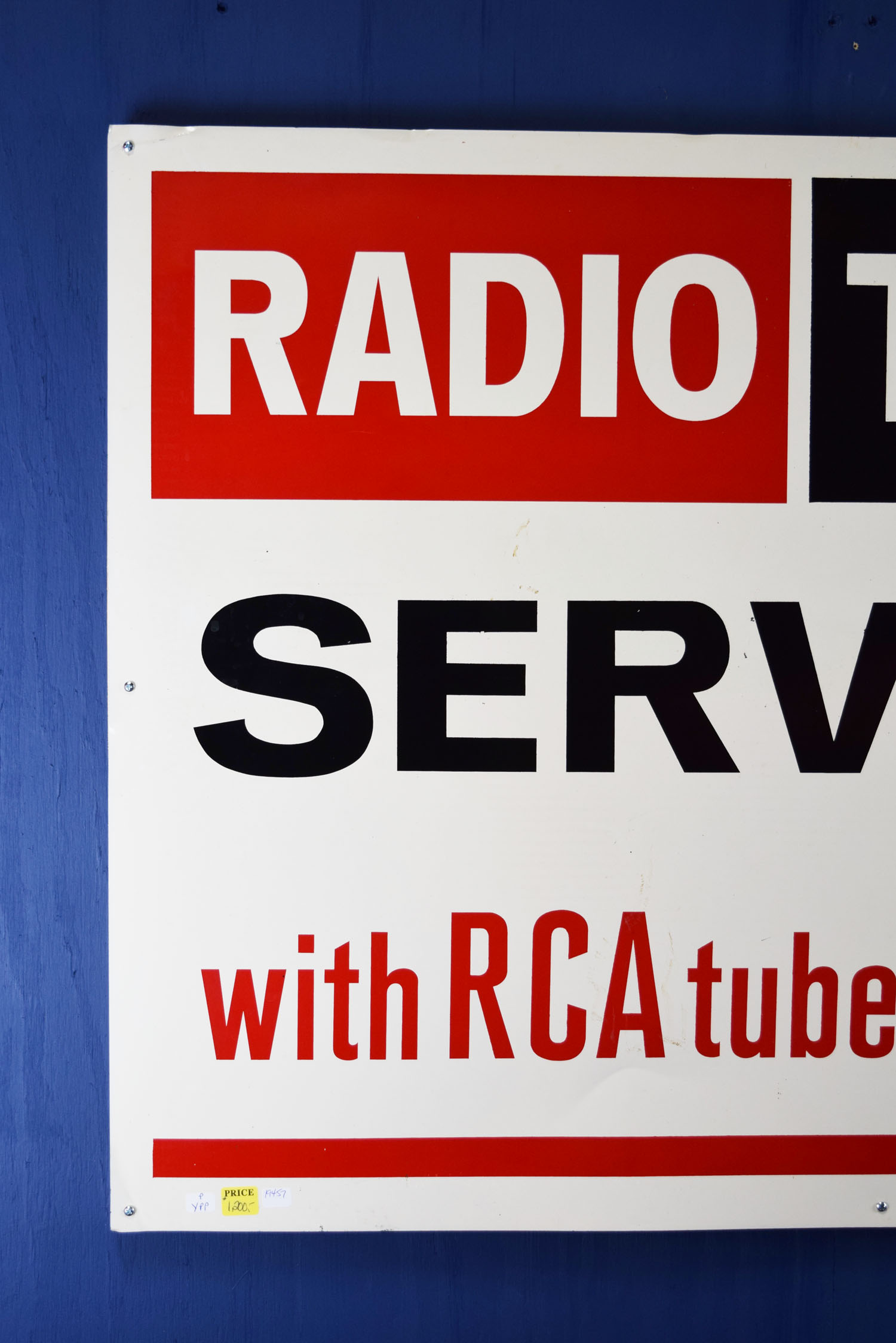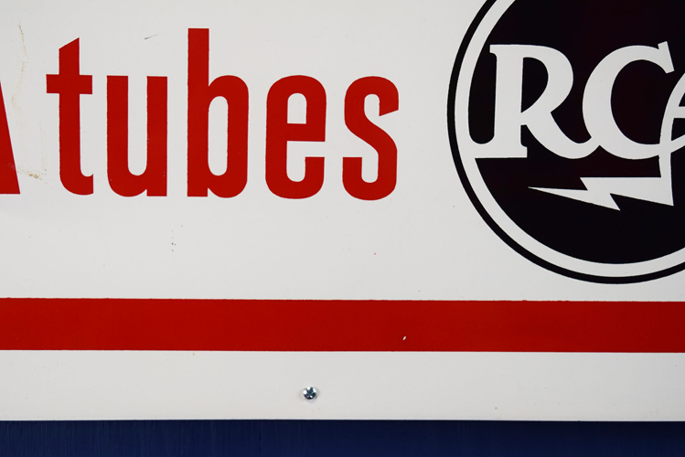Dating from the 1950’s, this RCA Electron Tube sign would have been hung outside your local RCA dealer, and probably had a statue of Nipper in the window! Measuring forty inches wide by twenty-eight inches tall, this tin sign has been mounted to a wood frame to give it some stability and an easy way to display. The outer corners have some small bends in them, along with a bend just below the RCA type on the bottom row. The colors are fantastic and the gloss is amazing for the age of this rarer sign. A few small scratches can be seen up close in the “Service” letters. Great sign that will remind you of a much simpler time! 19457-YPP
