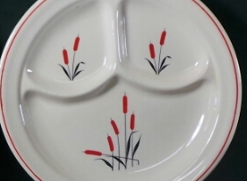 This group of three diner weight grill plates dates from the 1930’s or 1940’s and was manufactured by Universal Potteries in Cambridge, OH. Part of the Upico Ivory Line, these dishes were decorated in many different styles. These grill plates have the red cattail design with the red rim stripe. They measure nine and three quarters inches in diameter and are in excellent condition with no chips or cracks and only minor knife marks and small scratches on the decoration. The price is for the group of three plates. 9312-RT