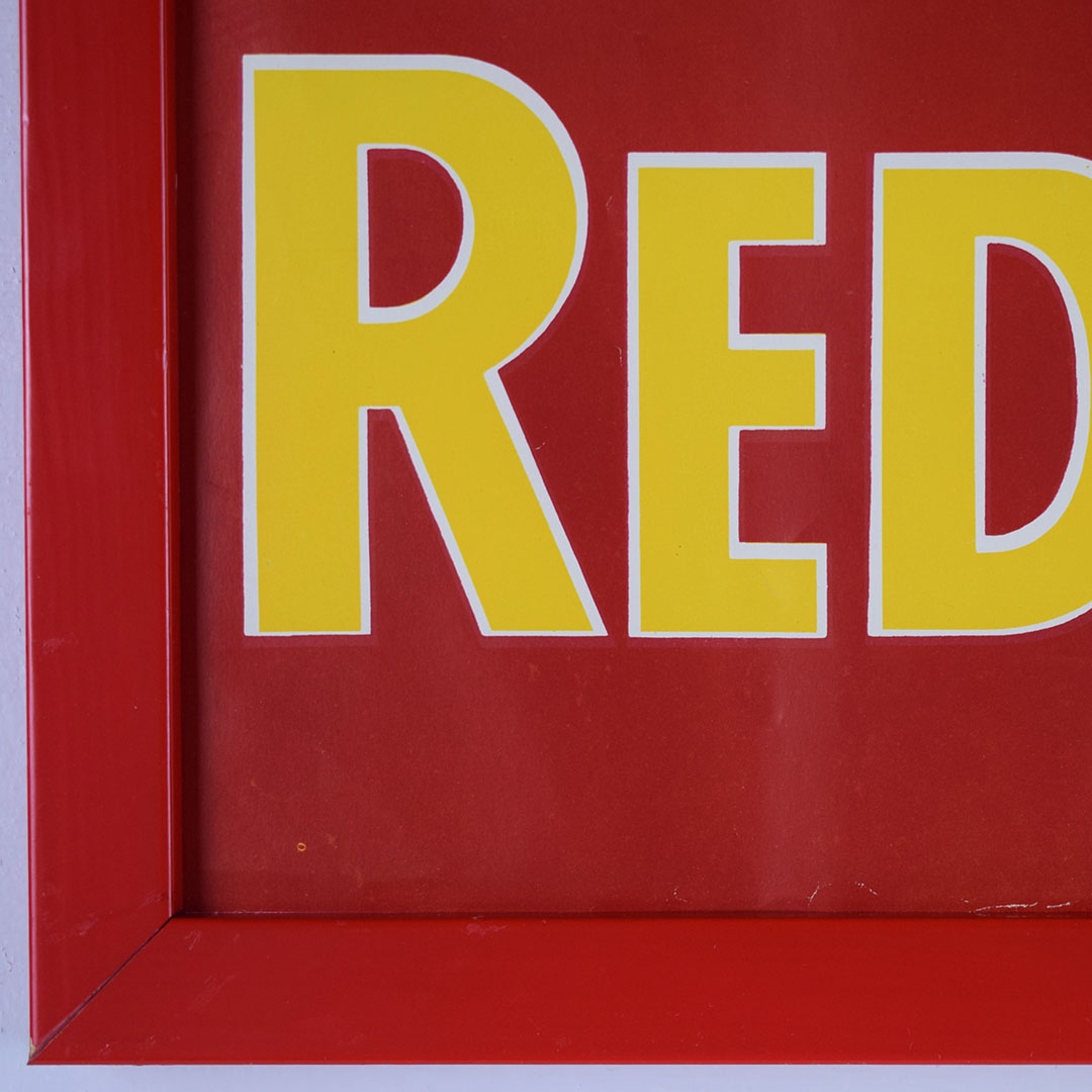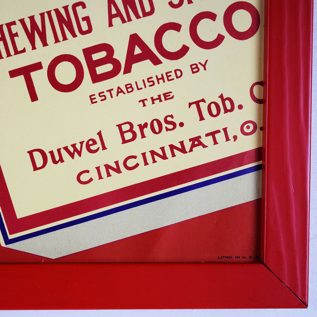 With plenty of color, this vibrant Red Horse Chewing Tobacco sign will brighten your wall! The sign is from the 1940s and was produced on paper. The lithographed images provide clean, legible images that grab your attention and bring you to the general store. “Chew that Good Chew” is the slogan, with “Red Horse” in yellow letters and a pack of Red Horse Chewing Tobacco on the right side. Some slight wrinkles in the paper are on the left and bottom of the sign. To display this sign with ease, we have added a simple frame. 21295-QPP