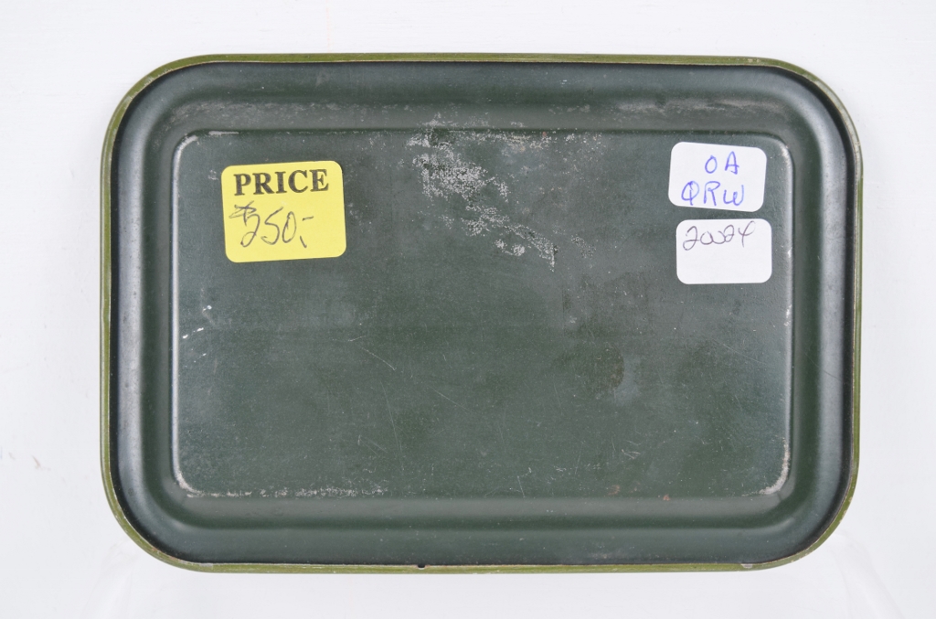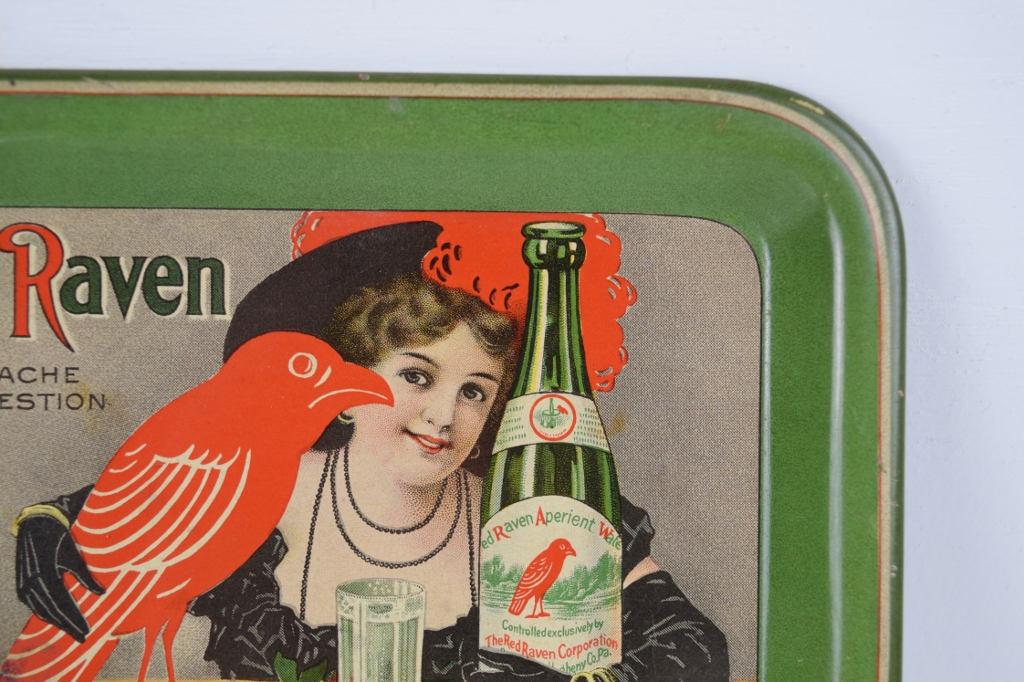 Rare and desirable, this small Red Raven tip tray features a lady with one arm wrapped around a bottle of Red Raven, the other wrapped around the Red Raven logo, and “For Headache For Indigestion” in the upper left corner. Only measuring four and a quarter inches tall by six and a quarter inches wide, the graphics and colors are amazing on this small tray. Some marks around the outer edge with a scratch at the bottom edge can be seen. The gloss on the tray is nice, with the smallest of blemishes in the upper left. Super nice tray that you will love. 20024-QRW