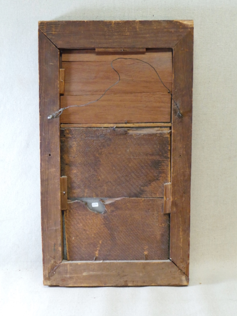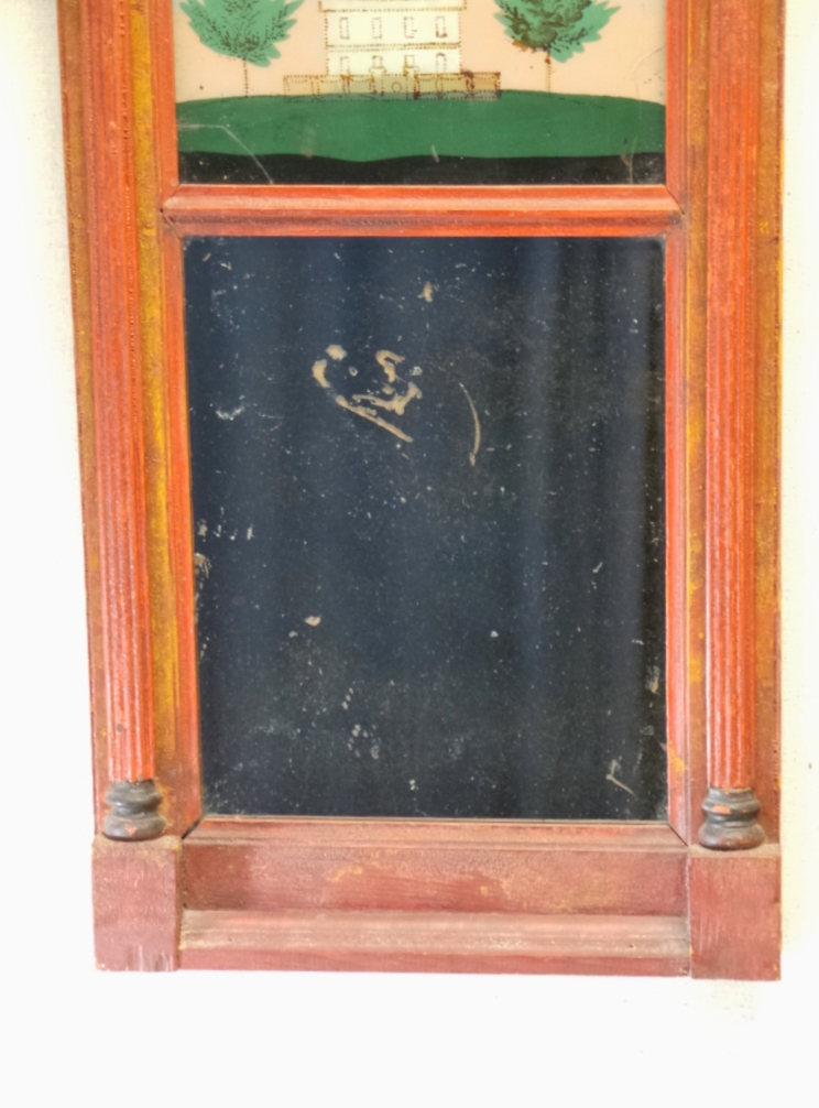Has been lovingly displayed in our home, now time to turn this piece of history to another to enjoy! Dating from the 1st quarter of the 19th century, this country made Federal style mirror has a reverse painted image of a farm house on the top glass and its original mirror glass below. The wooden frame is decorated with fluted columns on the sides, covered in newer barn red paint with soft yellow highlights. The reverse painted top has a great folk art image of a colonial home with trees on each side. This great piece has adored my dressing room for over 15 years. The mirror measures 21 inches tall by 12 inches wide and is in good condition with 2 cracks in the reverse painted upper panel, a palm sized area of silver peeling on the mirror, and a newer upper back panel. 1094-81WTP