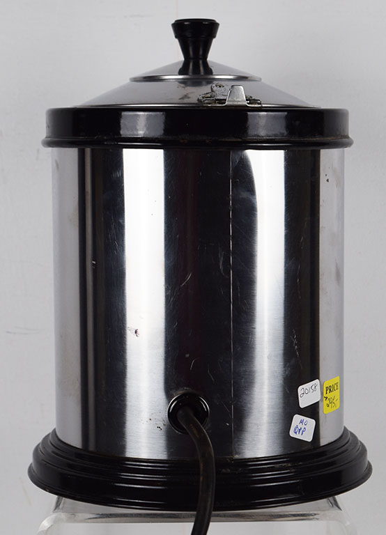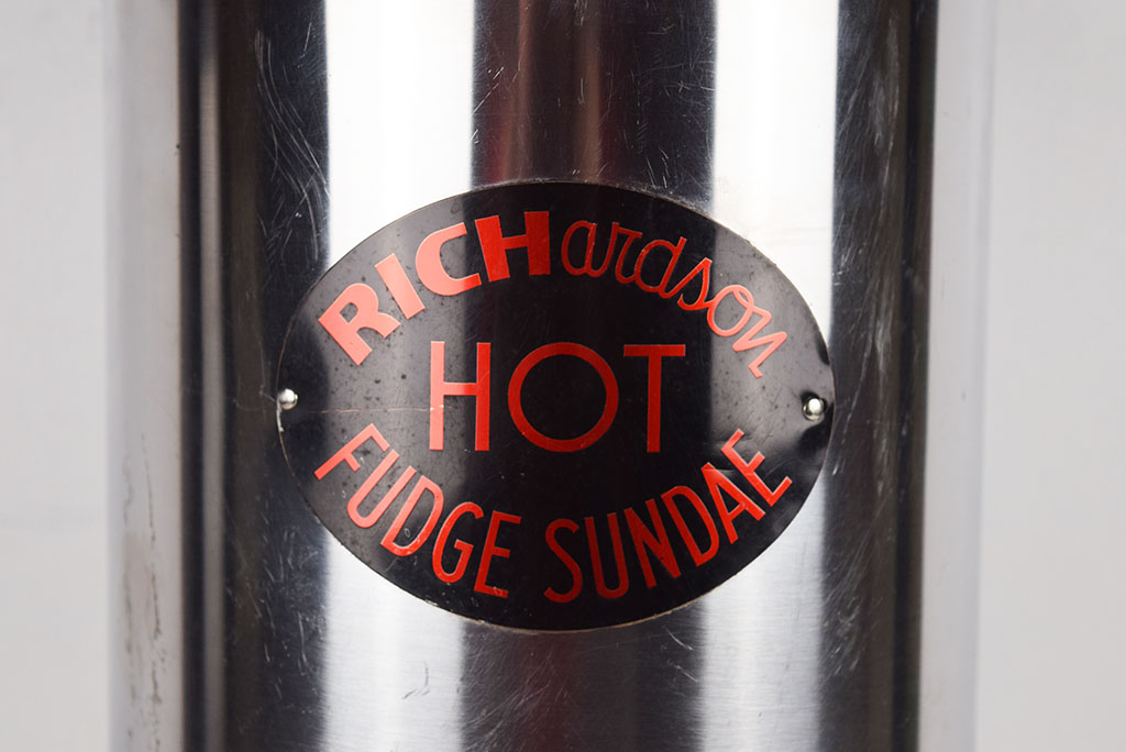 Perfect for your soda fountain setting, this Richardson Hot Sundae warmer has a separated ceramic pot inside so you could warm chocolate and another flavor of your choosing! It is marked “Moderne Automatic Fudge Warmer” on the bottom, and “Helmco, Inc.” also. The stainless trim looks good, with some small nicks from use over the years. The cord looks great, and it appears to be in working order. If you need just the right touch for your soda fountain display, check this warmer out! 20158-QPP