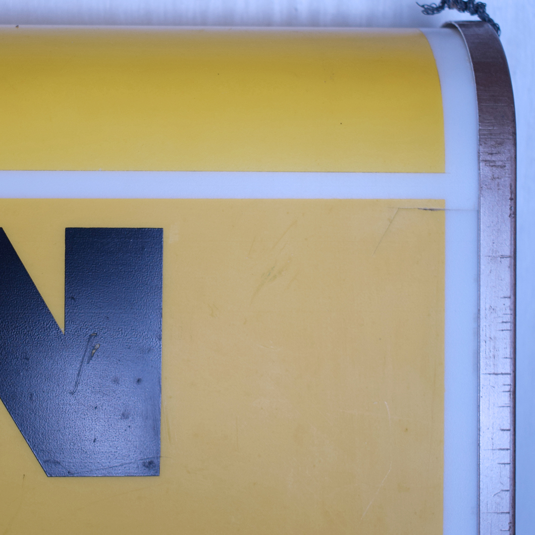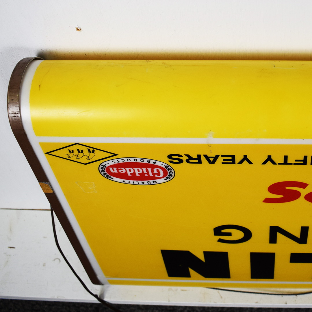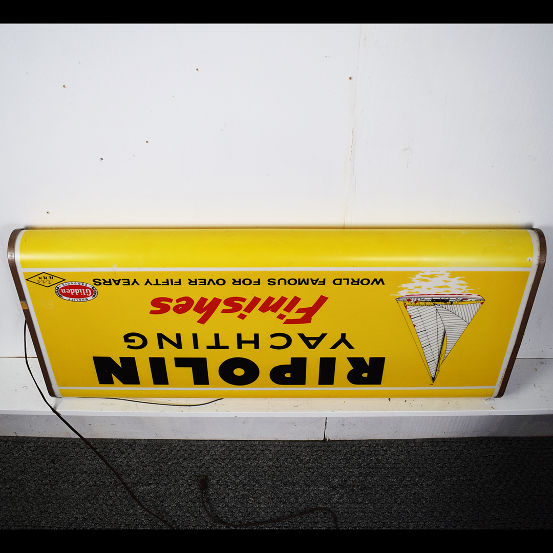 The 1950s witnessed a surge in boating, as increased leisure time allowed families to spend more time together. This light-up sign dates from the period when Glidden Products produced Ripolin Yachting Finishes for their marine division. It is perfect for your marine or paint collection, as I’m sure there are not many of these store signs left. The colorful plastic face features a white sailboat on a yellow background, accompanied by black and red letters. The face has a few light surface scratches, but the colors are sharp. The top and bottom edges of the sign are curved, and the outer ends feature removable metal covers that allow for replacing the bulbs inside. It measures 36.5 inches wide by 15.5 inches tall, and has a depth of 3.5 inches. 21383-IPP