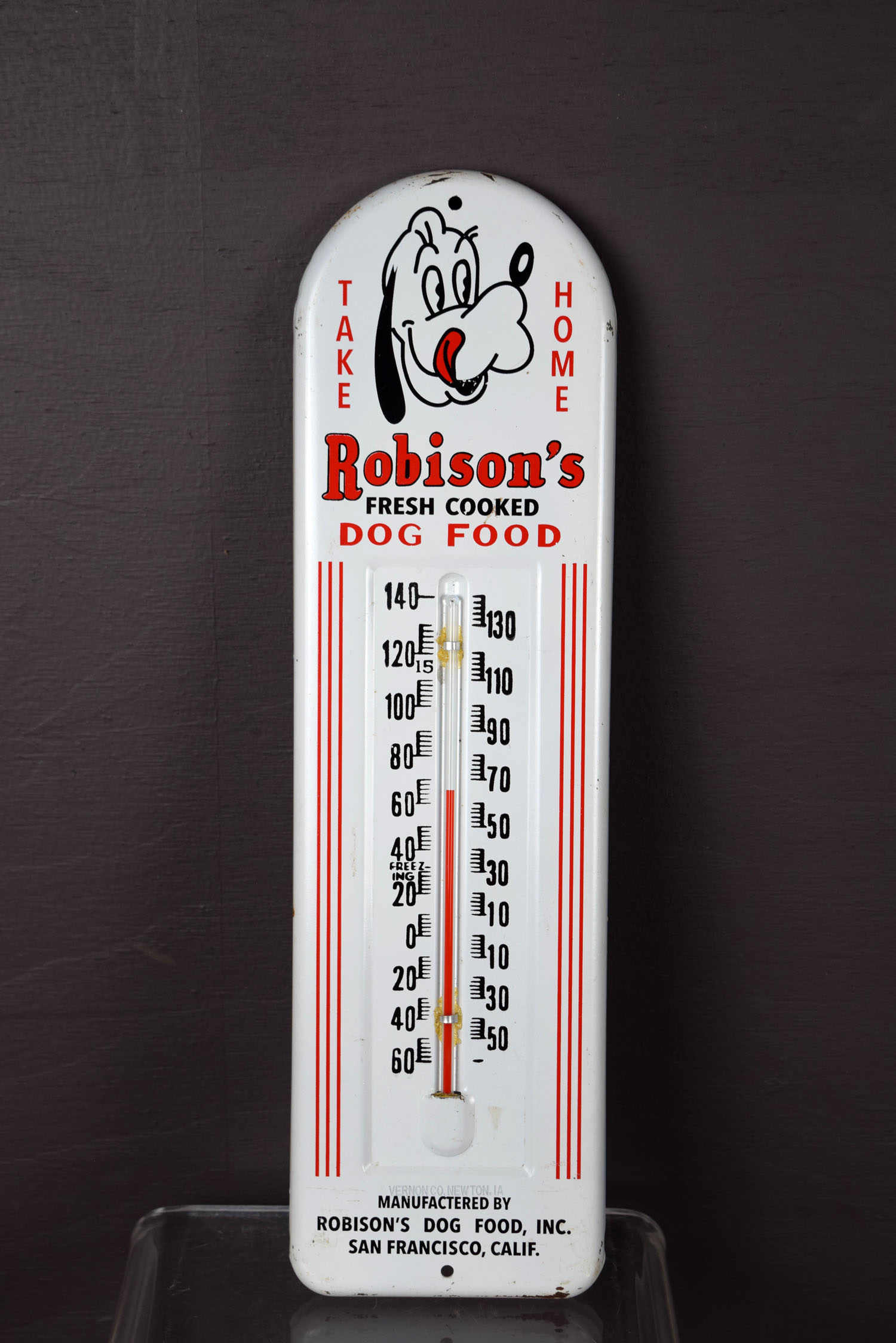 Just the right size, this vertical Robinson’s Fresh Cooked Dog Food thermometer features a rounded top with a happy dog! It measures thirteen and a quarter inches tall by three and three-quarter inches wide and works just like it should. The glass tube is undamaged, but appears to be glued to the metal housing. Some paint loss can be seen around the outer edge, along with some marks on the finish and graphics. 19910-WTP