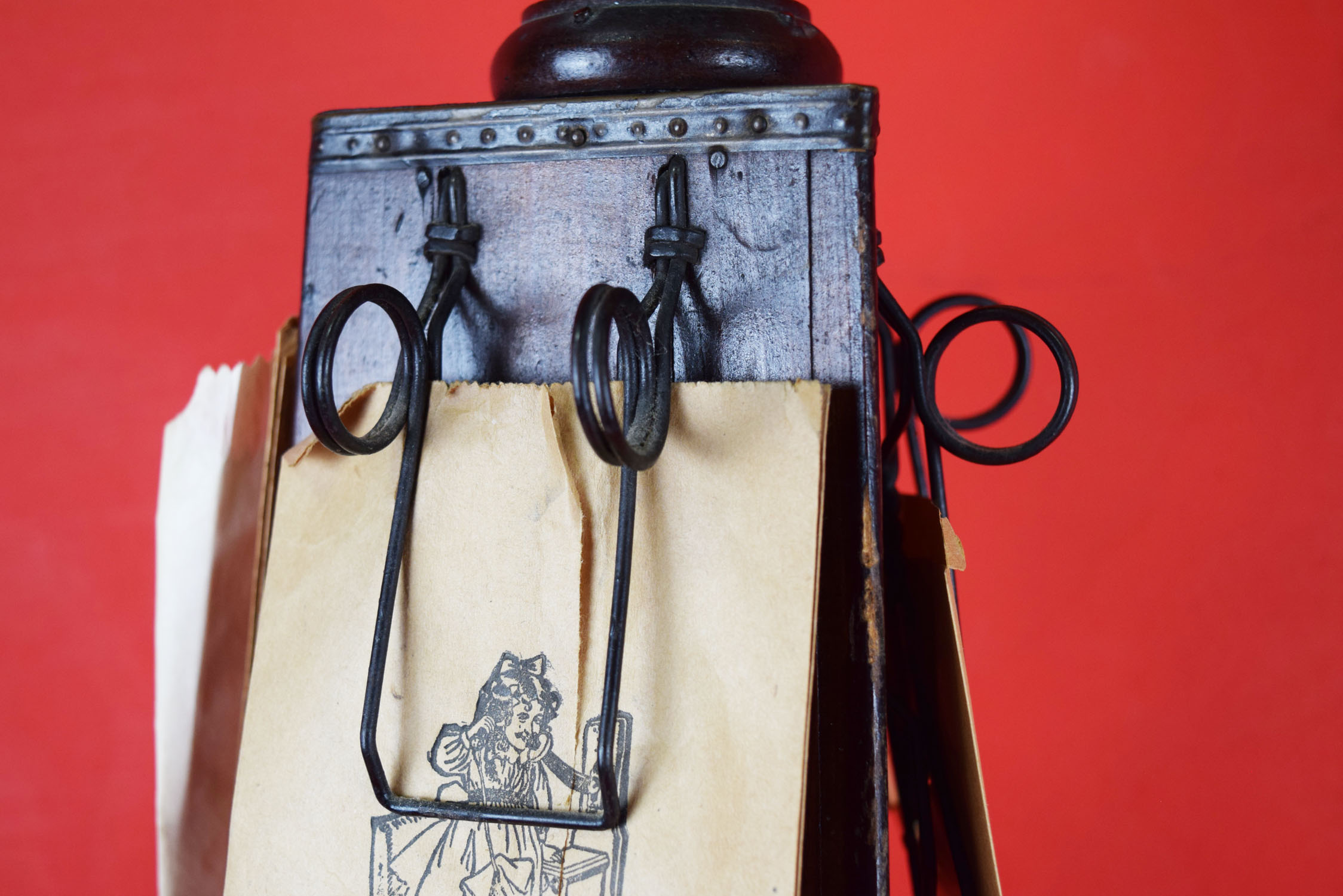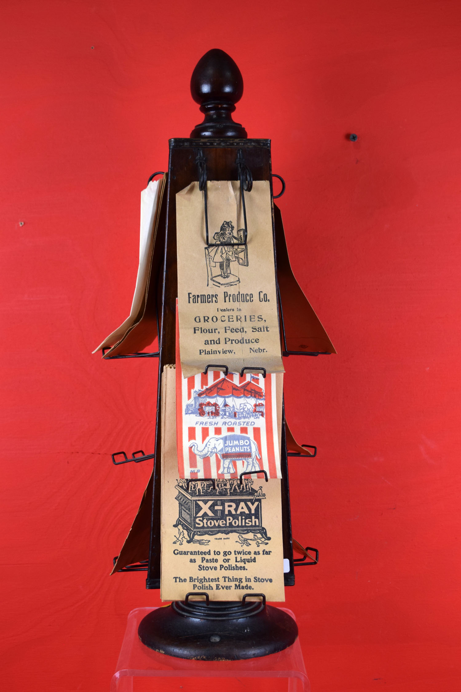 A staple in many country stores and general stores, this wooden bag holder kept bags within reach for the cashier or customer to use. It has a solid base and the holder rotates with ease, while holding multiple bags on the nine holders. The holders are metal, with the top having a spring to keep the top bags tight to the rack. Some minor wear can be seen on the outer edges of the wooden top that can be touched up if you wanted. The bags are included to make this holder stand out in your collection! 19771-RPP