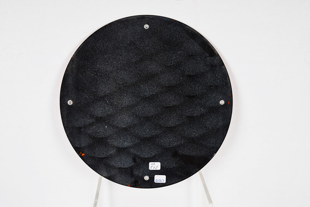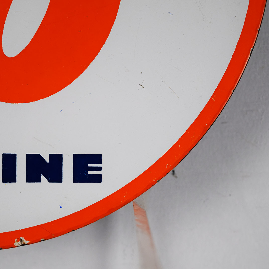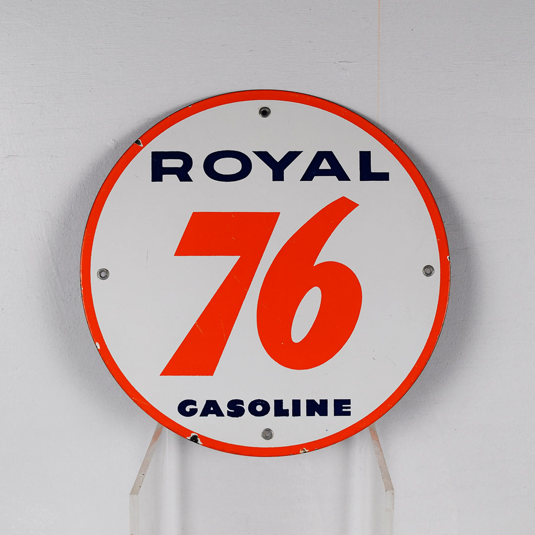 This excellent condition Royal 76 Gasoline pump plate dates from the 1950s and has a glossy porcelain finish on the face. It measures 11.5 inches across and top to bottom. The outer edge has a few smaller chips in the porcelain, along with some tiny cracks. The field finish is glossy with a few light scratches that just barely catch your fingernail. The colors are great on this pump plate, and it retains the four original aluminum mounting grommets. 20547-TYP