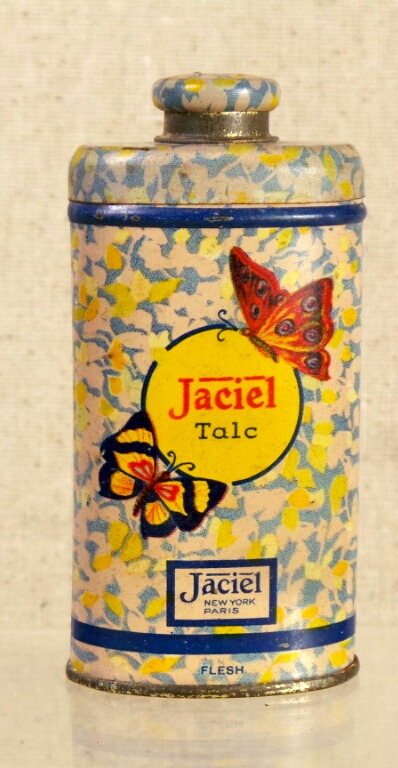 This dainty little tin held a free sample of Jaciel Talc. It has a floral background decoration with a pair of colorful butterflies flitting around a round, yellow emblem inscribed “Jaciel Talc.” Jaciel was a brand sold at J. C. Penney’s department stores. The tin dates from the 1940’s or 1950’s, measures three and a quarter inches tall by one and a half inches wide and is in excellent condition with minor fading and a few tiny nicks. 9499-51QO