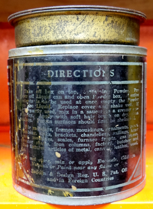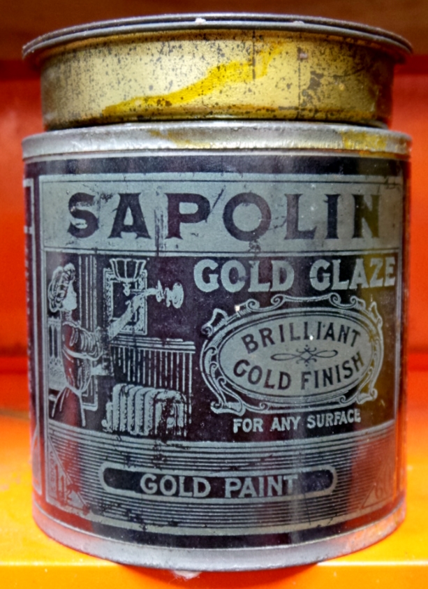 This little 1/2 pint soldered tin paint can dates from the 1890s and has a paper label with an image of a Victorian lady painting a gas light fixture and the inscription “Sapolin Gold Glaze Brilliant Gold Finish For Any Surface.” The tin measures 3 1/2 inches tall by 3 inches in diameter and is in excellent condition with minor stains and wear on the label. 6968-00QP