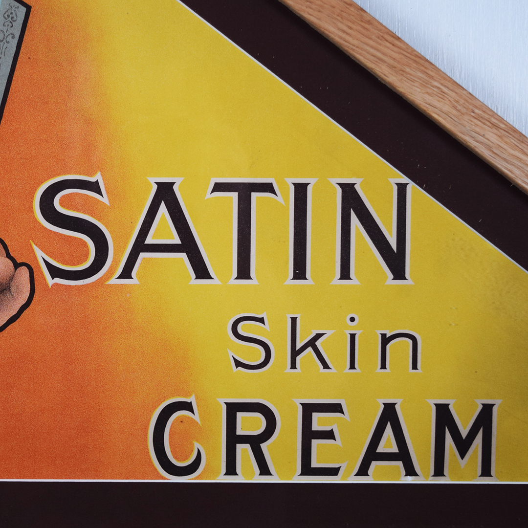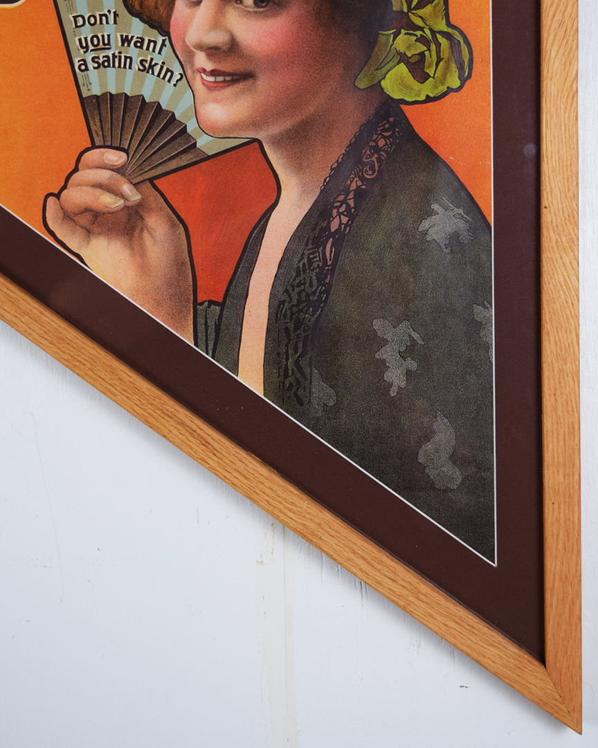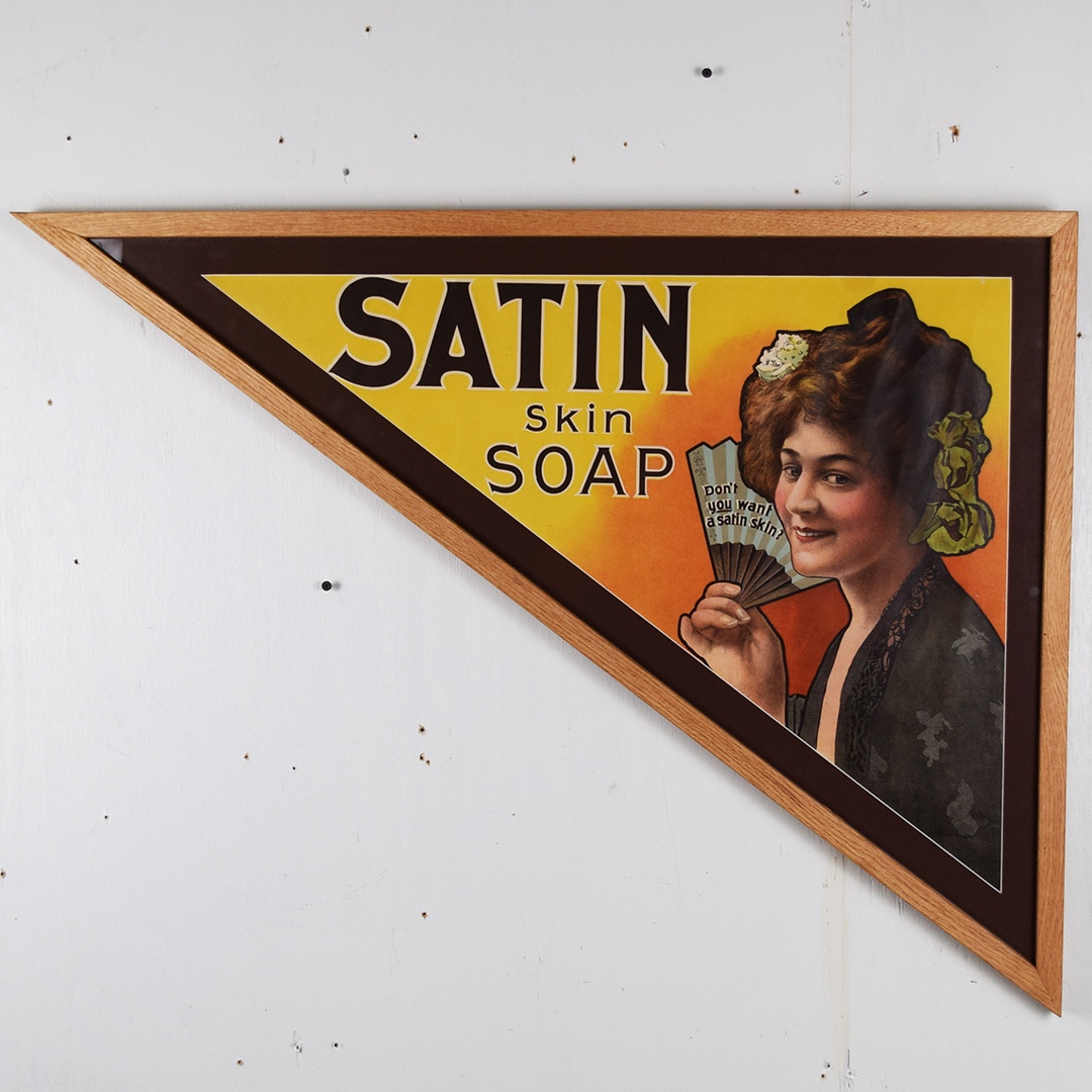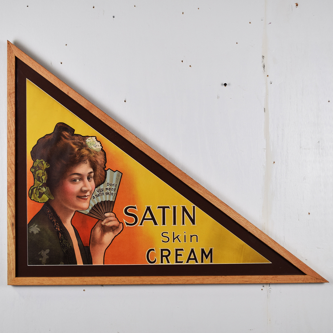 This pair of framed Satin graced the corners of a window display from the early 1900s. Each triangle part would have been placed in the front window to grab customers’ attention, and they would decide to see what the ads were about. Satin skin soap features sharp colors, with a small tear along the right edge, and a small tear in the word “Satin”. It is designed to fit in the upper right corner of the window. Satin skin cream also features sharp colors and is free of damage. This one is designed to fit in the lower left corner of the window. Both have been professionally framed by Taylor’s Frames & Things, with a beautiful mat and wooden outside frame, ready to hang in your collection. Measurements are 25.5 inches tall by 34 inches long, and you are purchasing the pair for one price. 21427-RPP