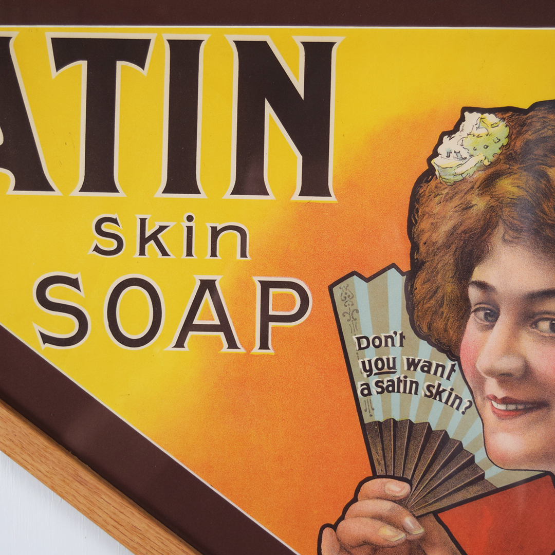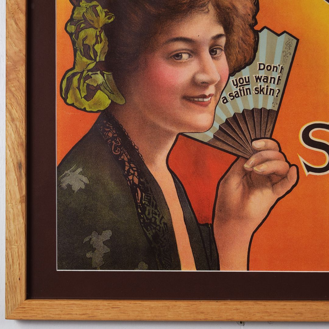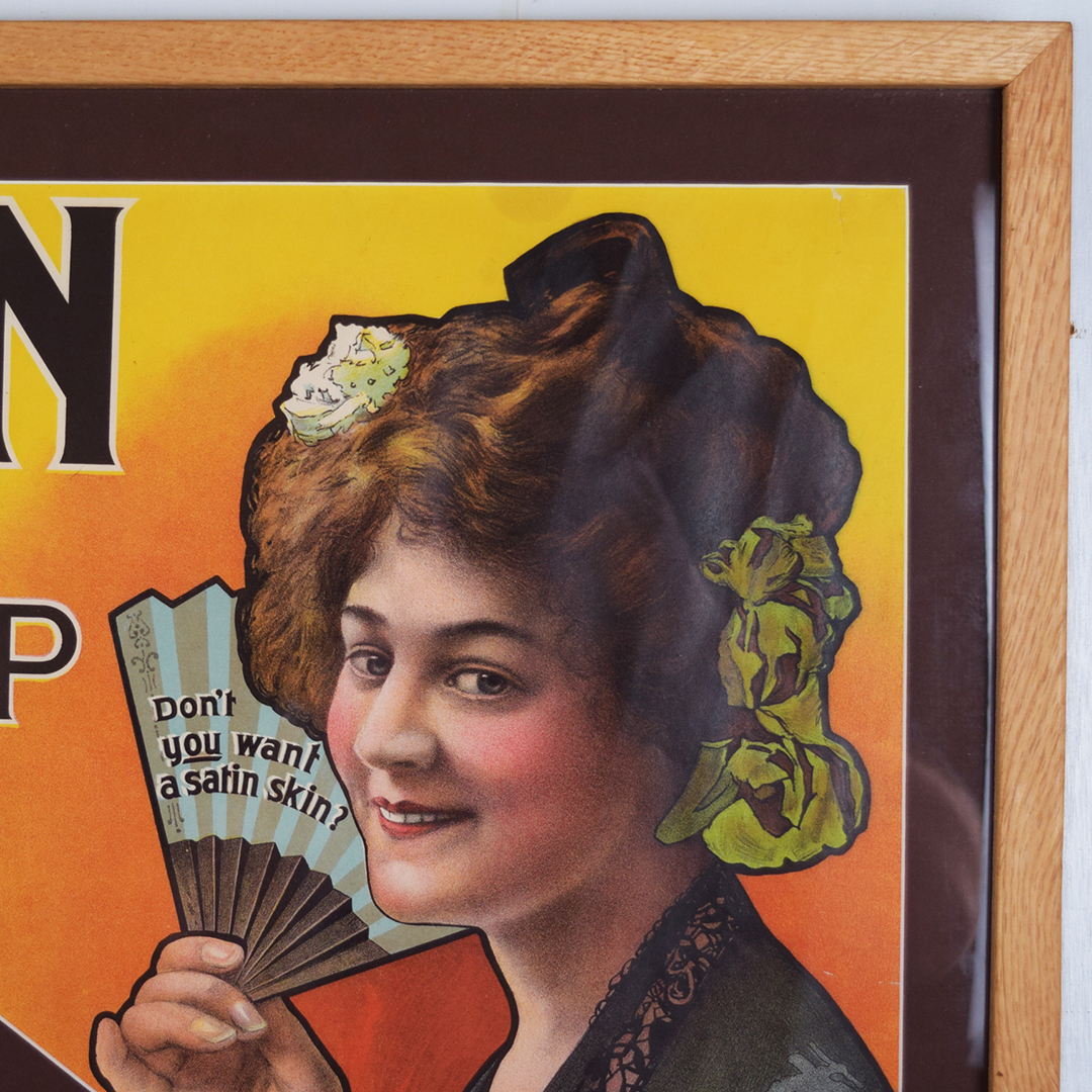 This pair of framed Satin graced the corners of a window display from the early 1900s. Each triangle part would have been placed in the front window to grab customers’ attention, and they would decide to see what the ads were about. Satin skin soap features sharp colors, with a small tear along the right edge, and a small tear in the word “Satin”. It is designed to fit in the upper right corner of the window. Satin skin cream also features sharp colors and is free of damage. This one is designed to fit in the lower left corner of the window. Both have been professionally framed by Taylor’s Frames & Things, with a beautiful mat and wooden outside frame, ready to hang in your collection. Measurements are 25.5 inches tall by 34 inches long, and you are purchasing the pair for one price. 21427-RPP