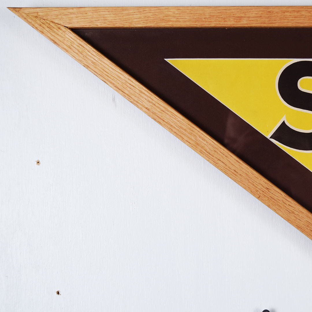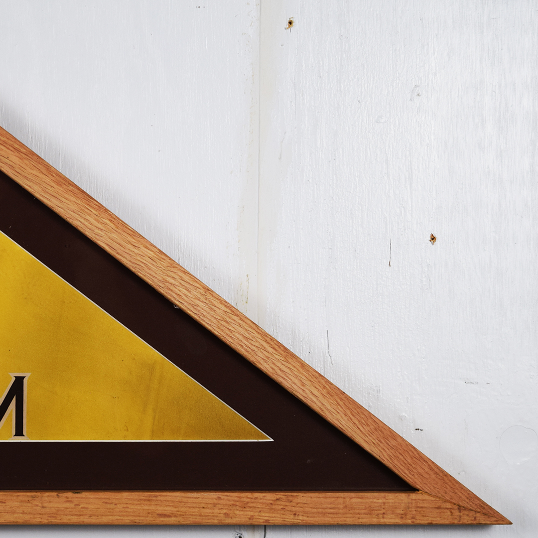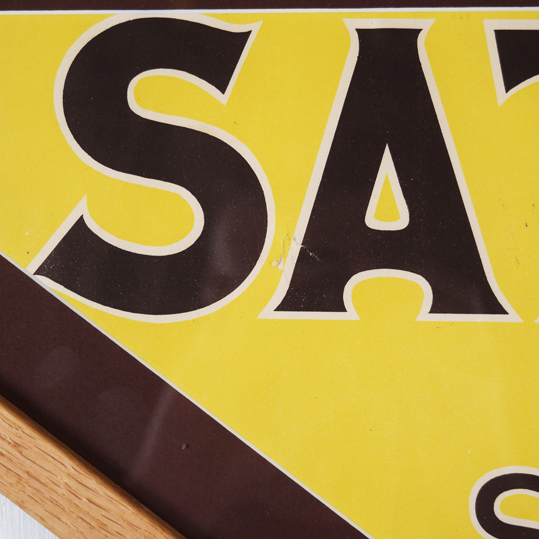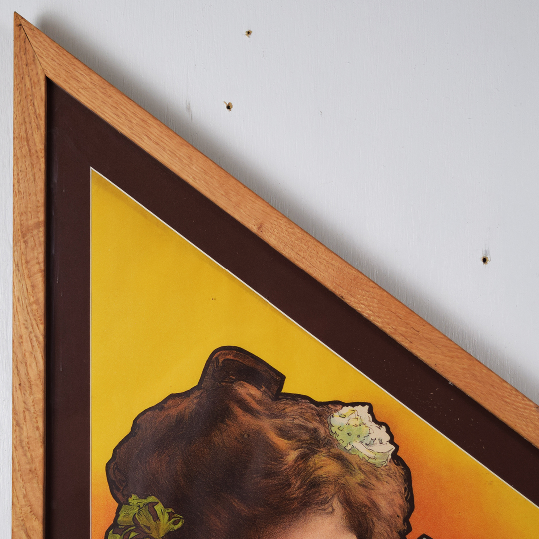 This pair of framed Satin graced the corners of a window display from the early 1900s. Each triangle part would have been placed in the front window to grab customers’ attention, and they would decide to see what the ads were about. Satin skin soap features sharp colors, with a small tear along the right edge, and a small tear in the word “Satin”. It is designed to fit in the upper right corner of the window. Satin skin cream also features sharp colors and is free of damage. This one is designed to fit in the lower left corner of the window. Both have been professionally framed by Taylor’s Frames & Things, with a beautiful mat and wooden outside frame, ready to hang in your collection. Measurements are 25.5 inches tall by 34 inches long, and you are purchasing the pair for one price. 21427-RPP